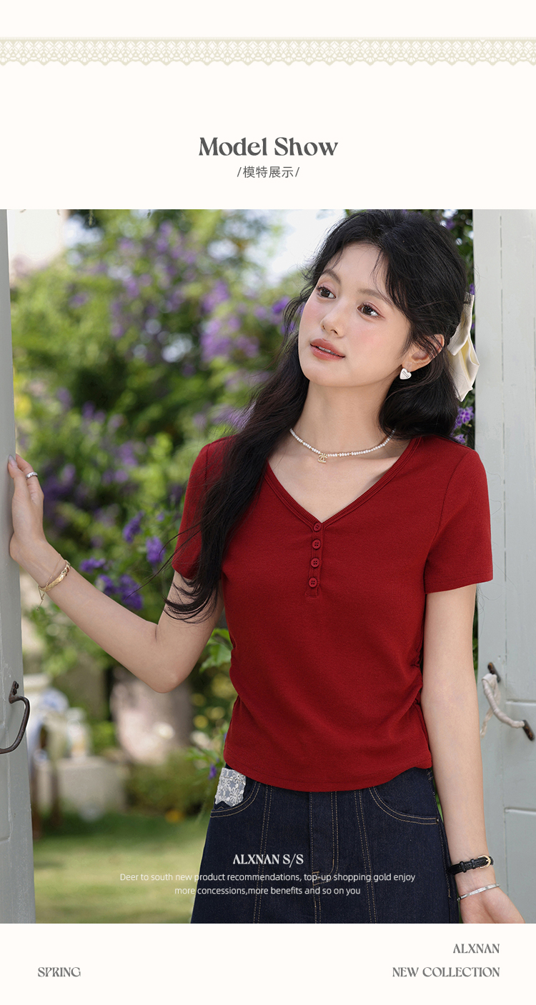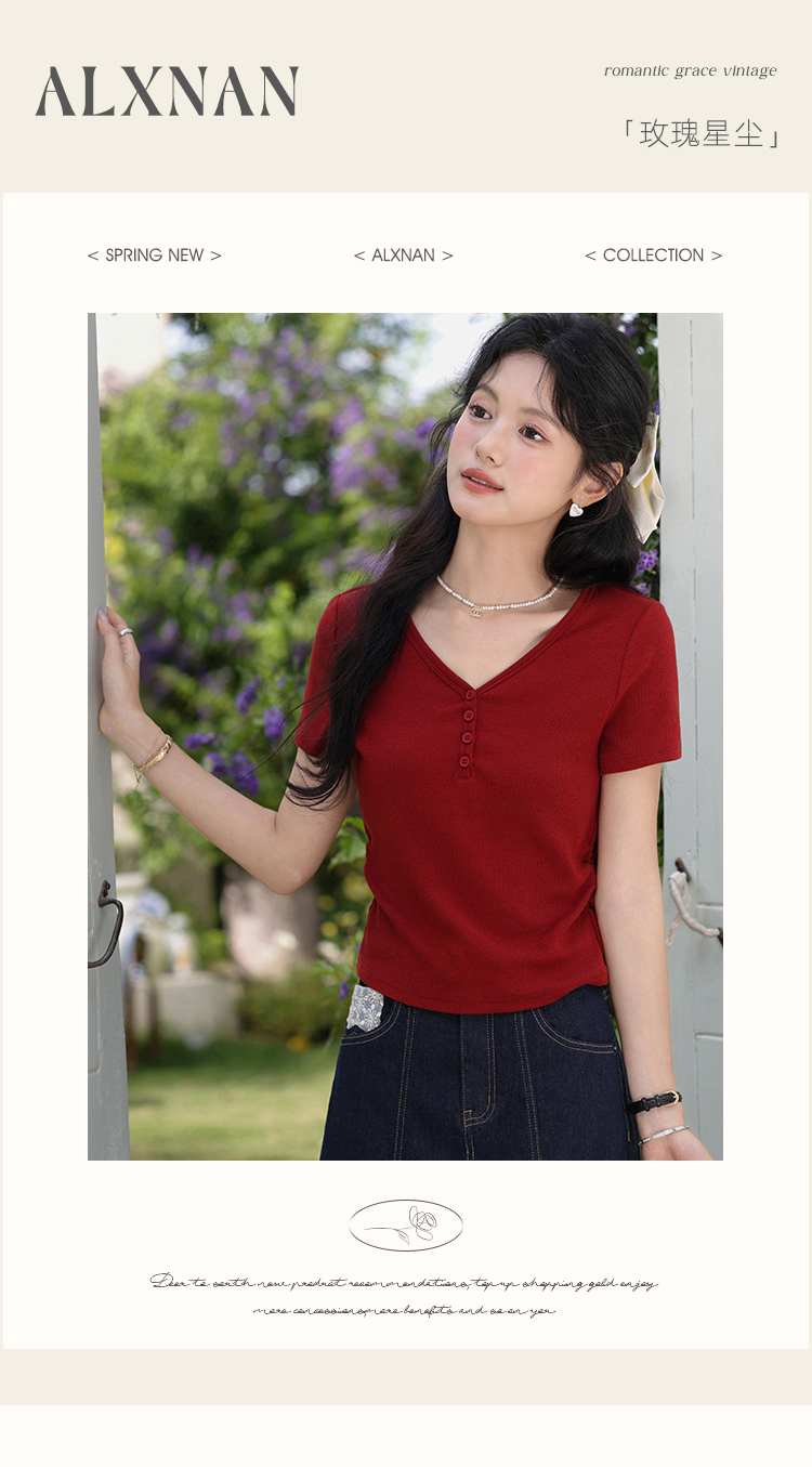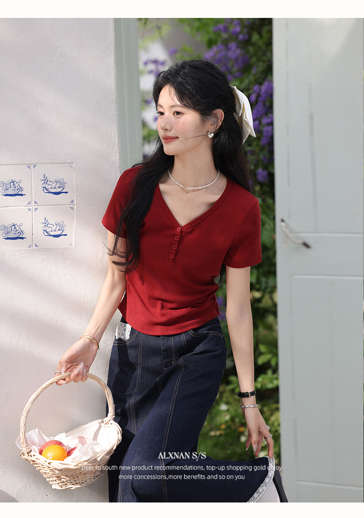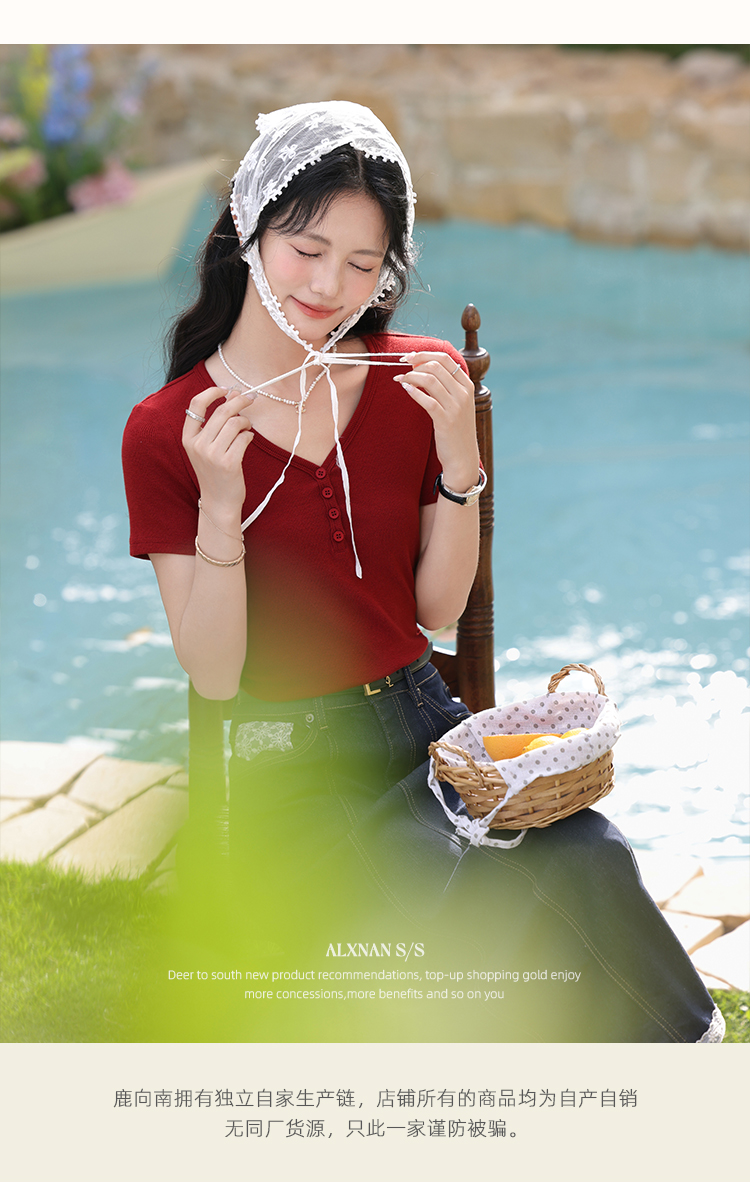 鹿向南「玫瑰星尘」气质优雅百搭修身显瘦红色V领短袖T恤上衣女夏