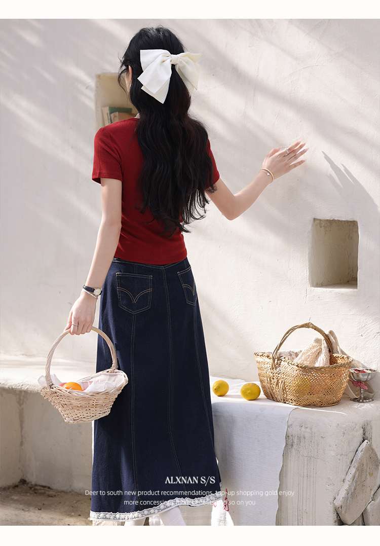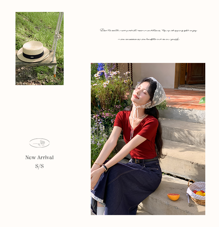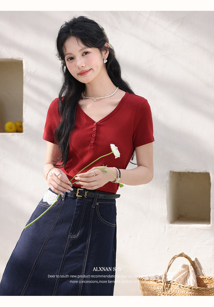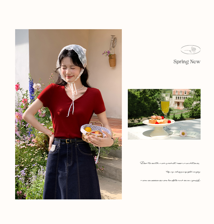 鹿向南「玫瑰星尘」气质优雅百搭修身显瘦红色V领短袖T恤上衣女夏