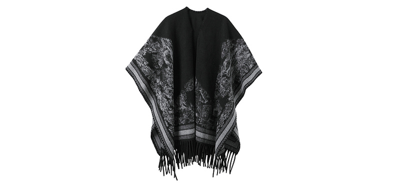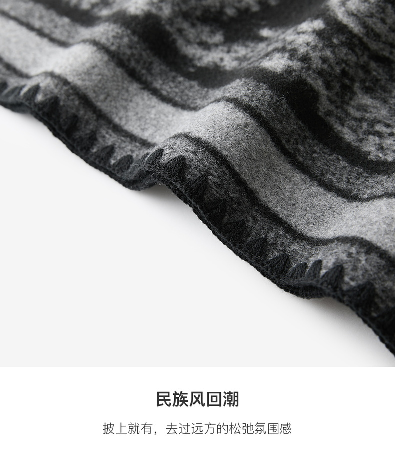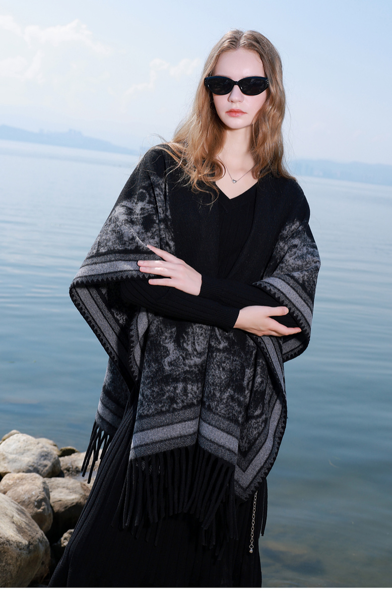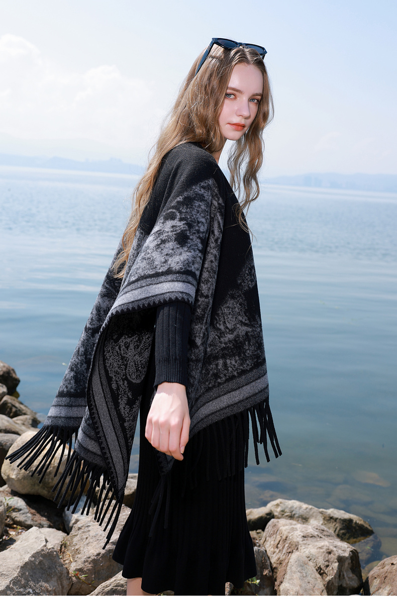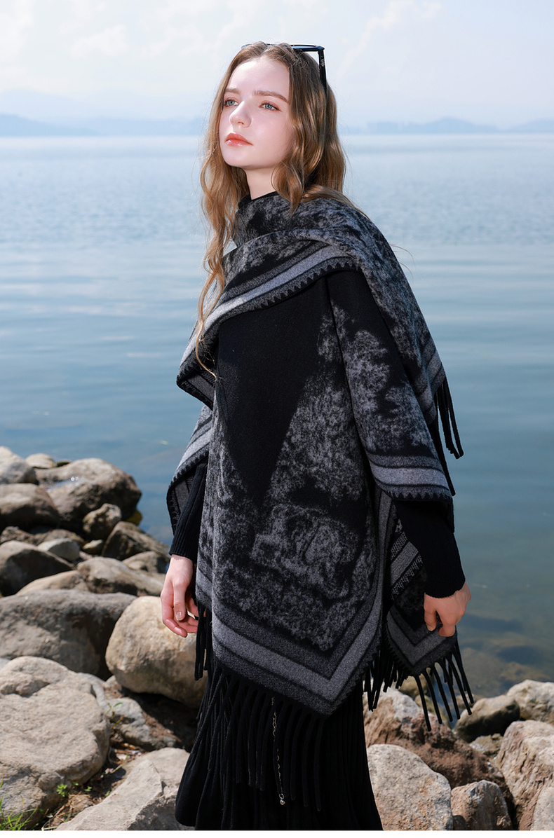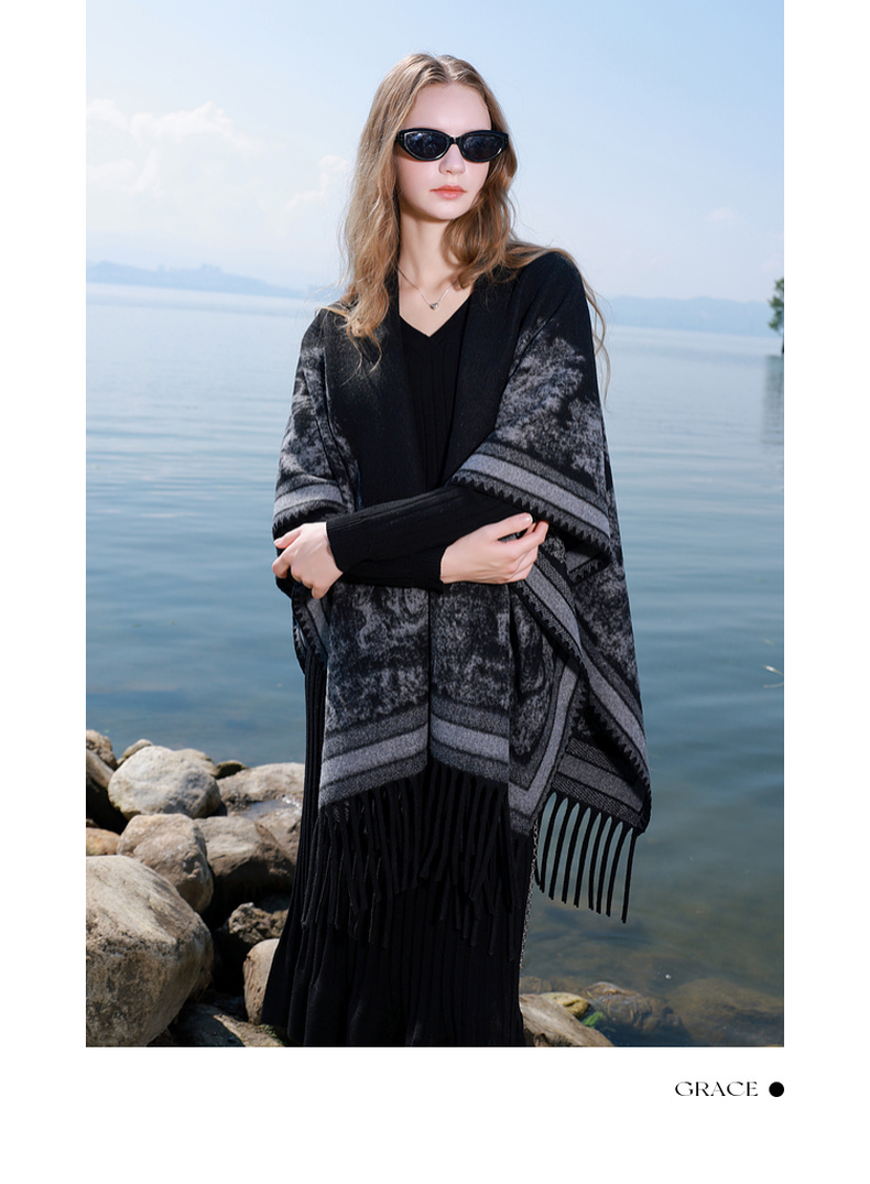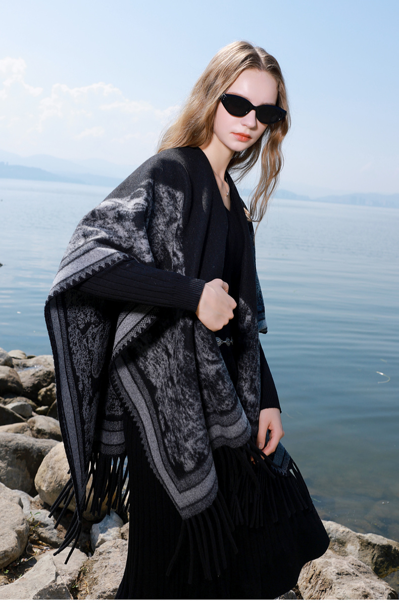 三彩2025新款黑色腰果花民族风时髦外搭披肩保暖流苏松弛出片百搭
