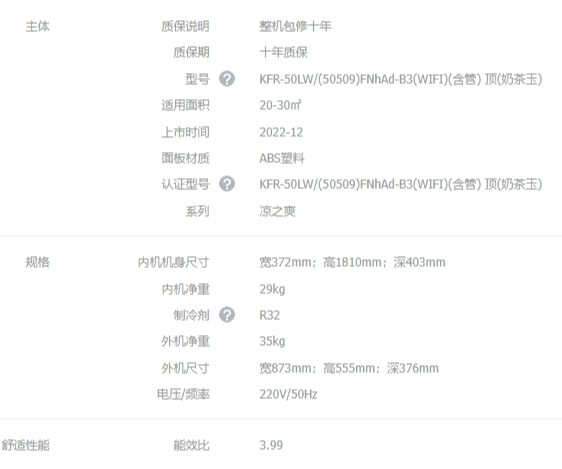 格力/空调/KFR-50LW/(50509)FNhAd-B3(WIFI)(含管)(奶茶玉)/ 凉之爽新能效 立柜式柜机空调 (奶茶玉色) 2匹 新三级