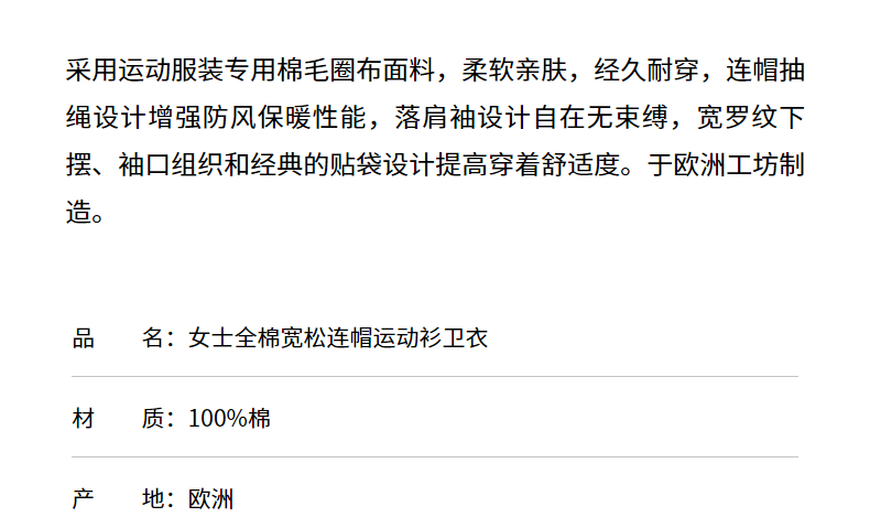 SUNSPEL女士经典款全棉宽松休闲连帽卫衣运动衫