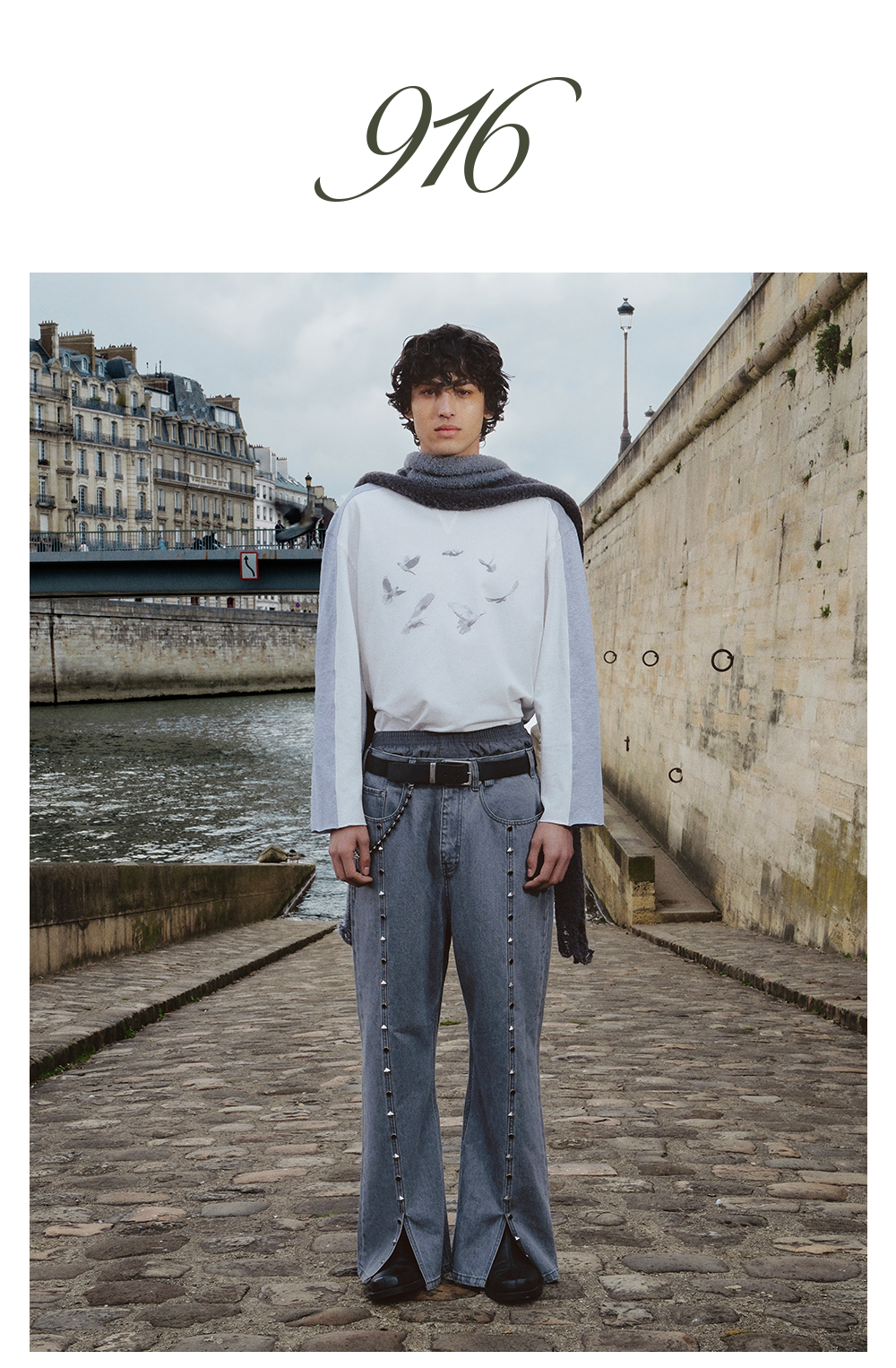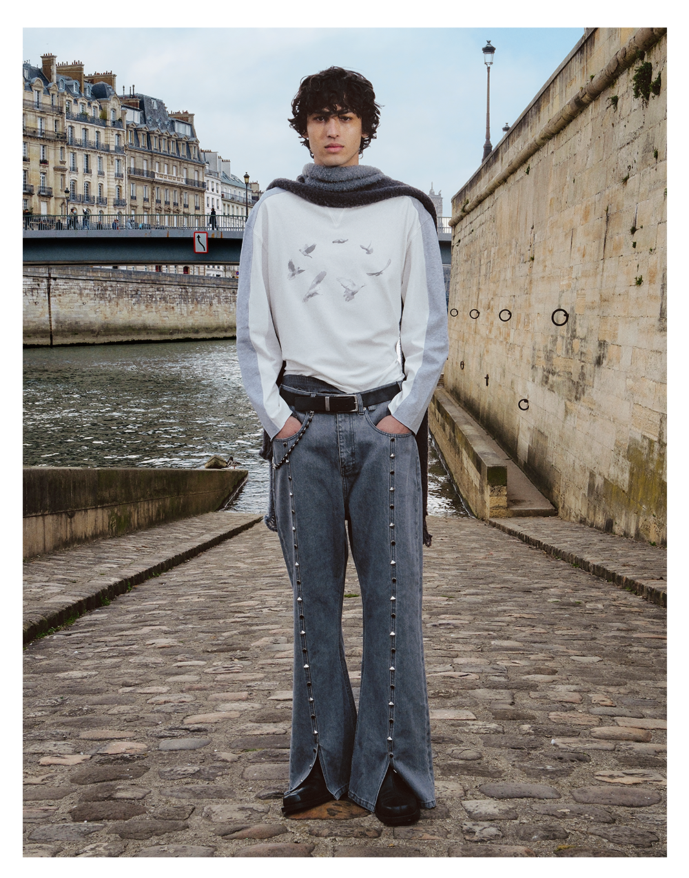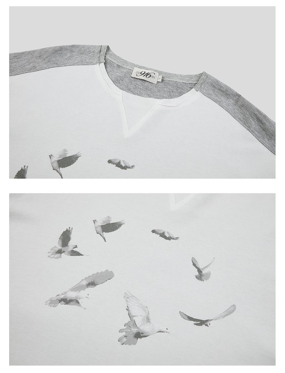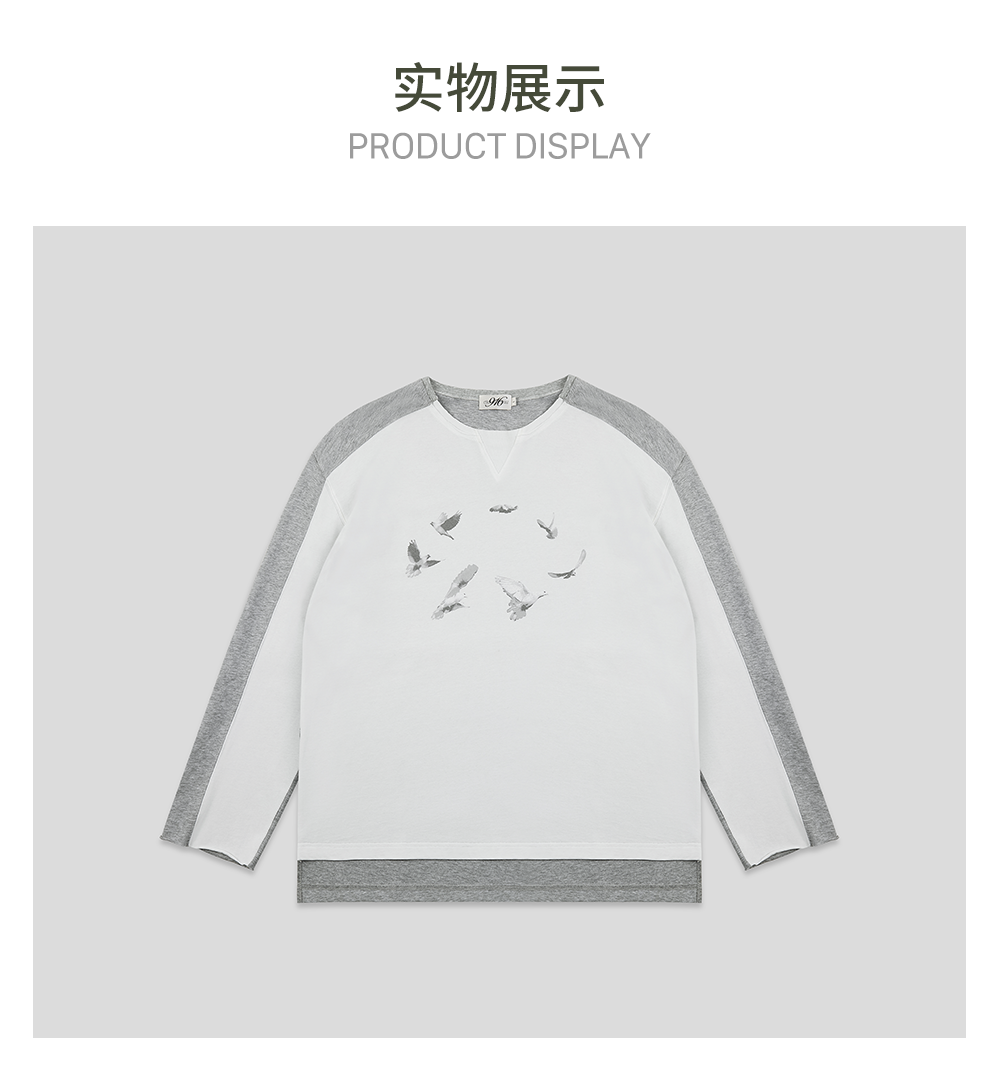 GOODBAI 916 白鸽环绕印花撞色拼接圆领长袖T恤