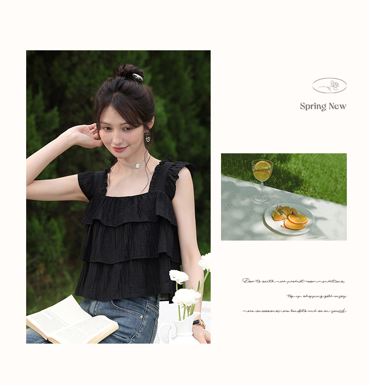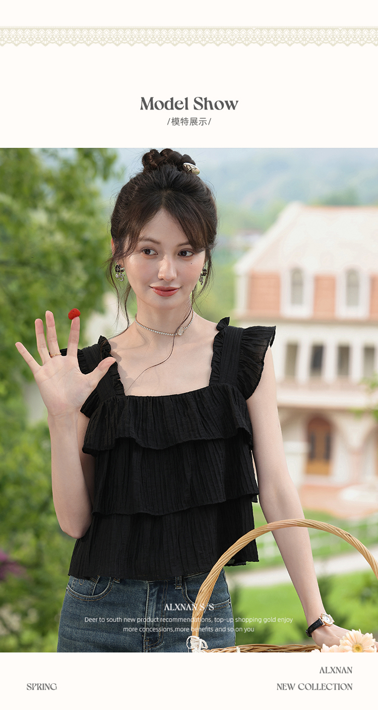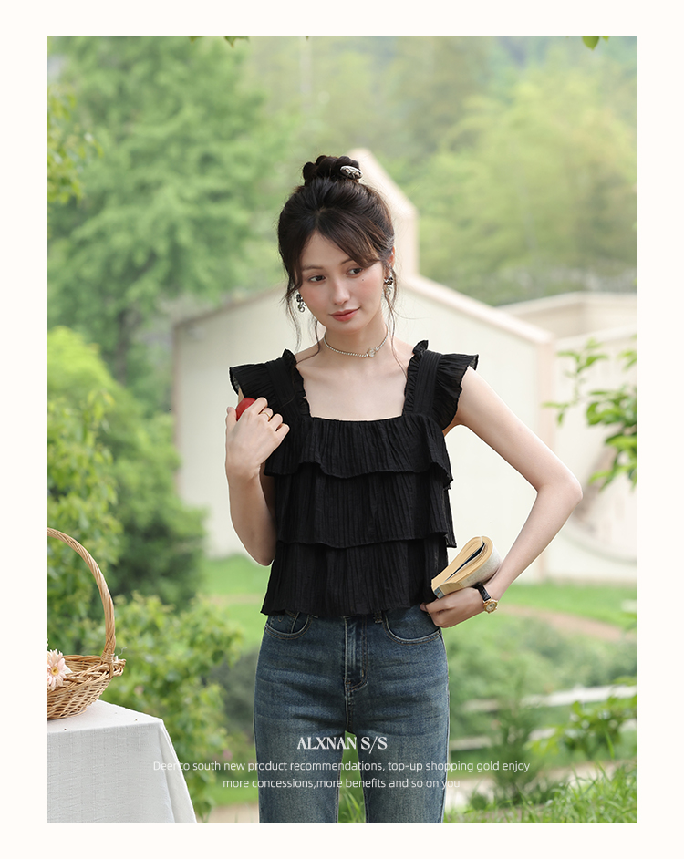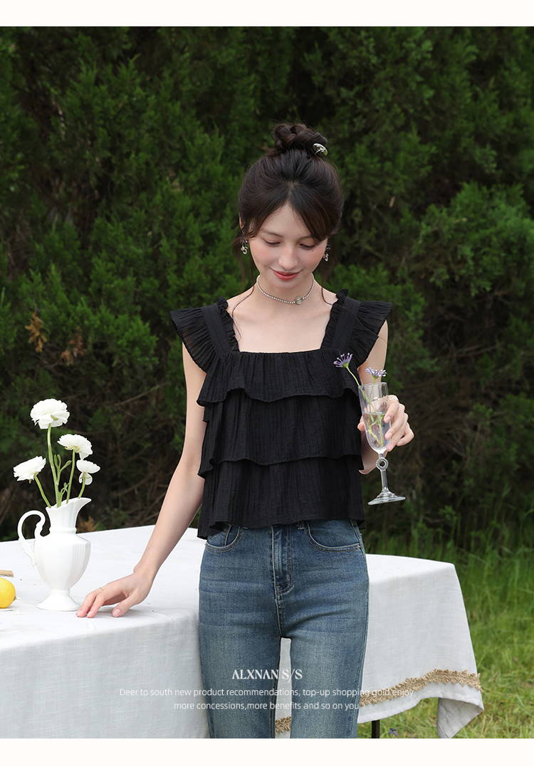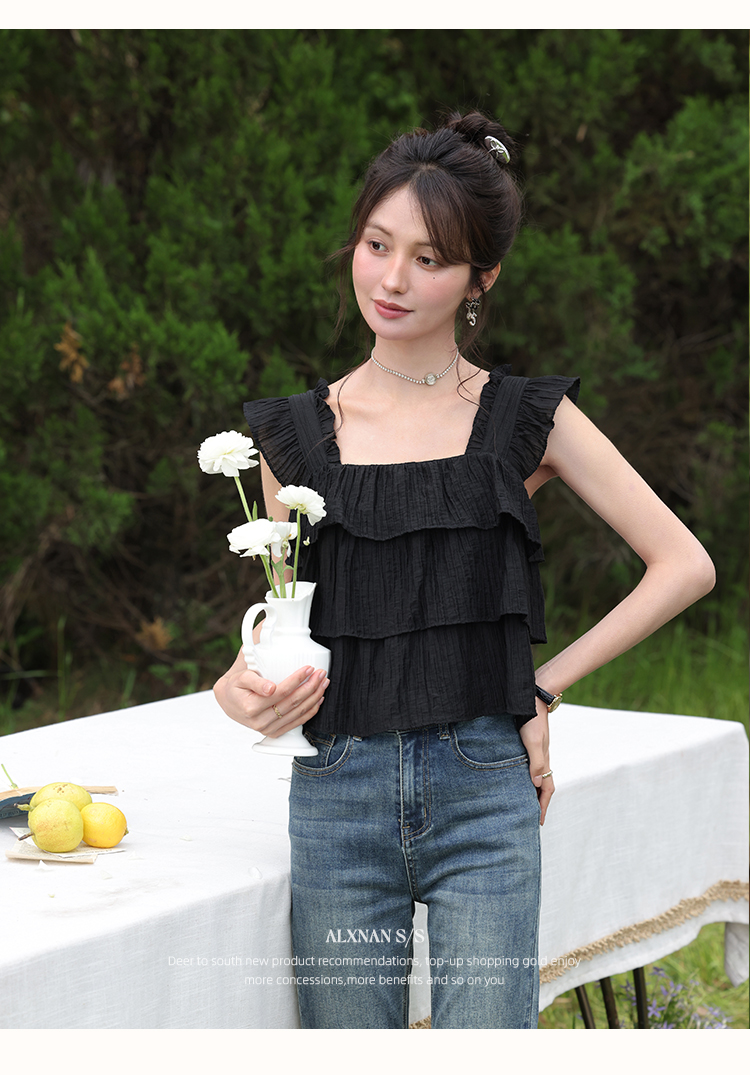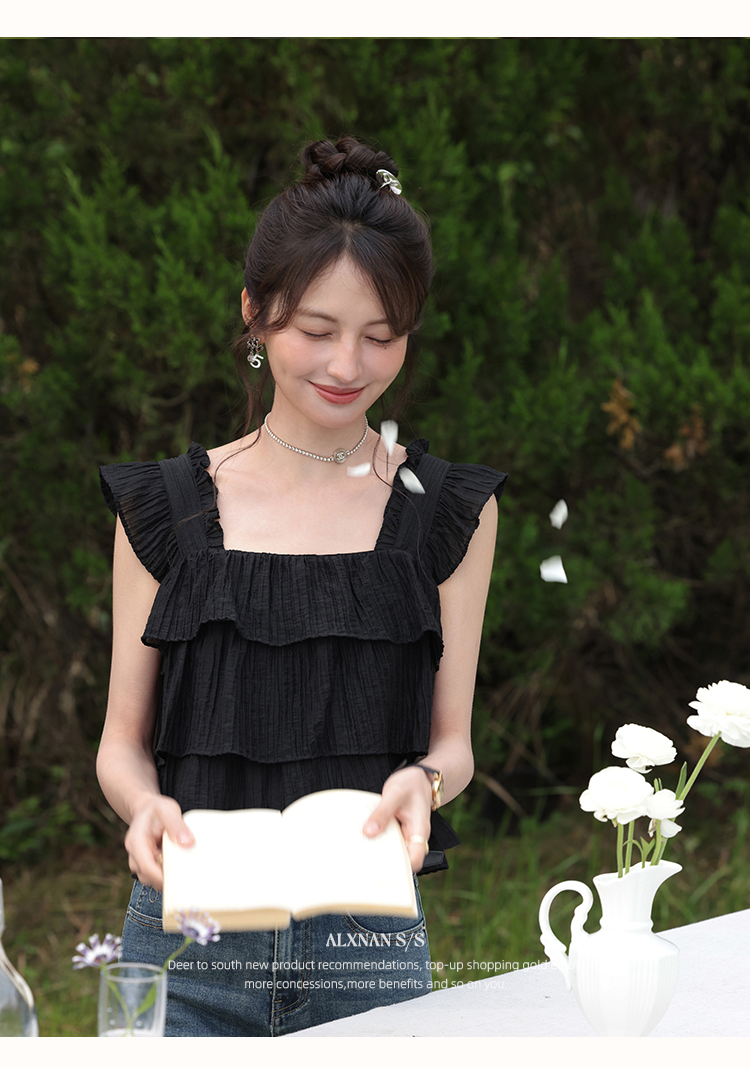 【6折秒杀】鹿向南「温婉气质」黑色方领背心夏新款时尚宽松百搭荷叶边上衣女L55637