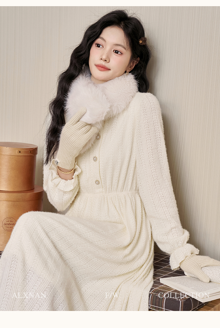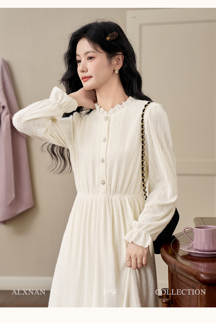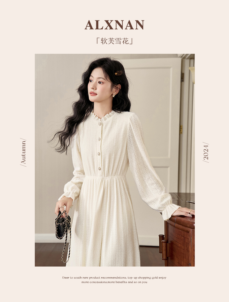 鹿向南「软芙雪花」法式气质连衣裙女装秋冬2025新款圆领长袖长裙