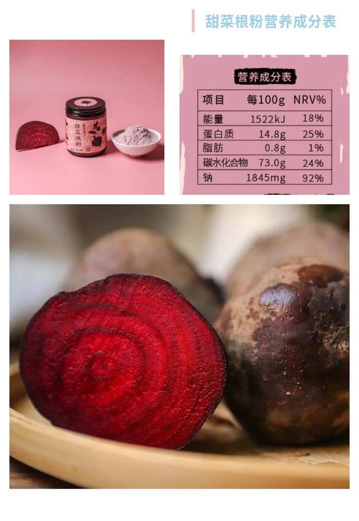【超级食物辅助】甜菜根粉可以搭配奇亚籽、洋车前子壳、蓝莓粉等超级食物一同食用,也可加水共同放入料理机搅拌,做成混合蔬果汁。