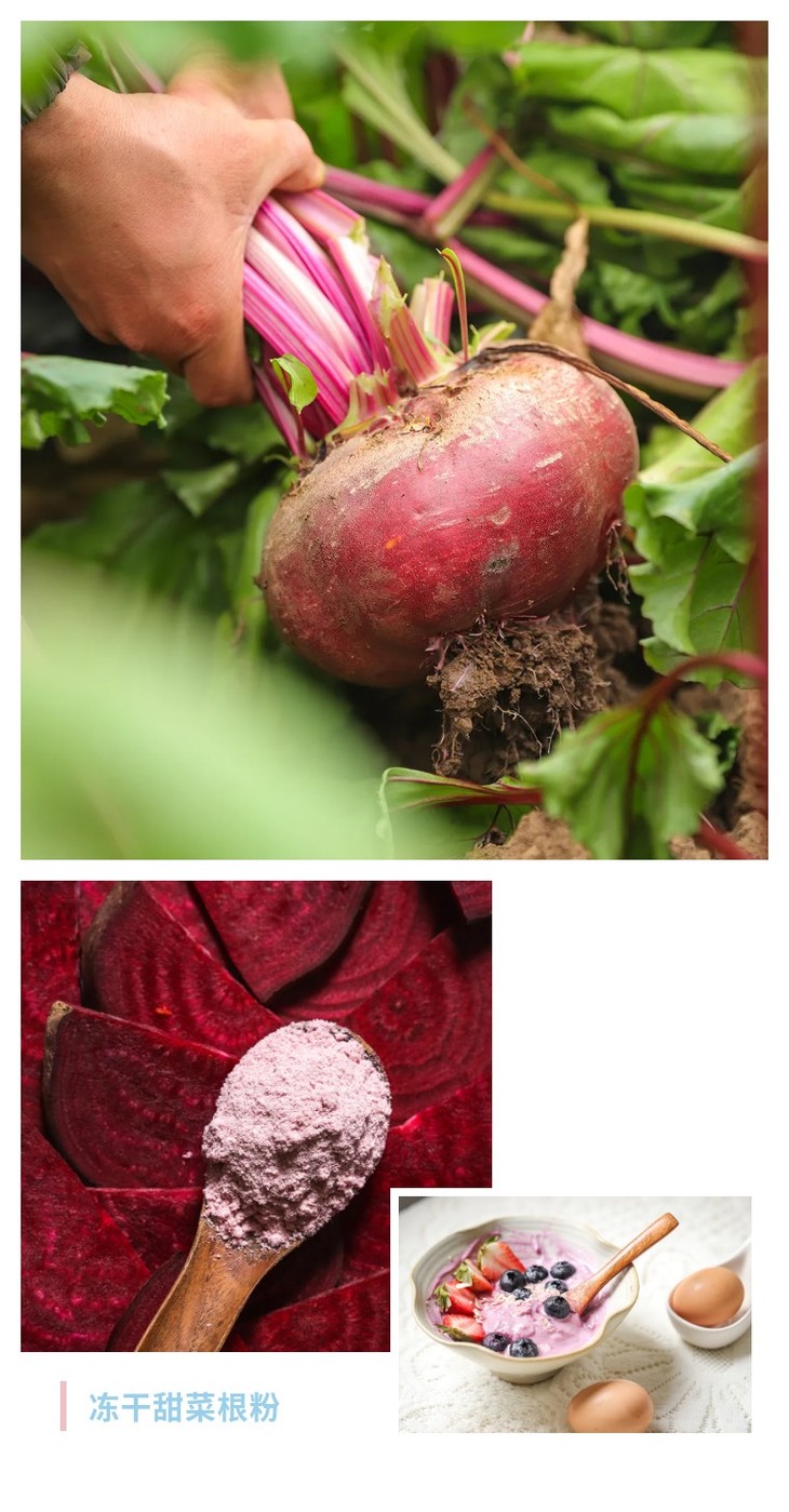 在真空环境下,零下30°的超低温度里保持24小时,甜菜跟内的水分全部升华,保留甜菜碱、维生素、铁等微量元素。不添加任何物质,100%的甜菜根,10斤新鲜甜菜根出1斤甜菜根冻干粉。