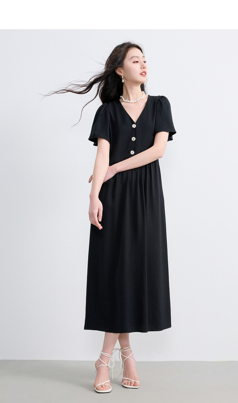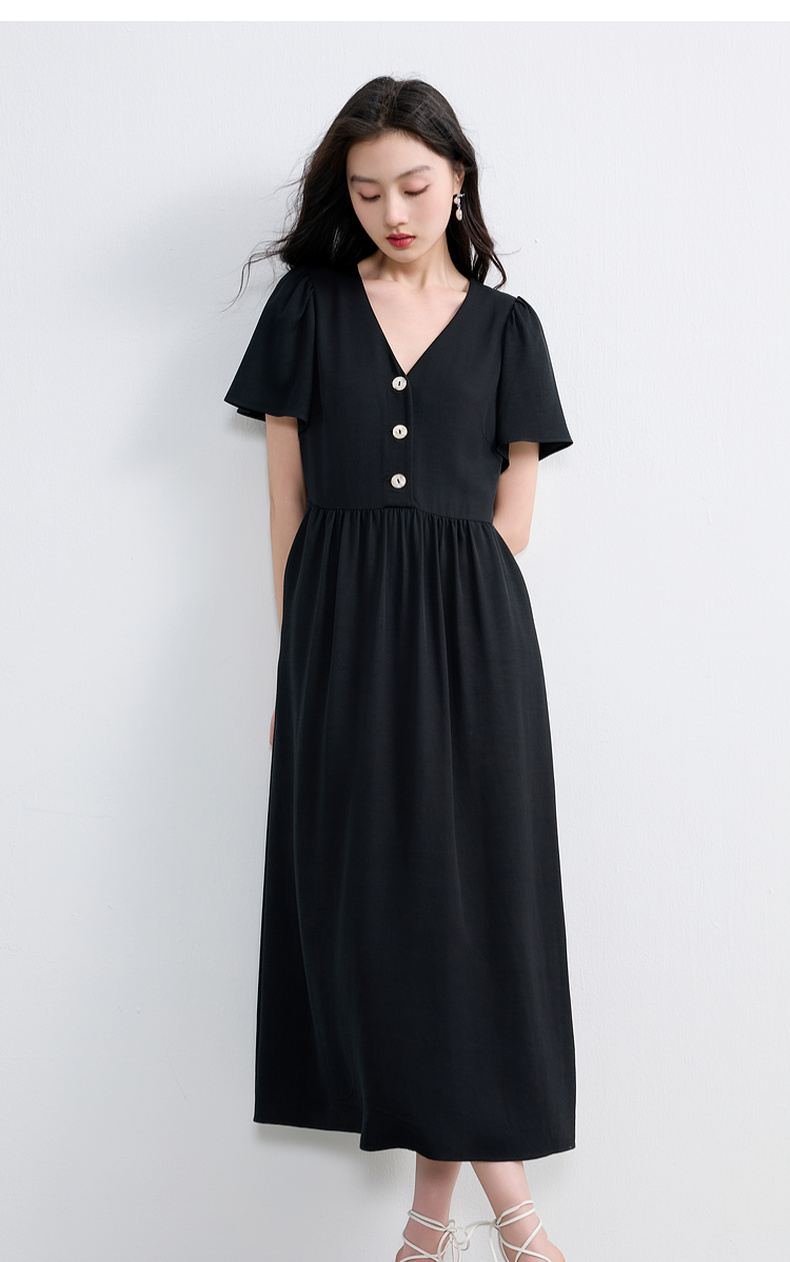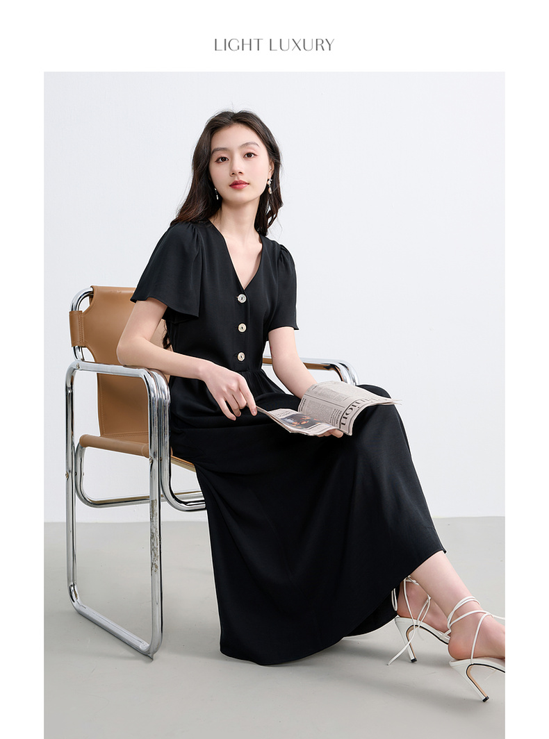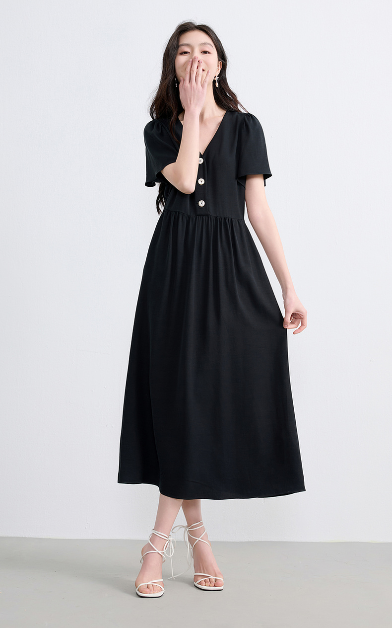 【莱赛尔+亚麻】三彩2025夏季新款连衣裙V领收腰A字裙长裙优雅气质S