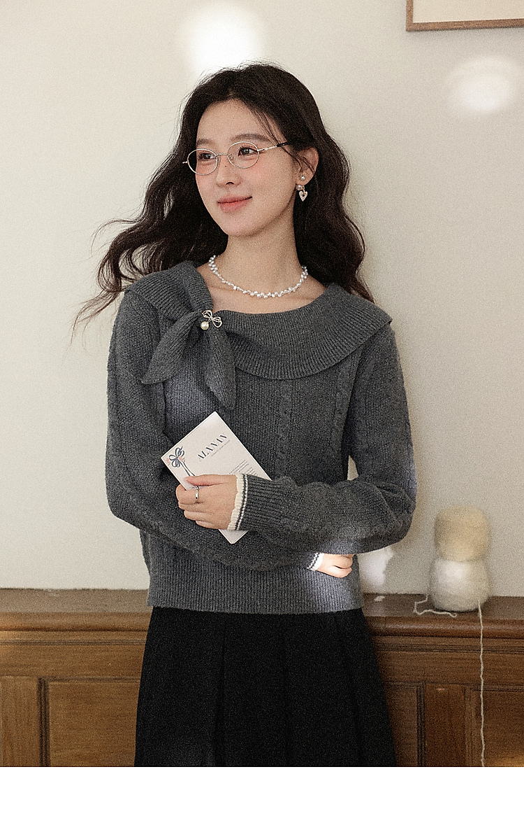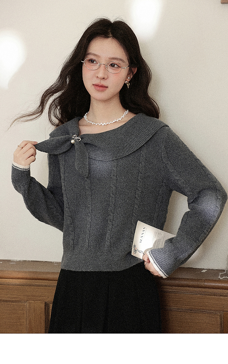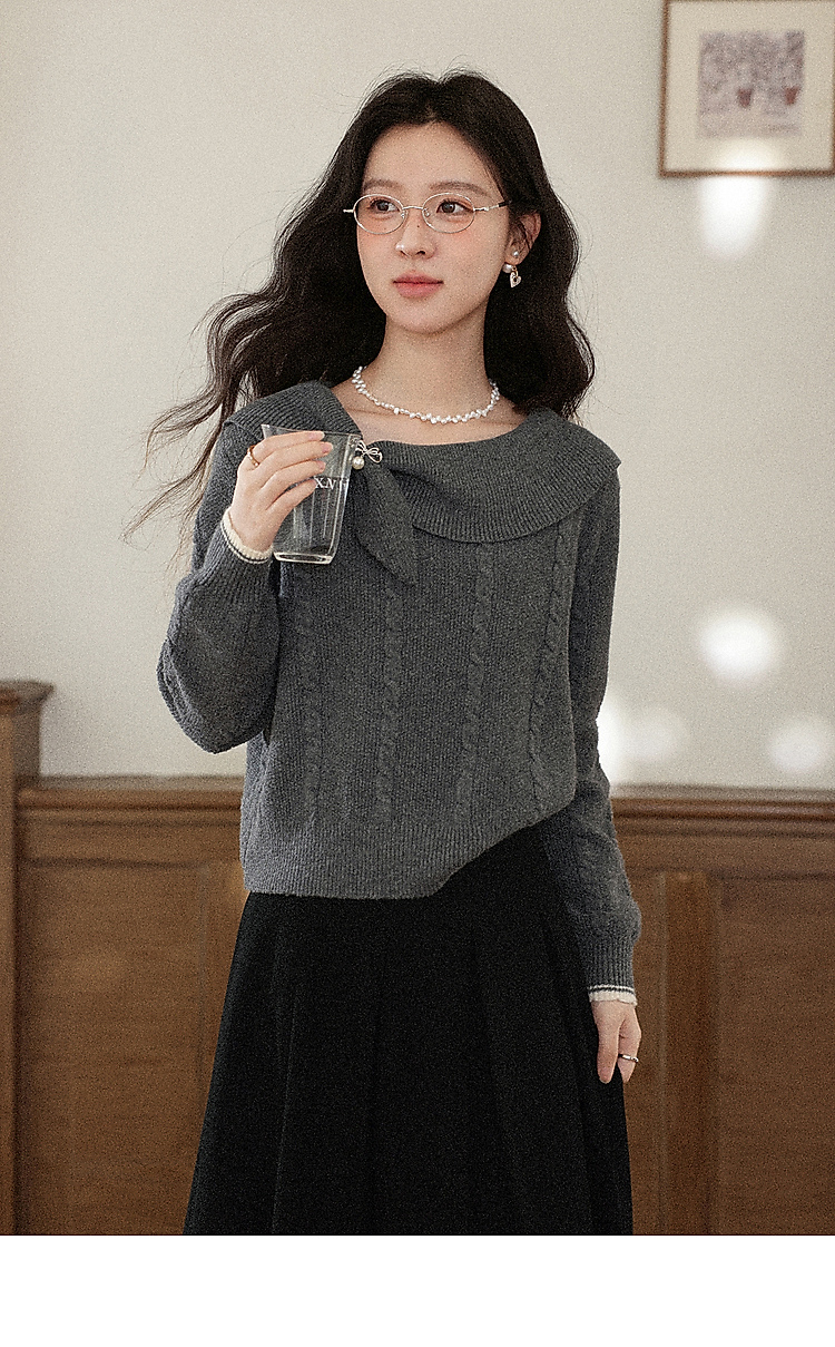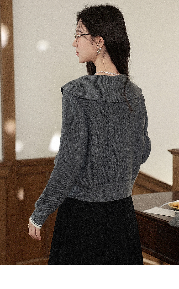 鹿向南「轻雅加州」不规则荷叶领长袖针织毛衣女秋深灰色短款上衣
