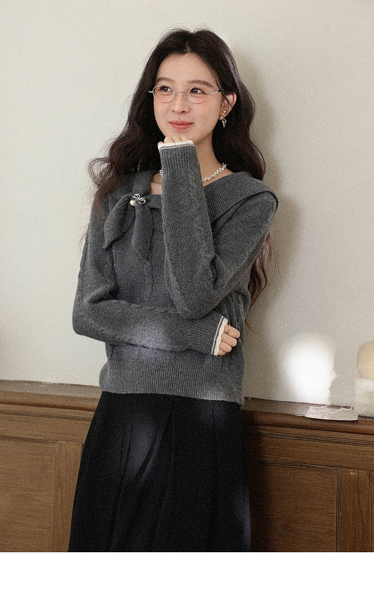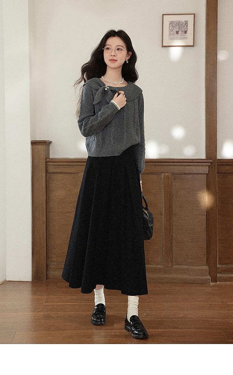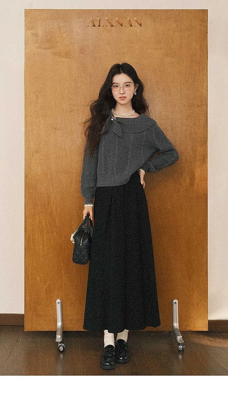 鹿向南「轻雅加州」不规则荷叶领长袖针织毛衣女秋深灰色短款上衣
