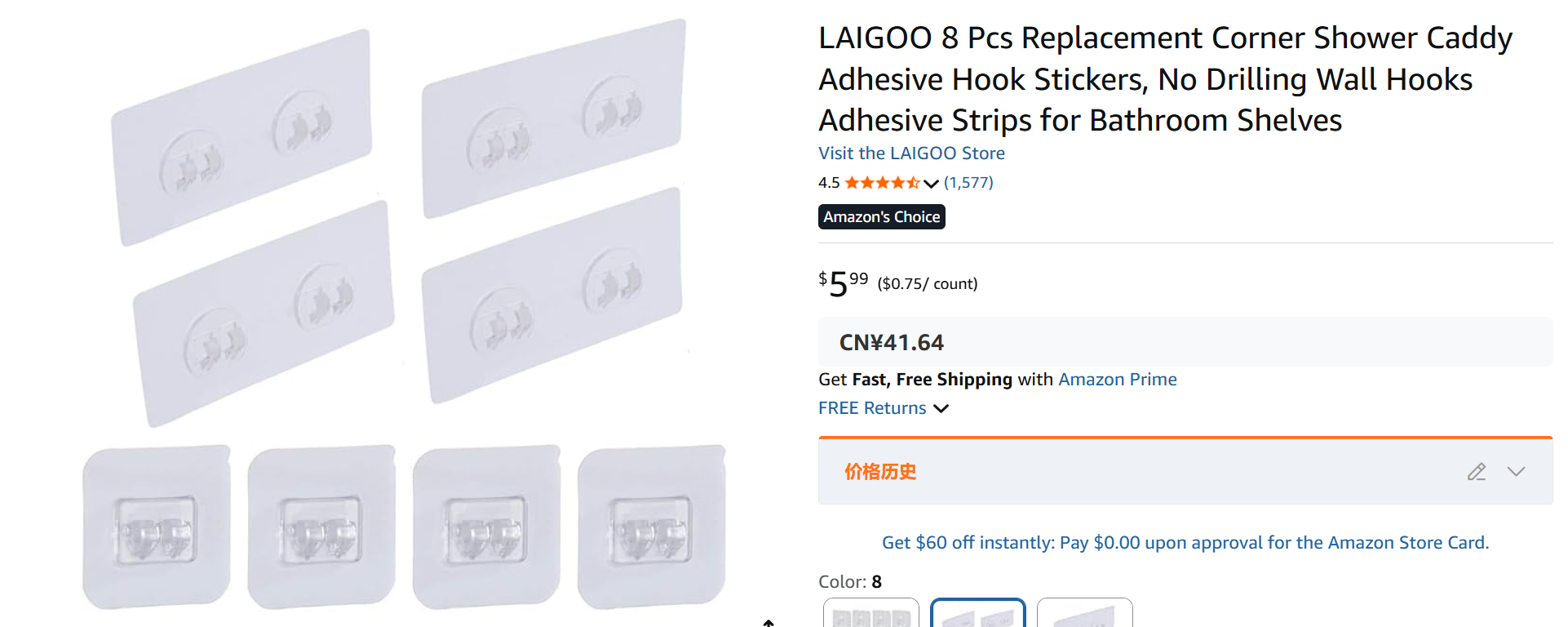 【8个装】美国 LAIGOO 免打孔墙面挂钩 浴室置物架粘贴挂钩