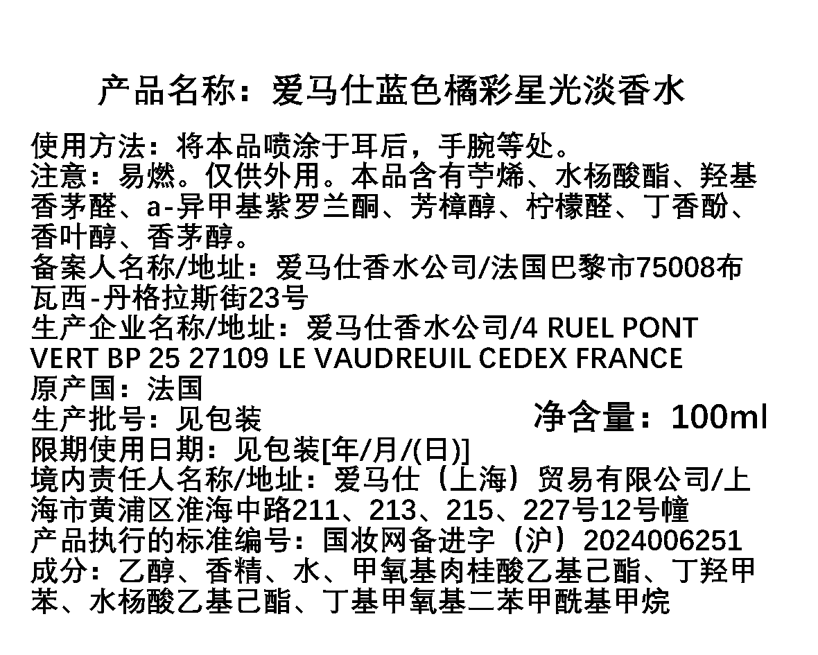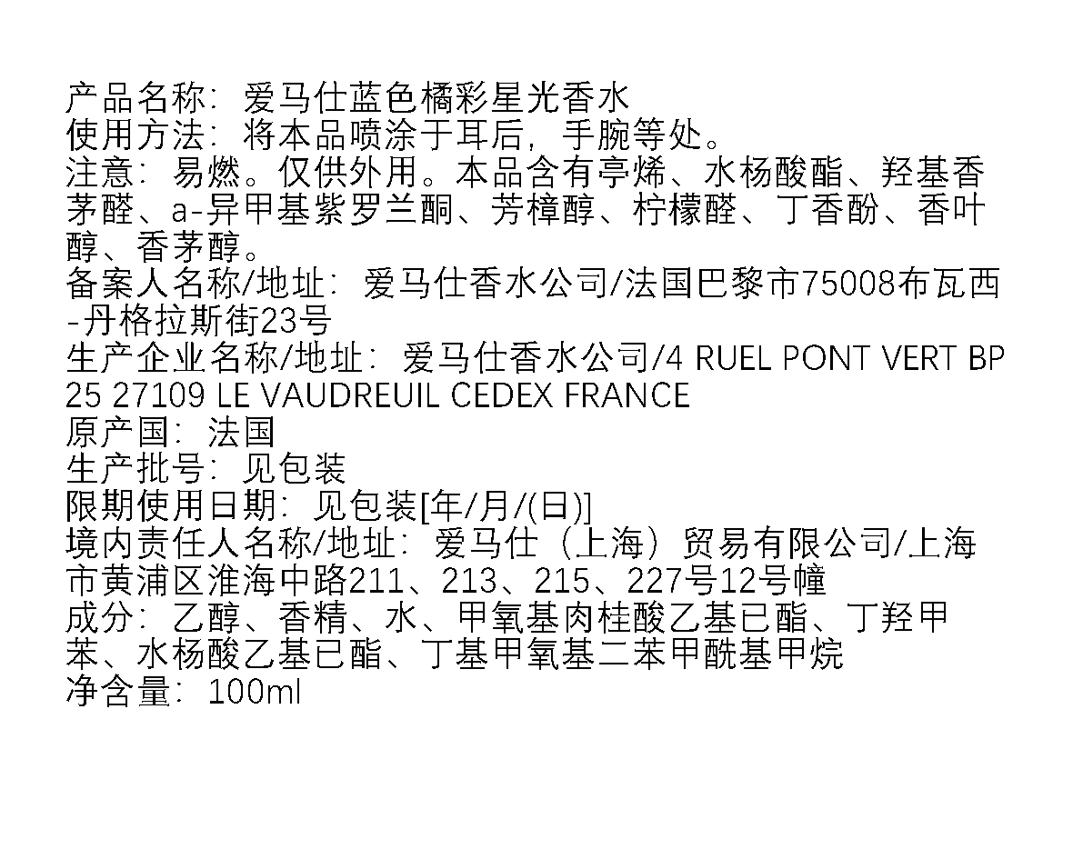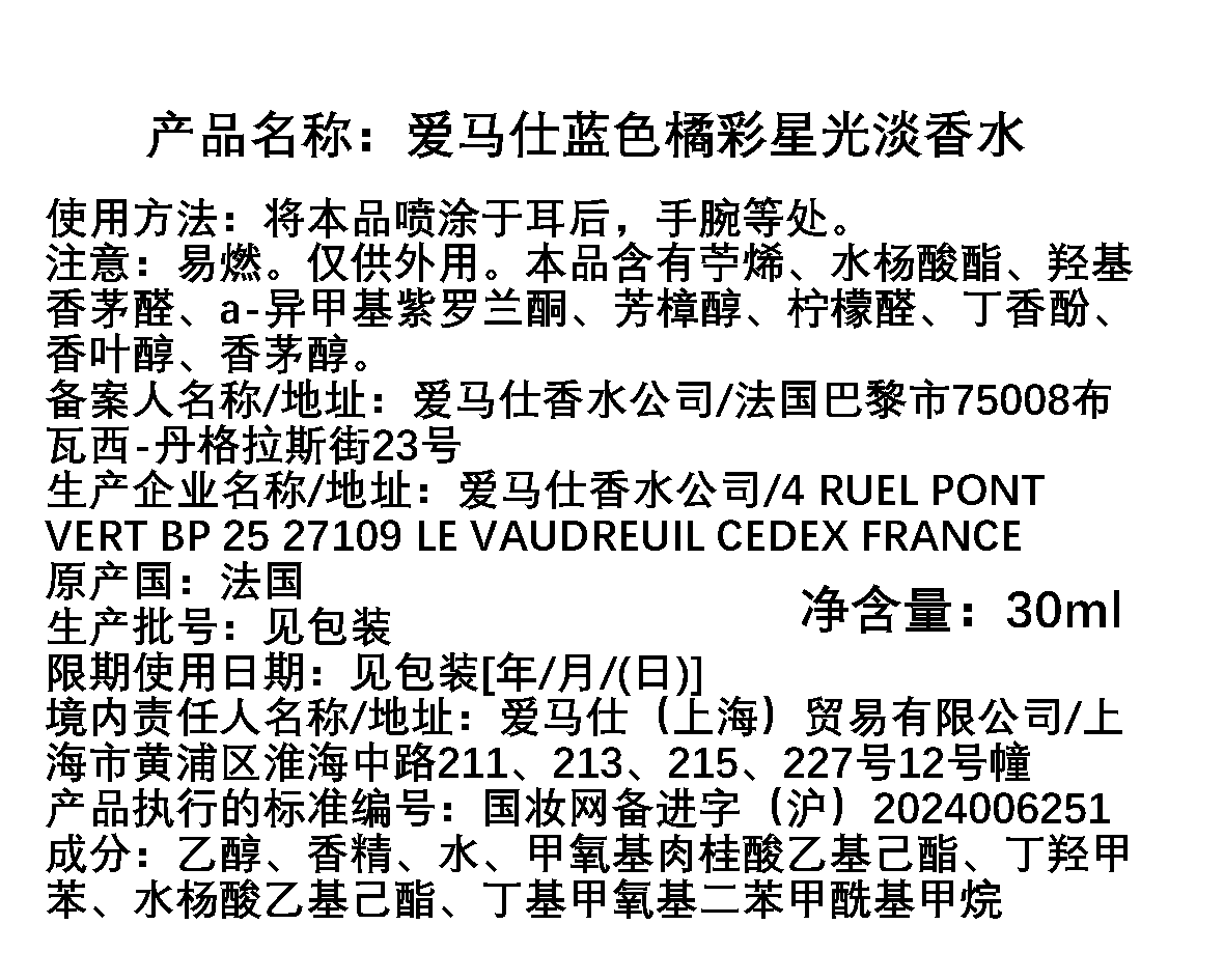 Hermes爱马仕 蓝色橘彩星光/蓝彩星光香水