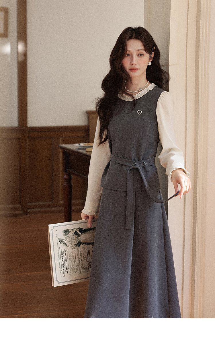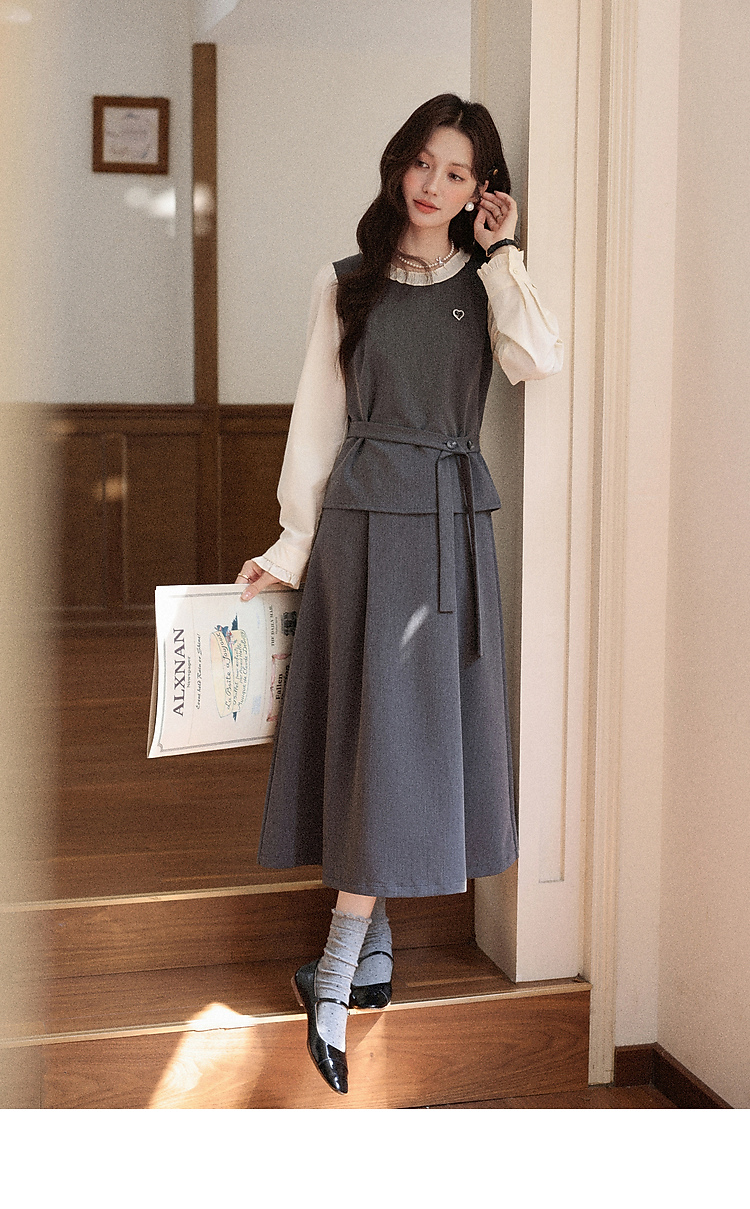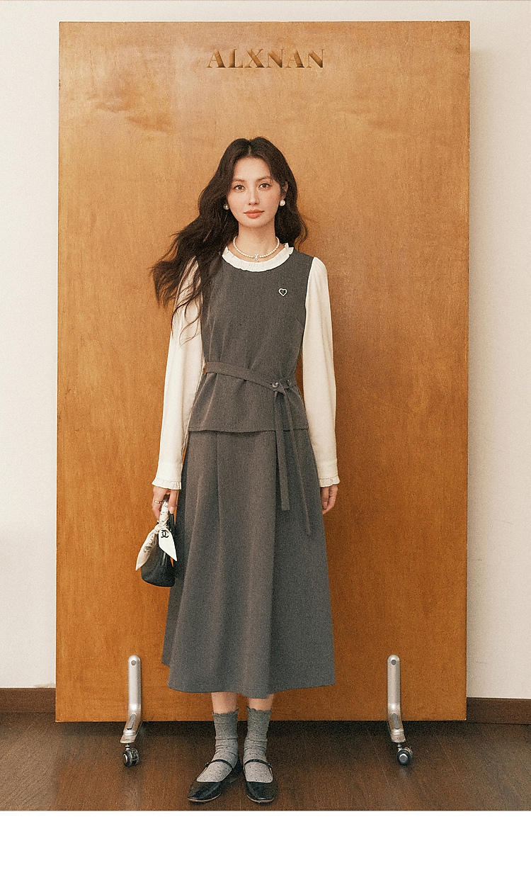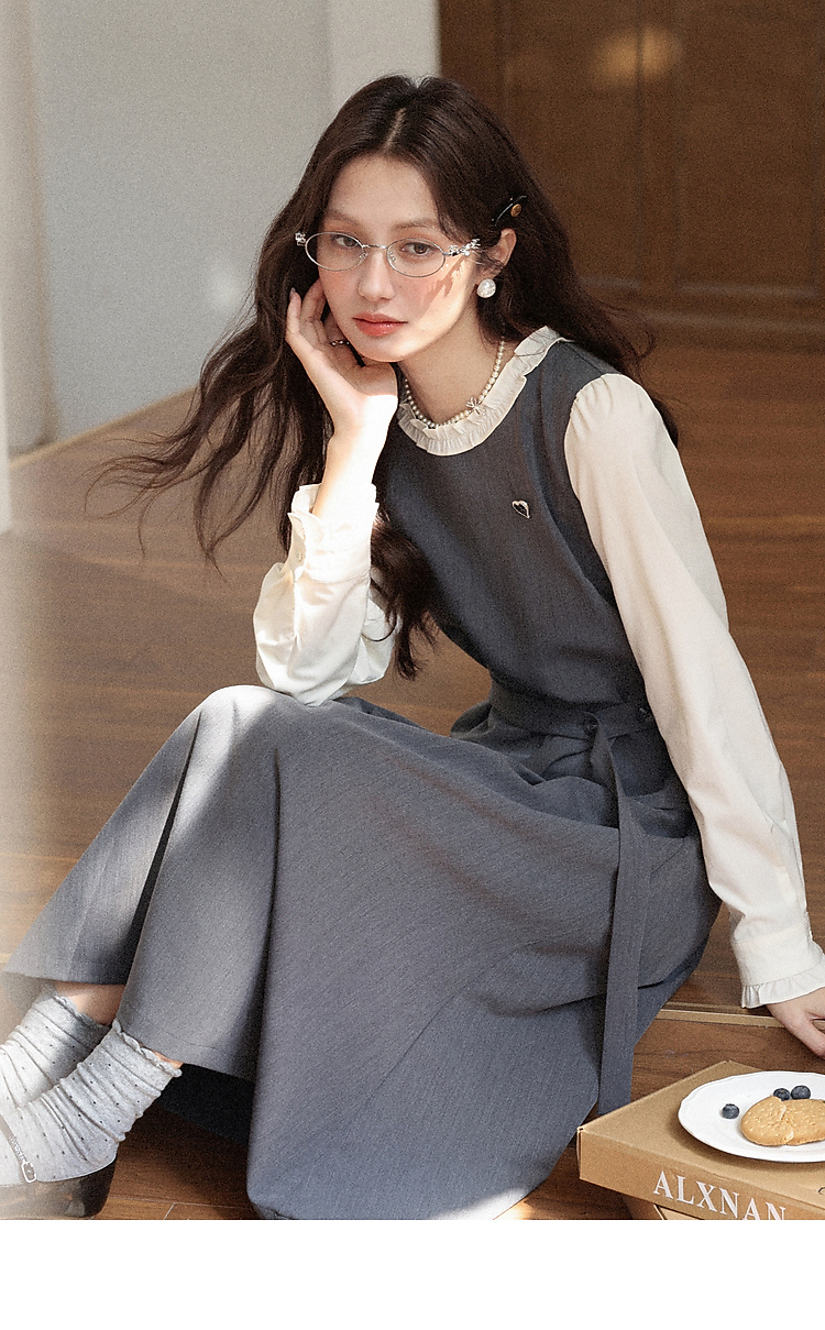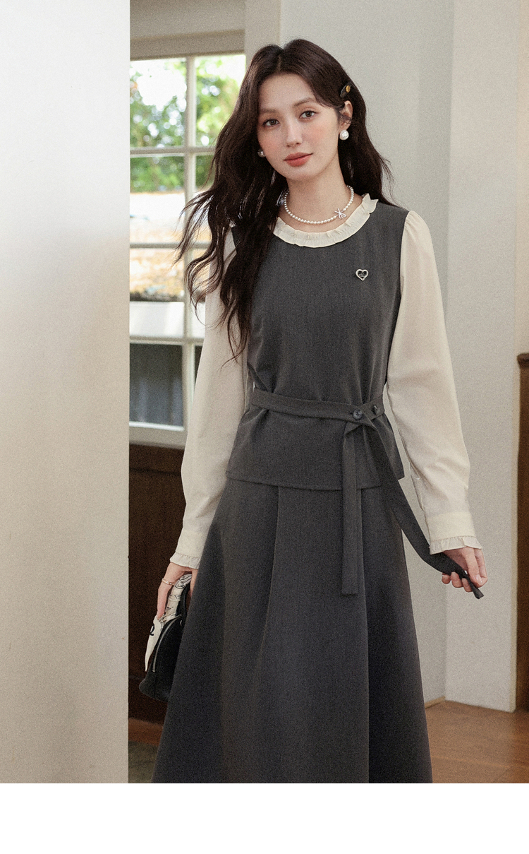 鹿向南「巴黎作家」假两件灰色长袖连衣裙女秋新款设计感法式长裙