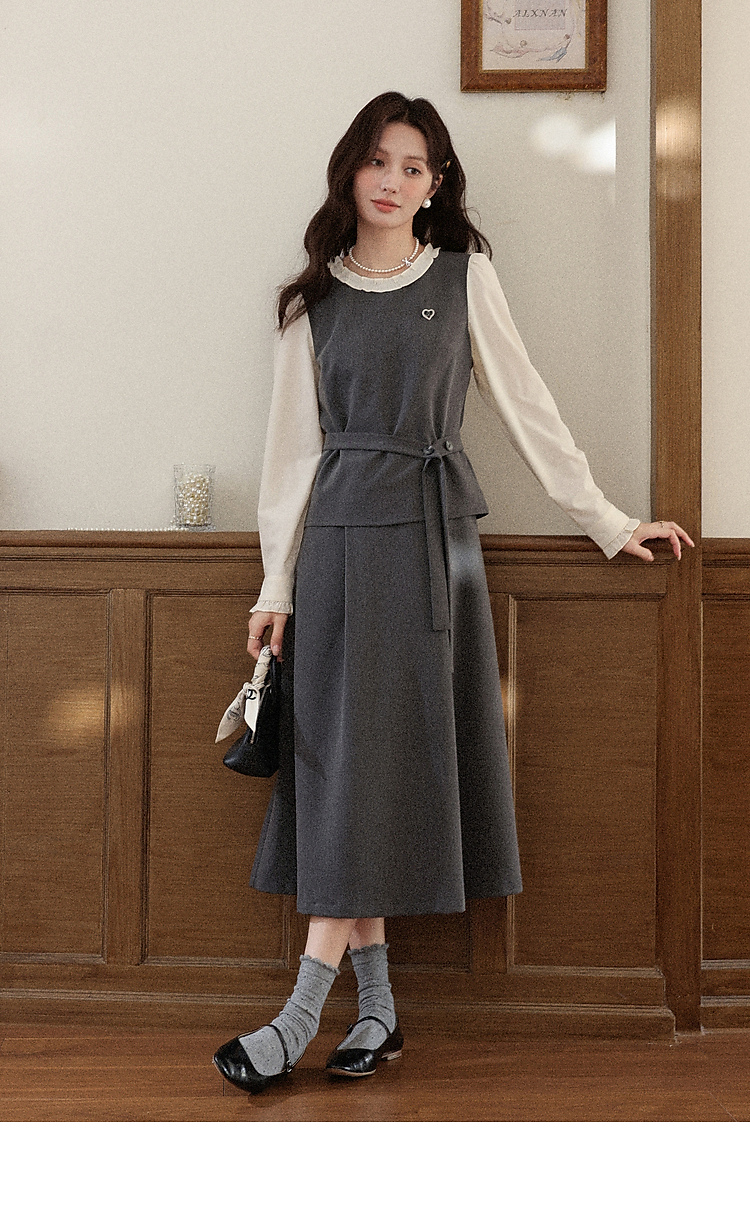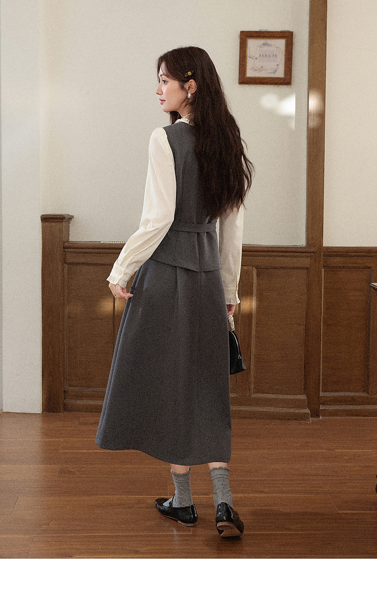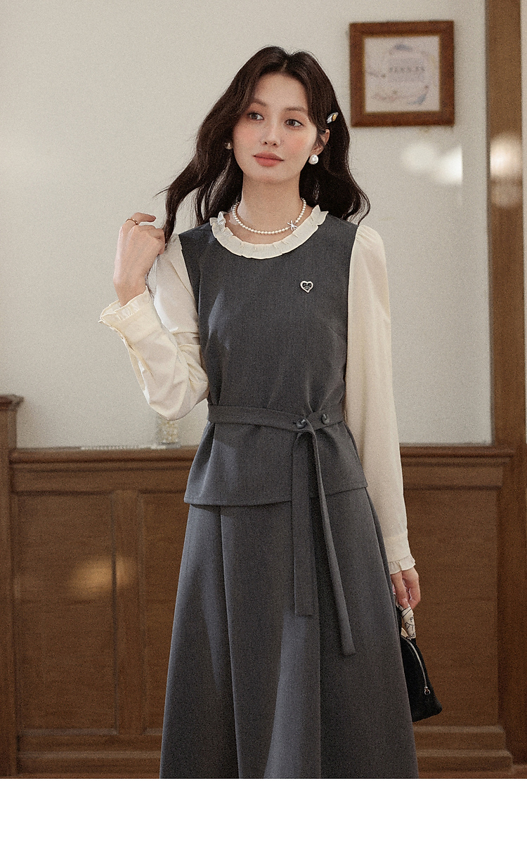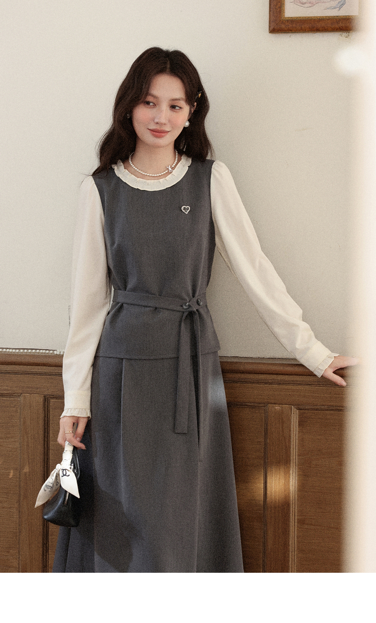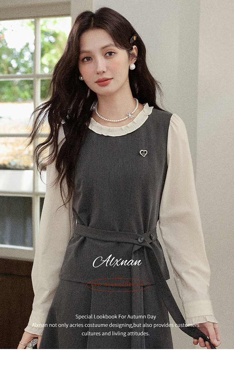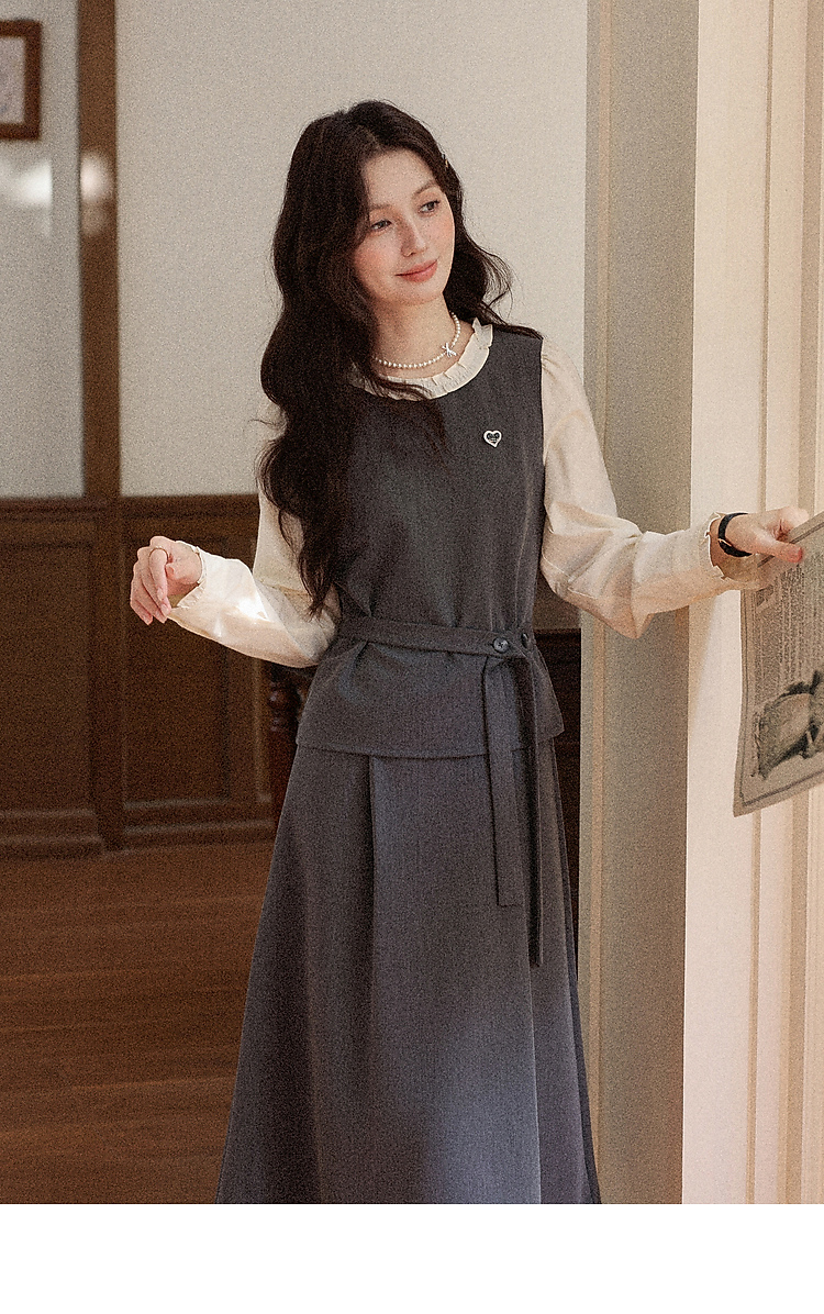 鹿向南「巴黎作家」假两件灰色长袖连衣裙女秋新款设计感法式长裙