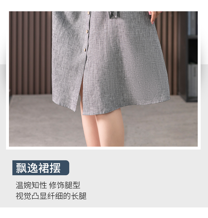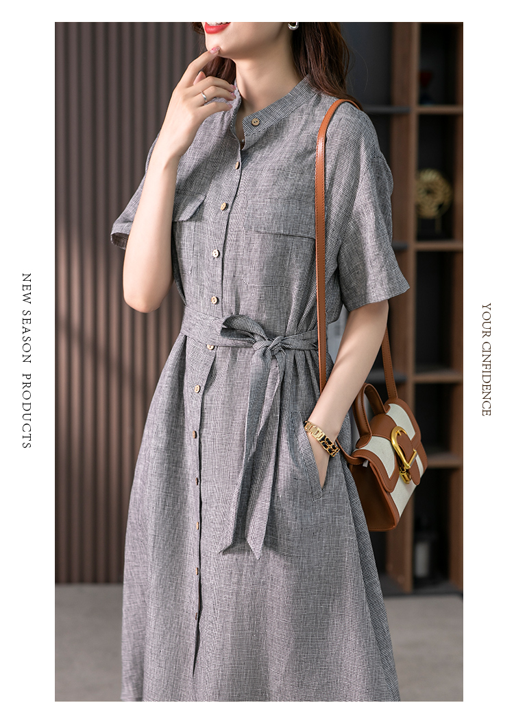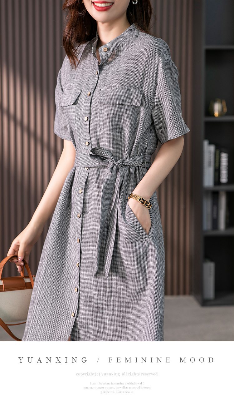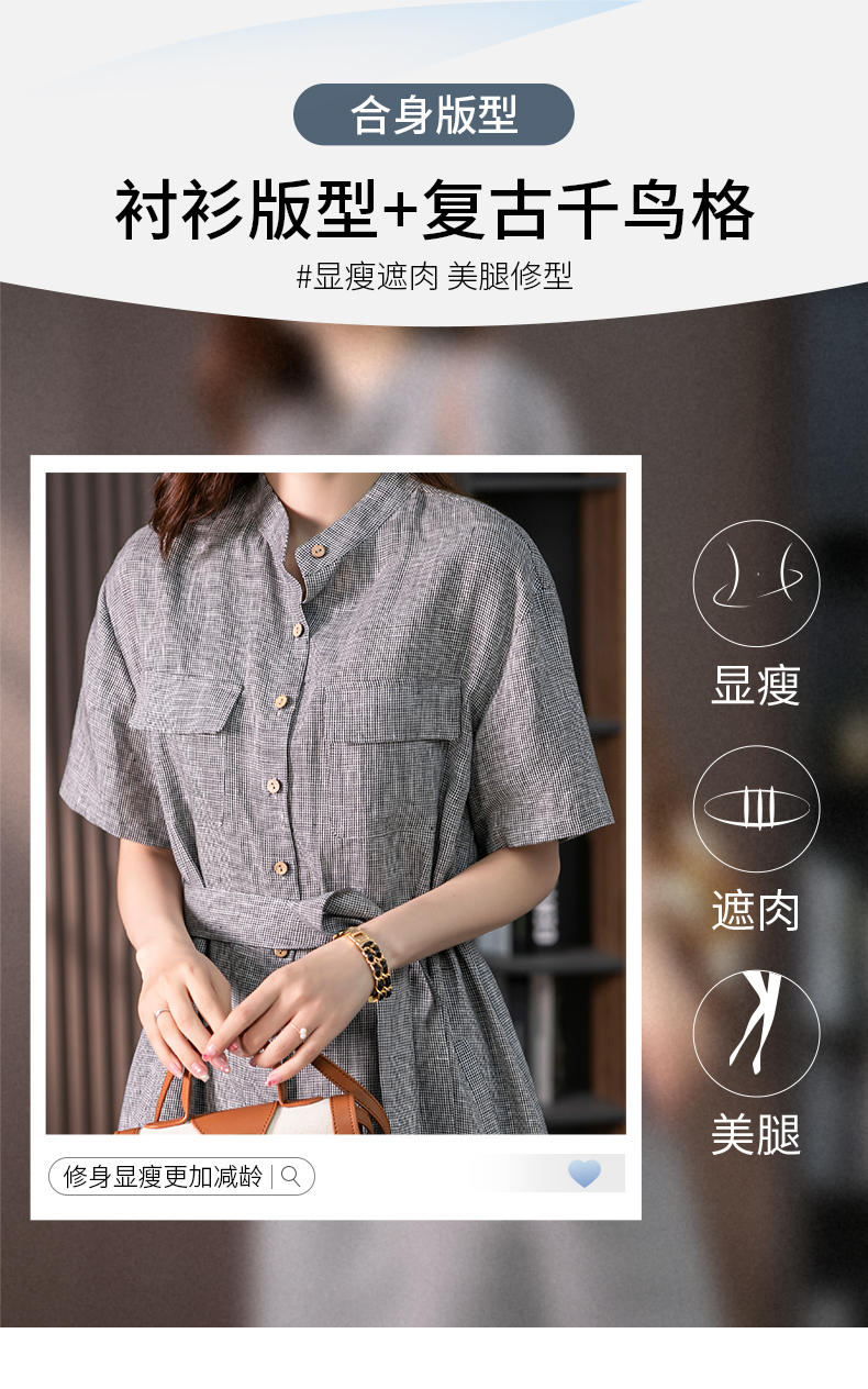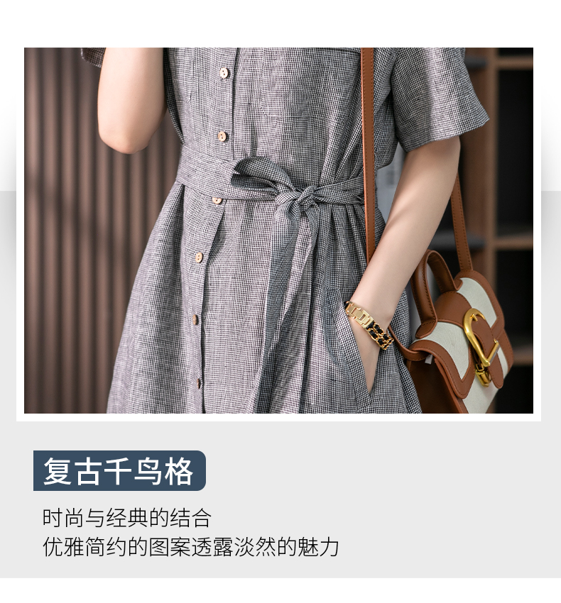 85794原形复古千鸟格亚麻衬衫裙女2024春夏季新款韩版设计感小众连衣裙