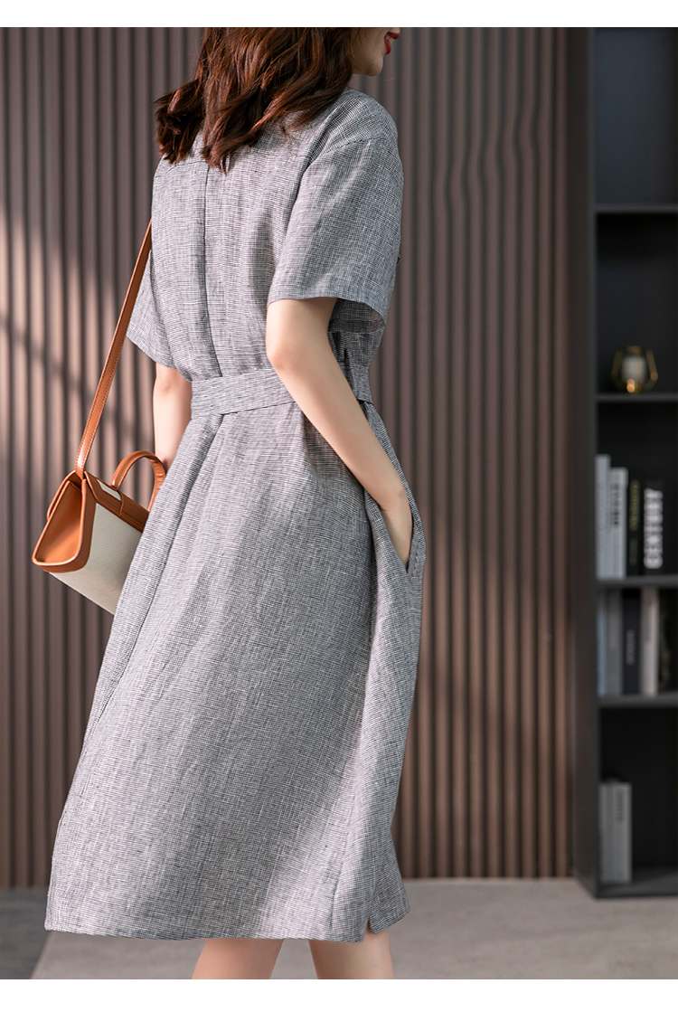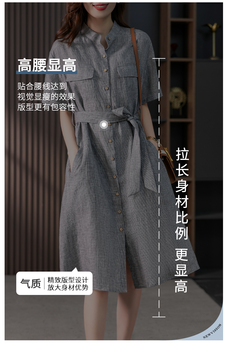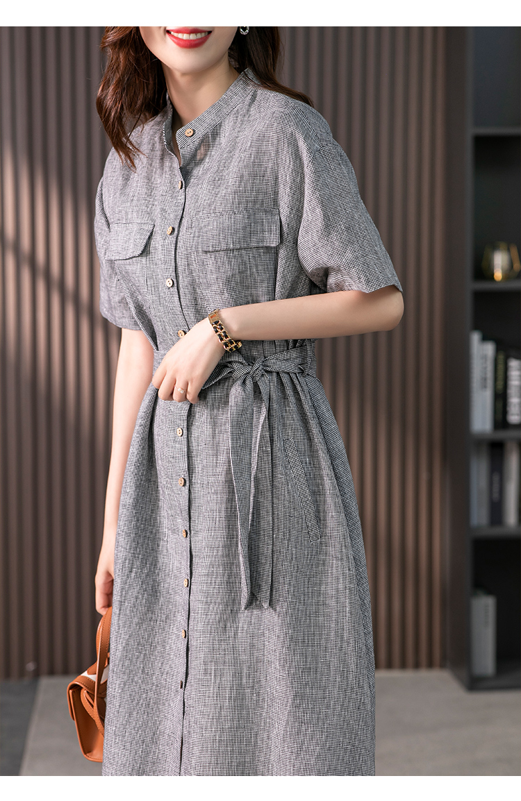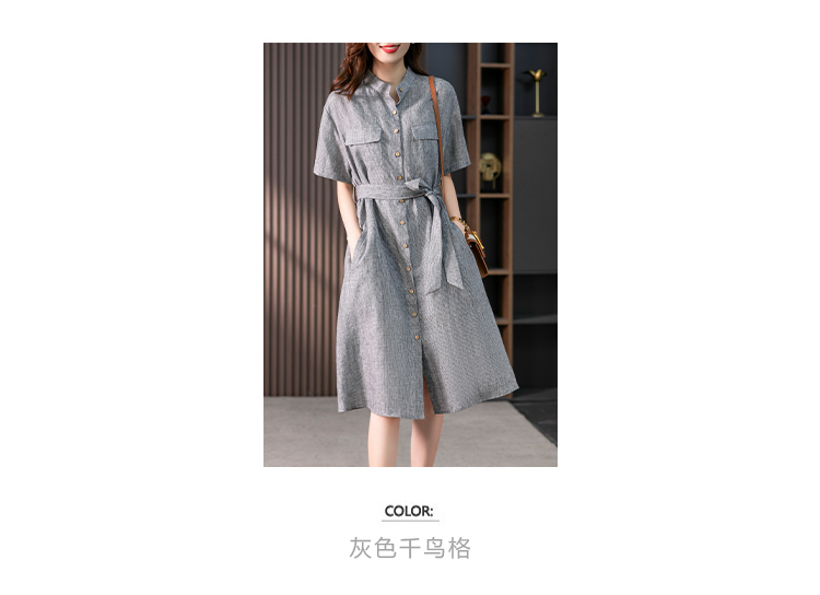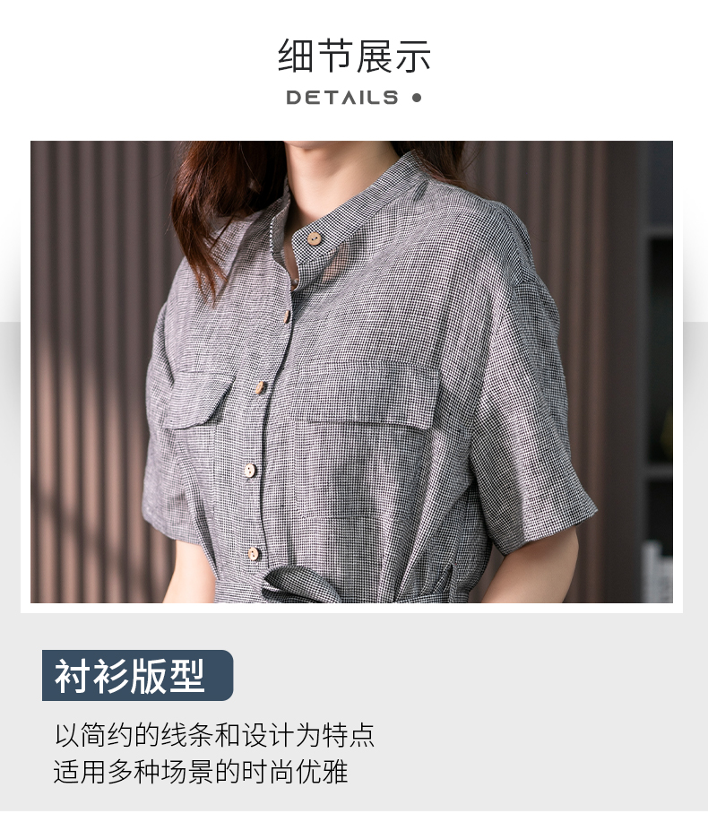 85794原形复古千鸟格亚麻衬衫裙女2024春夏季新款韩版设计感小众连衣裙