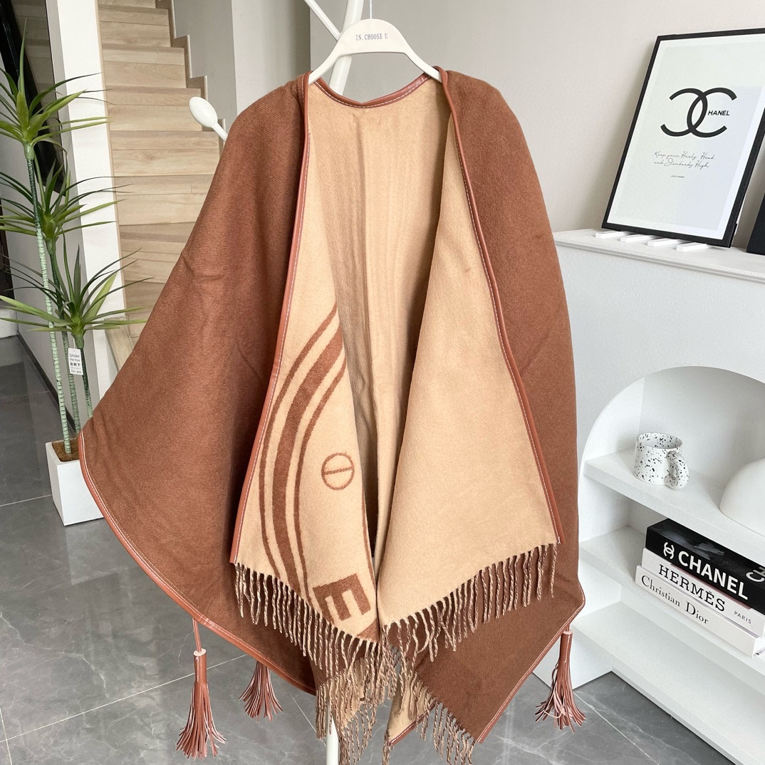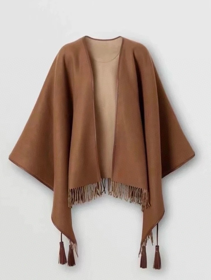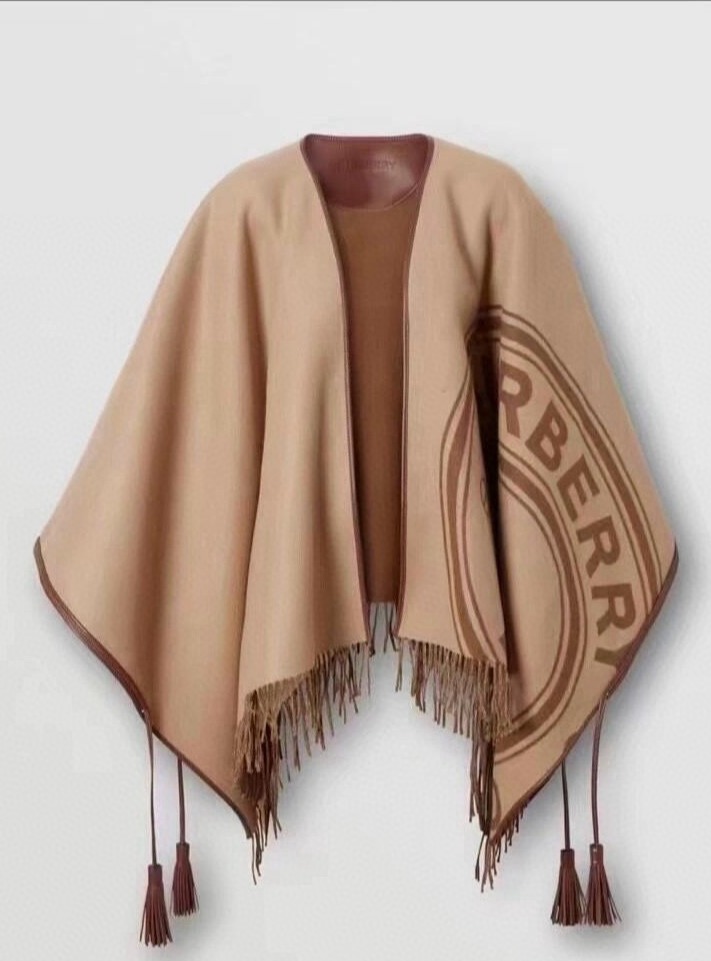 B 家史上最牛掰的原单货,全真皮包边配饰斗篷外套。这款披肩效果很难织造而且颜色采用的是今年流行的美拉德色系,无论是印花还是纹理工艺非常考究,看看真皮包边等细节,精致细腻的针脚