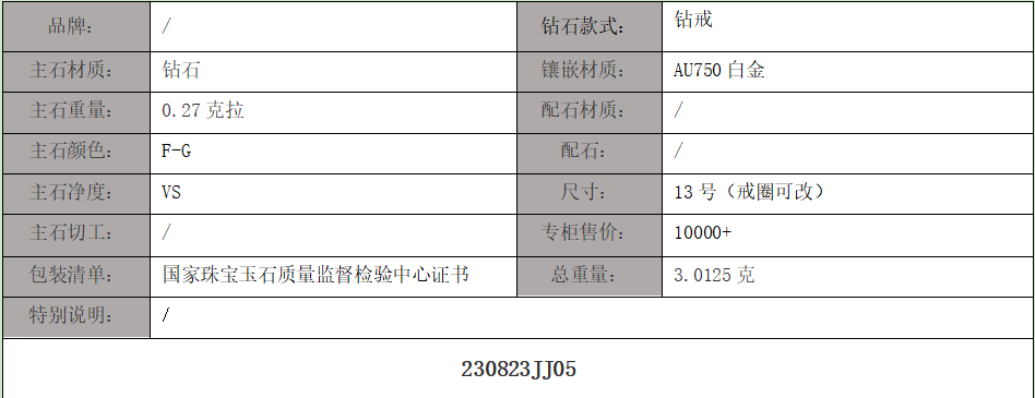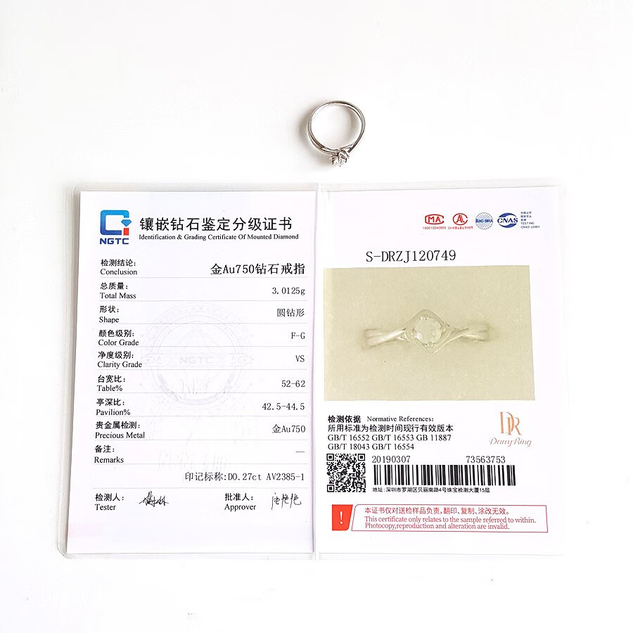 【天然正品】AU750白金钻石钻戒0.27克拉F-G VS 13号(戒圈可改)230823JJ05