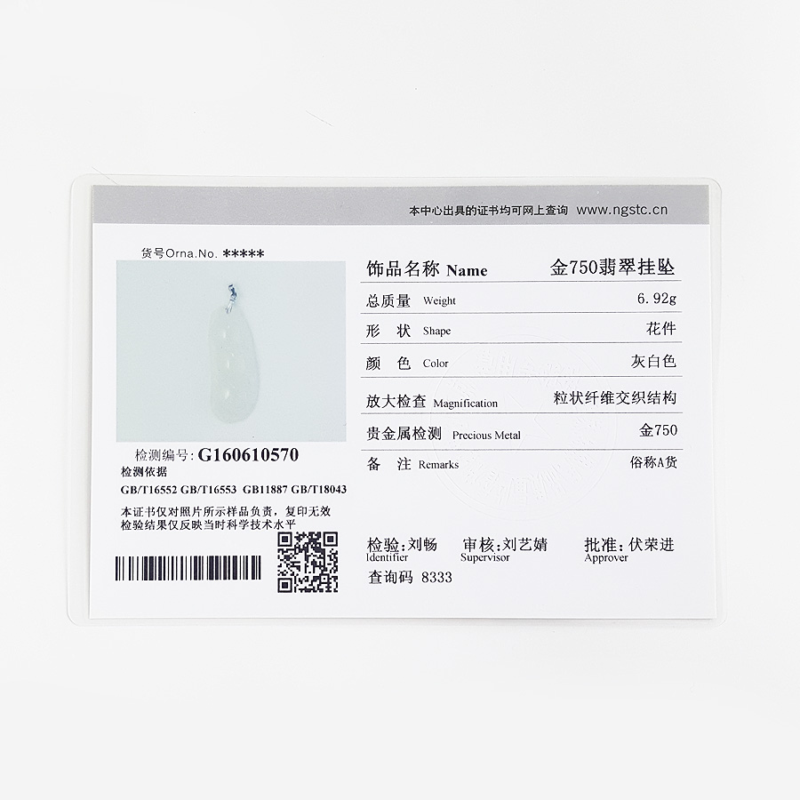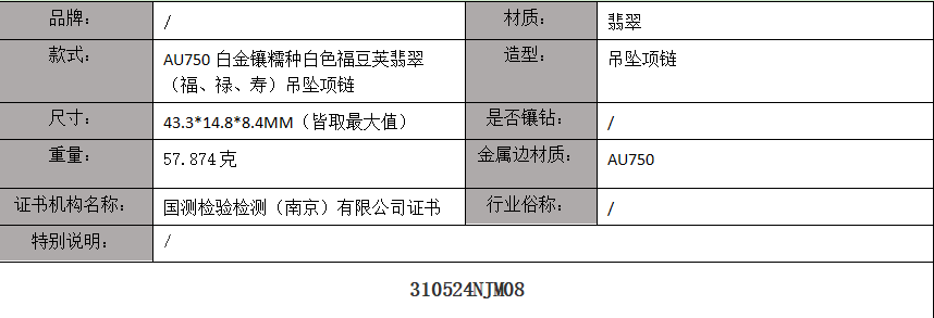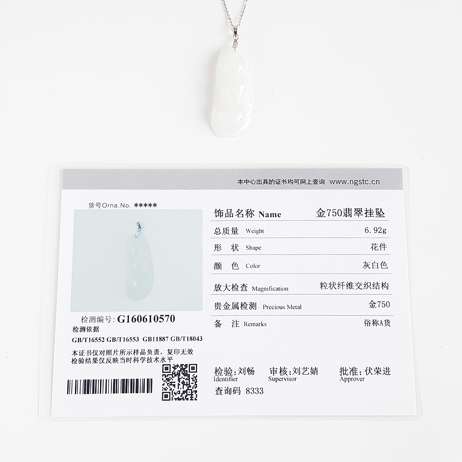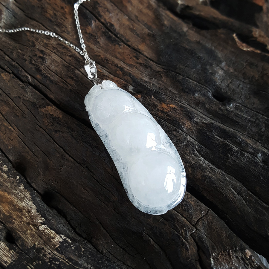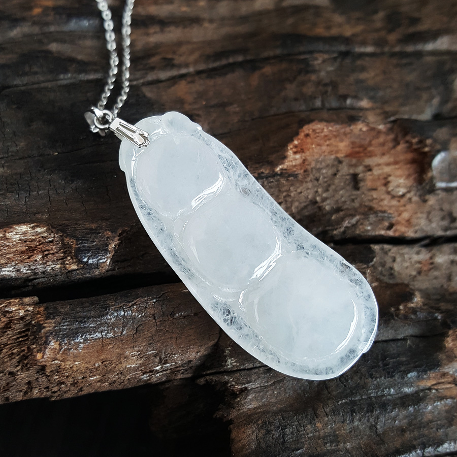 【天然正品】AU750白金镶糯种白色福豆荚翡翠(福、禄、寿)吊坠项链310524NJM08