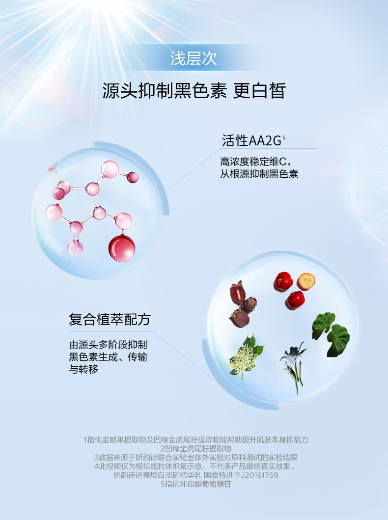 为下一步美白护理做好吸收准备。富含针叶樱桃精萃,有效阻止因黑色素信使刺激产生过多黑色素,预防未来斑。使用方法:早晚用于洁净后的肌肤。避免眼周区域。