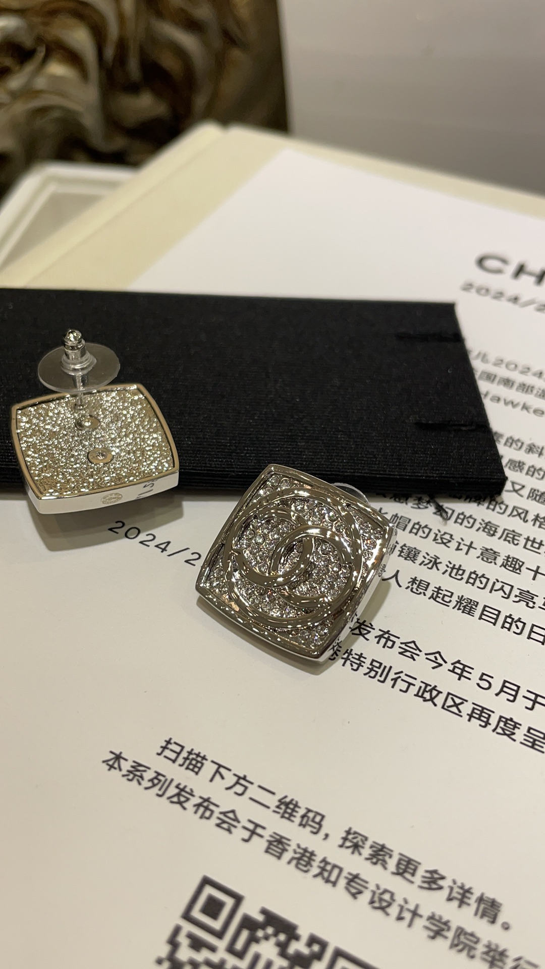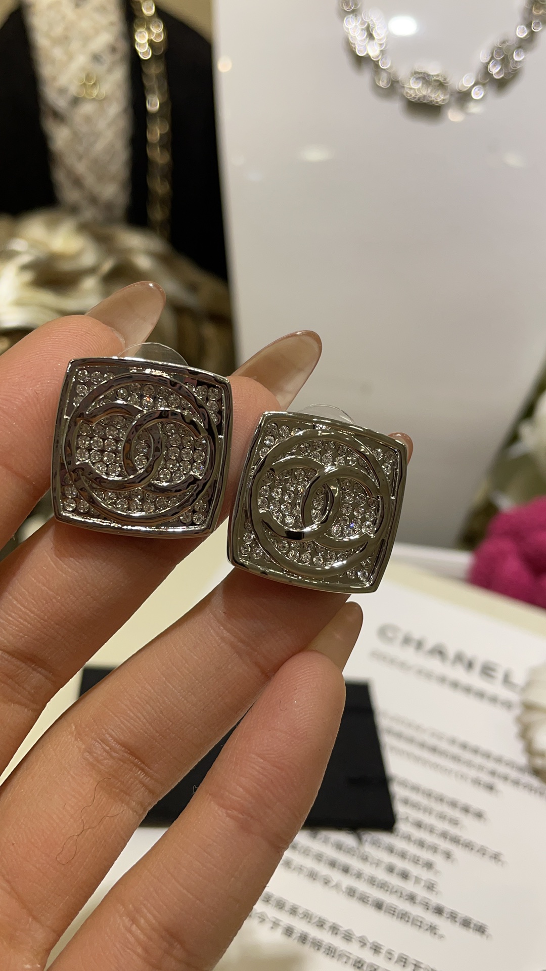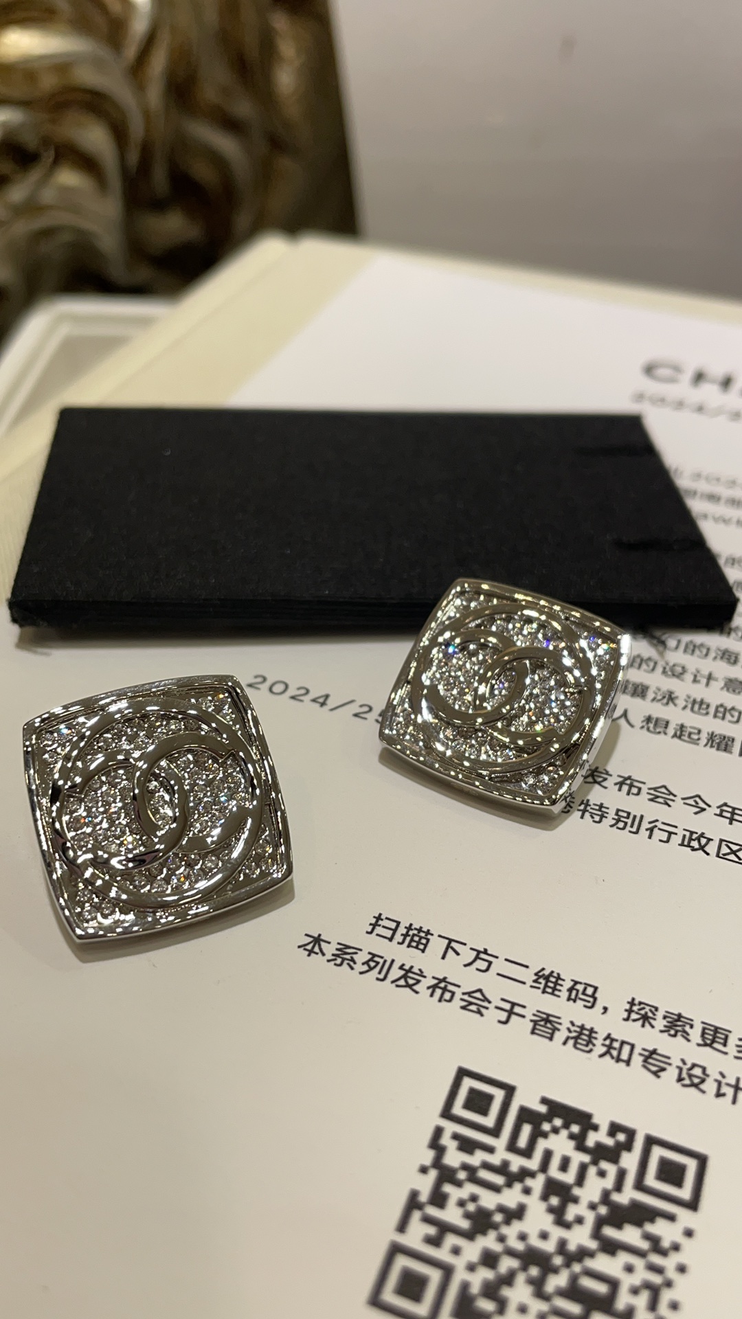 香奶奶 25C新款银色双C圆形满钻方块耳钉