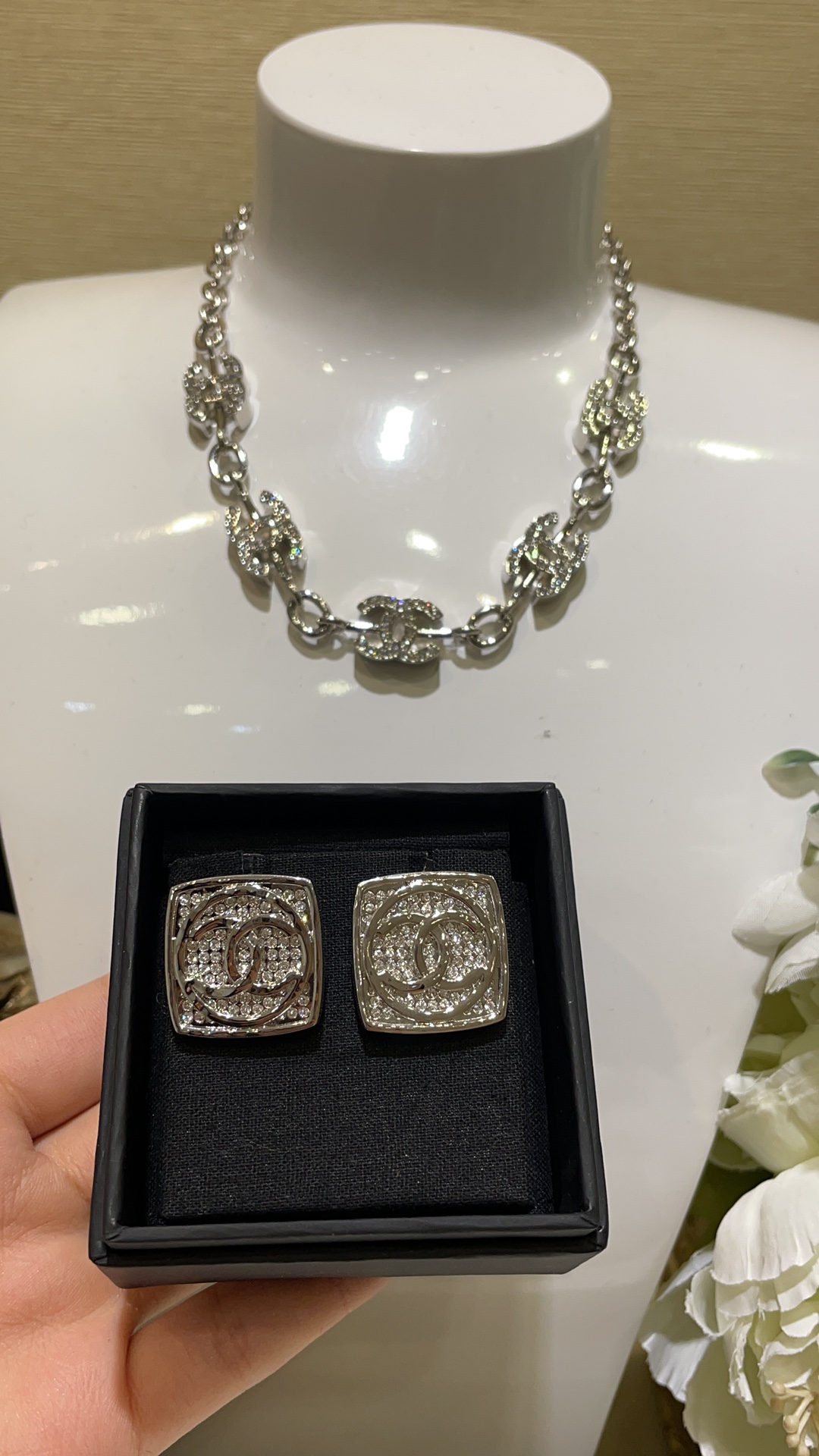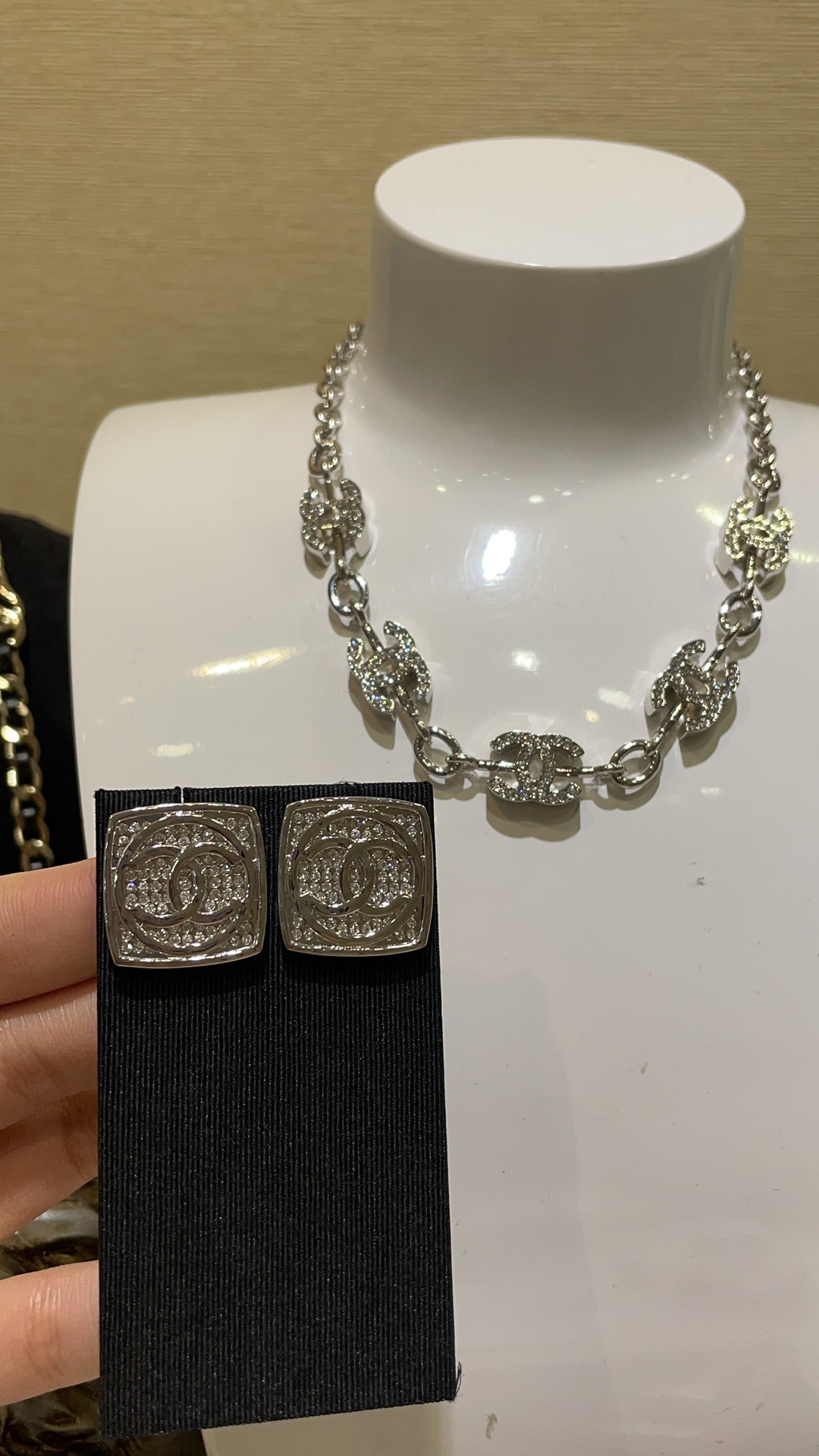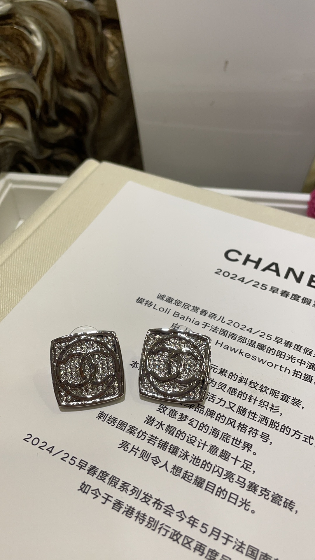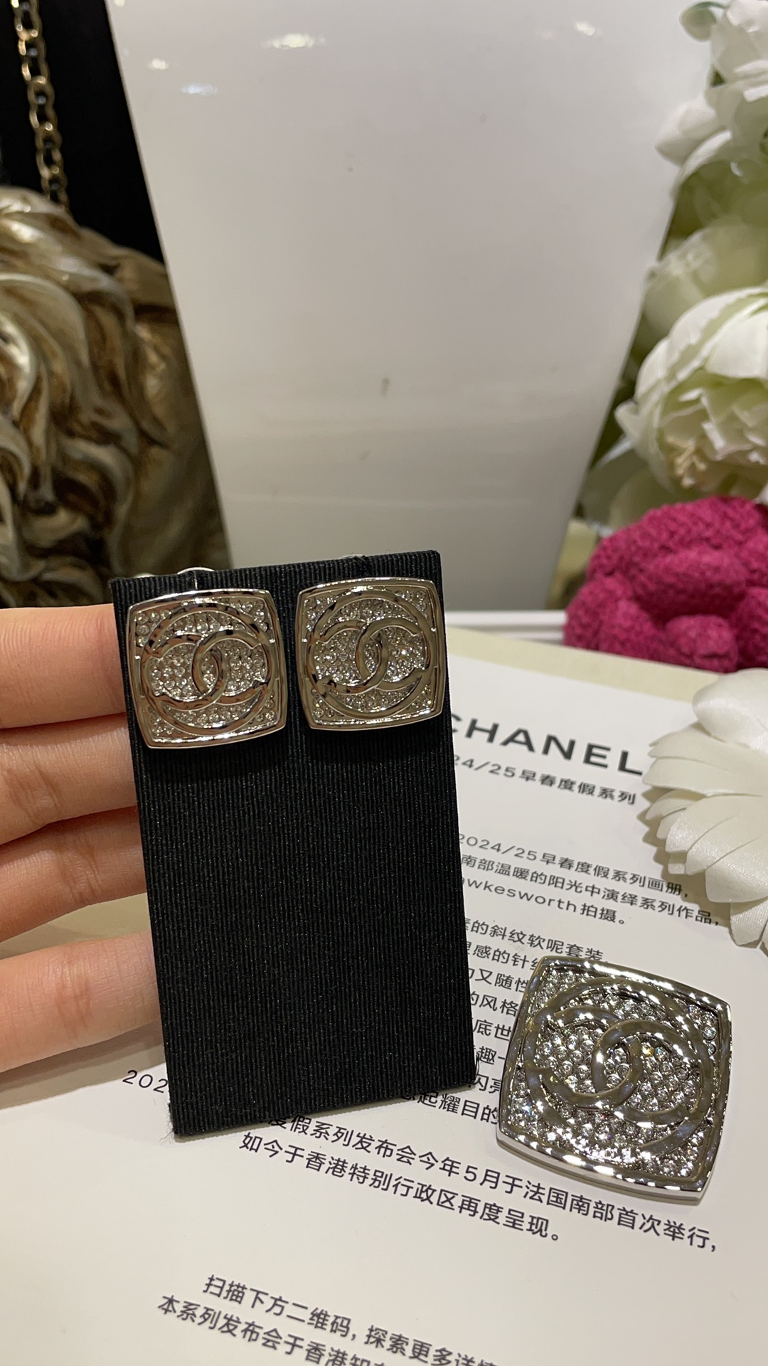 香奶奶 25C新款银色双C圆形满钻方块耳钉