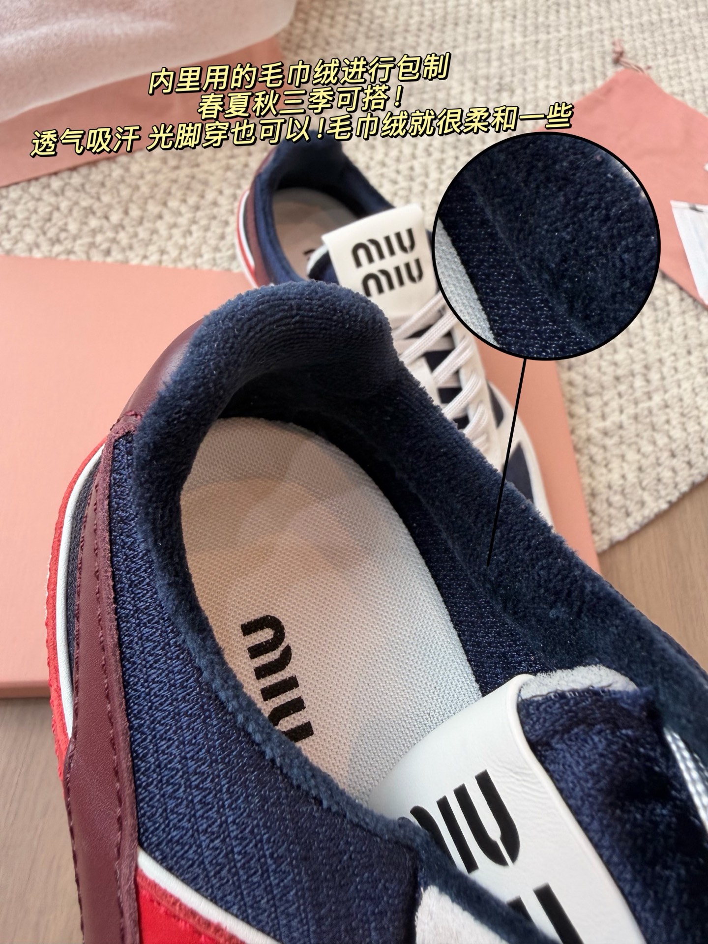 最推荐这个颜色!实物也确实很好看! 藏青拼色搭衣服的话也更容易一些、短裤、休闲裤、牛仔裤、或者裙子的都适配! 买鞋子嘛 穿着舒服 实穿率高!好搭衣服才是首位! 面料用的是进口丝光牛反绒、牛皮、拼接透气网棉制作!