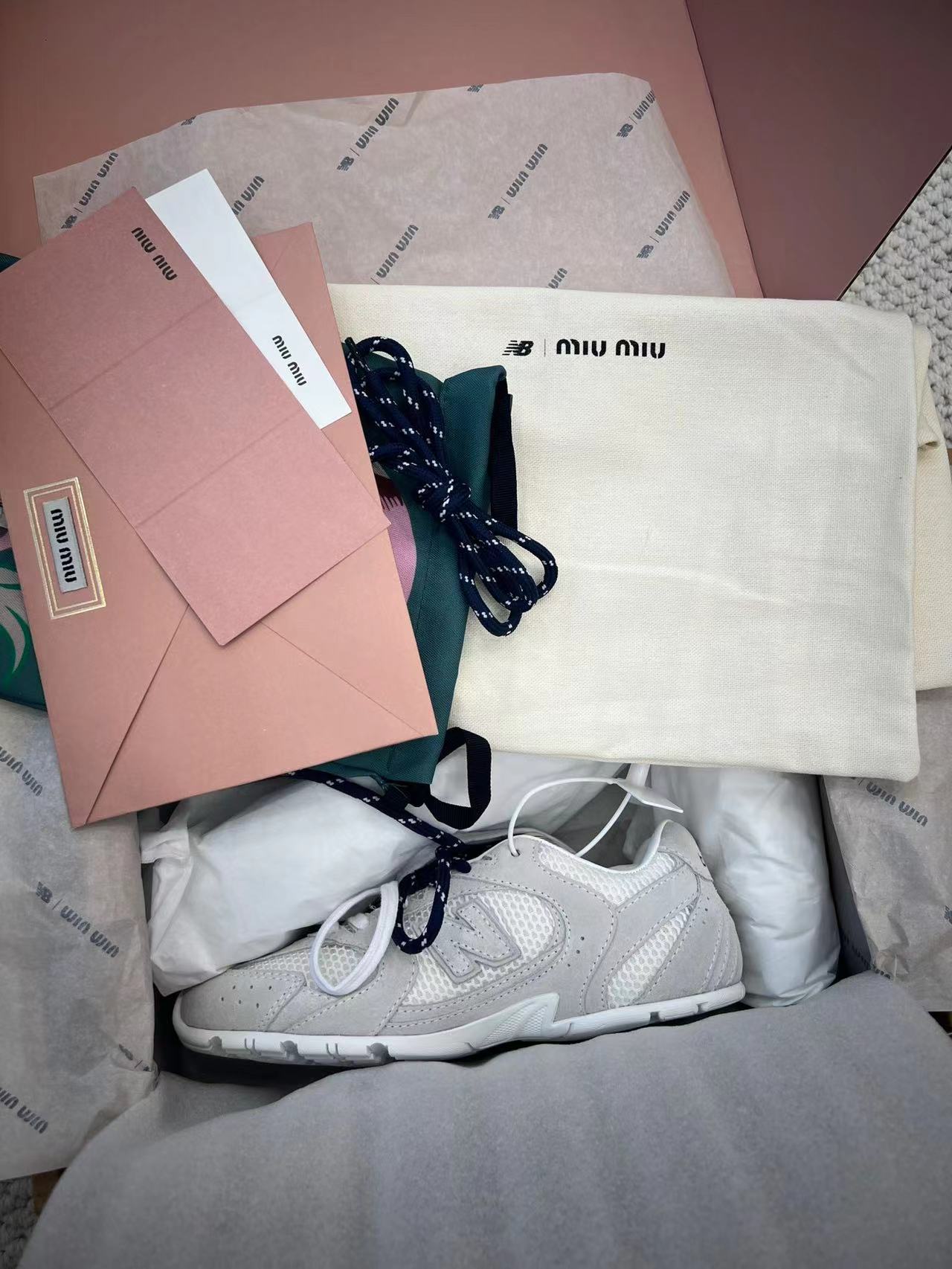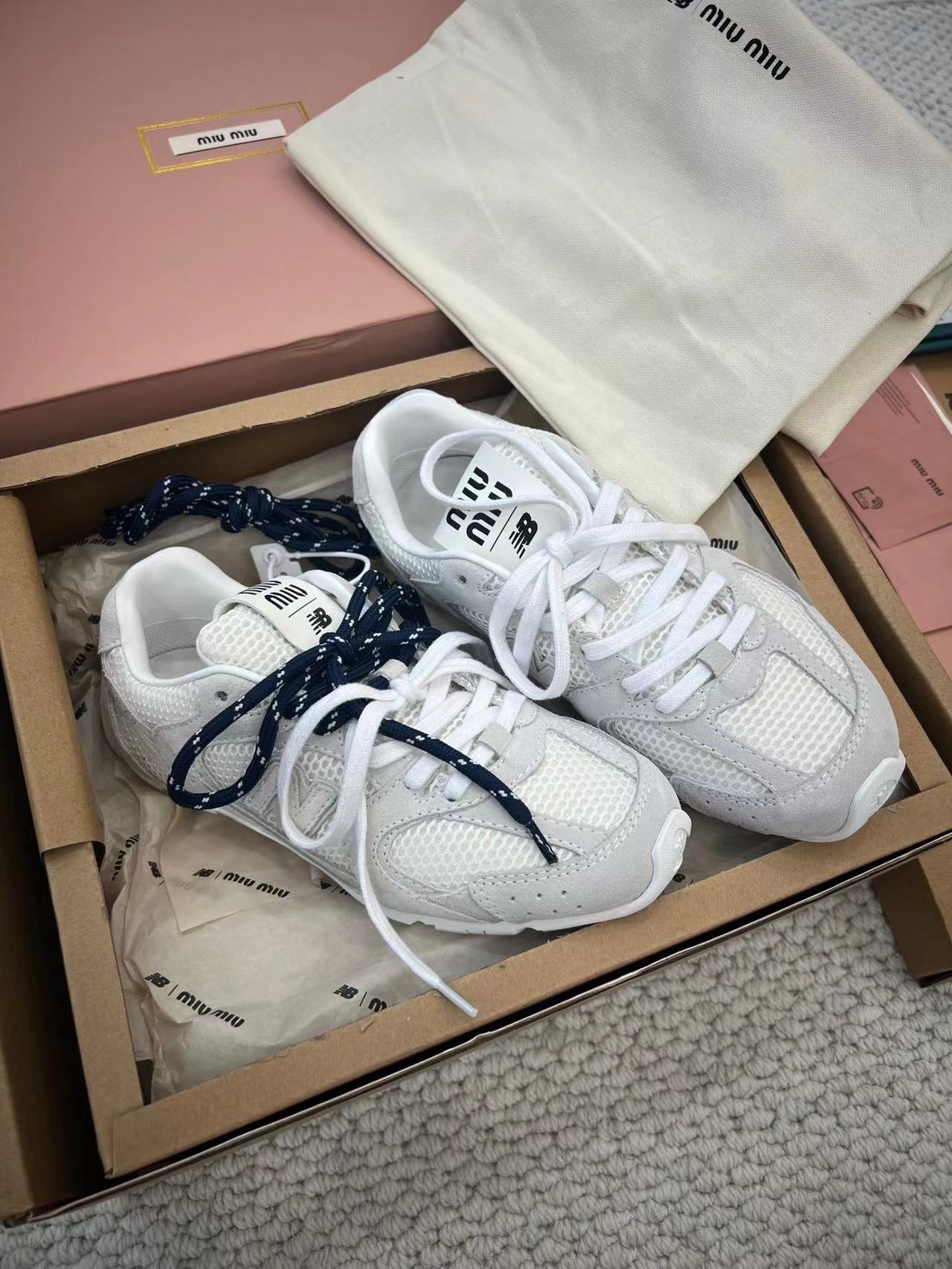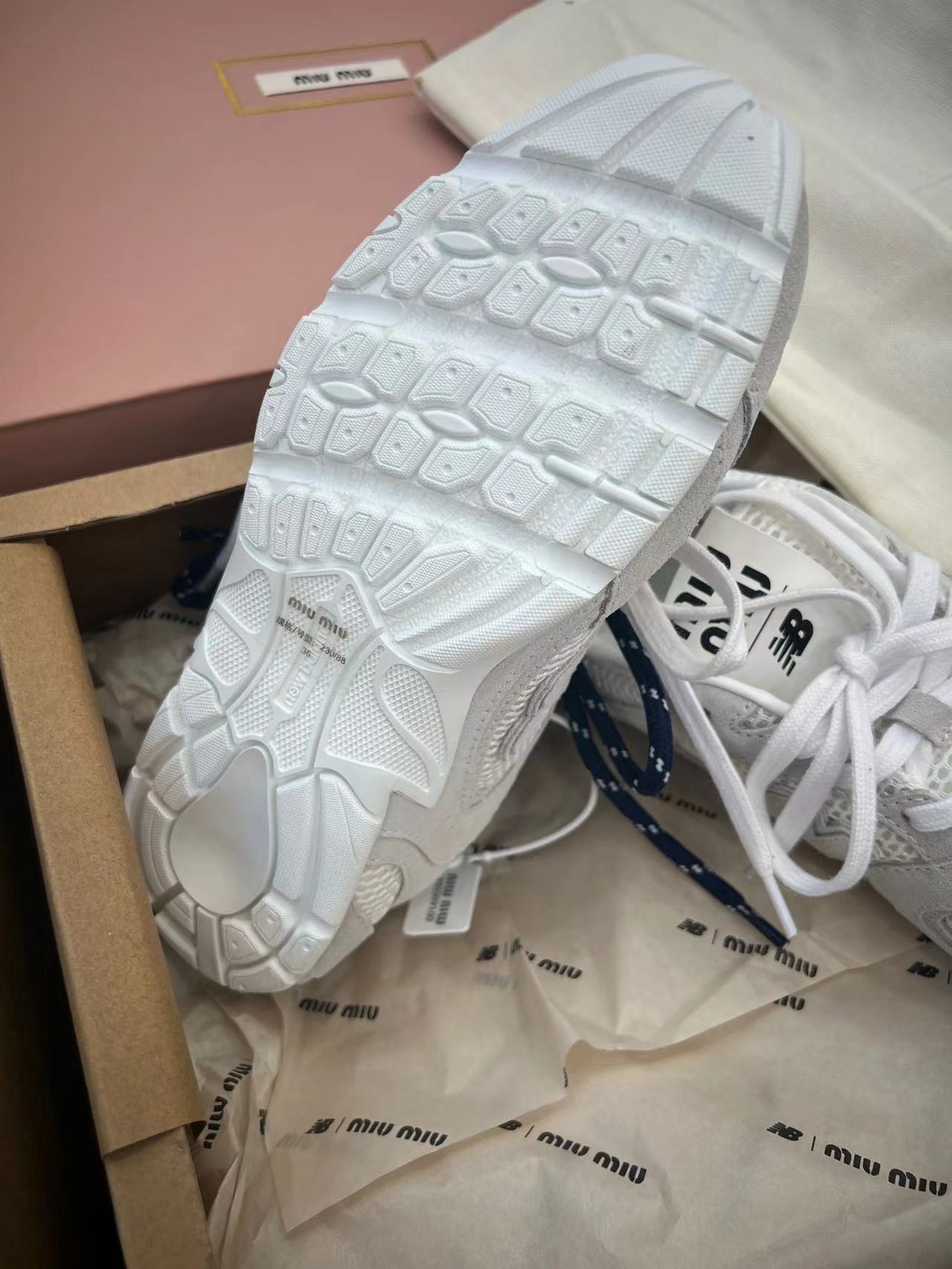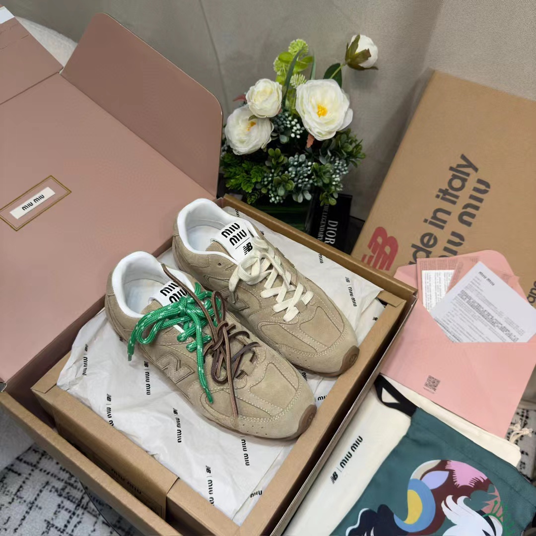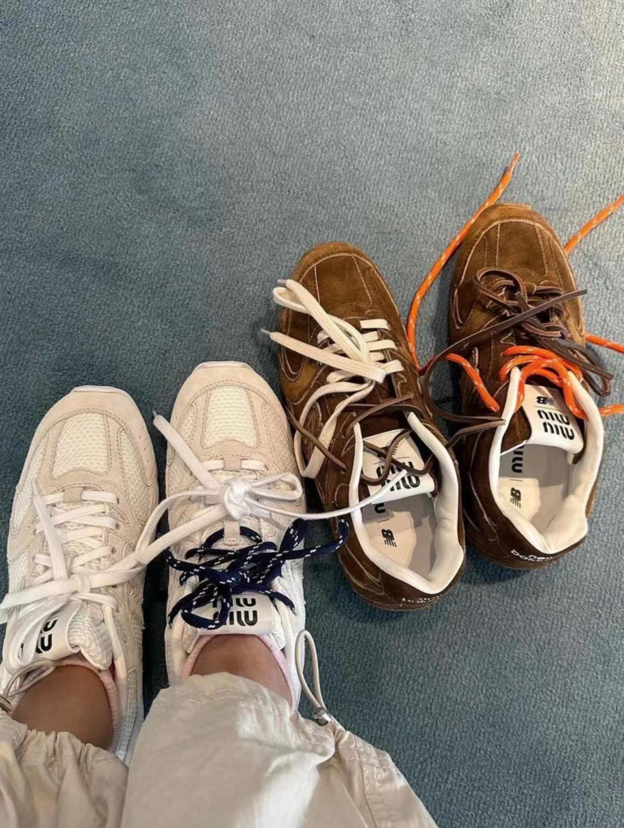 ??24春夏秀场主推款miumiu x new balance 530复古休闲球鞋!miumiu ss24大秀上曝光了与new balance 的全新联名企划 以530为蓝本设计!流畅的鞋型!惊艳登场鞋面以皮革和麂皮拼接打造十分有质感!复古上脚尤为惊艳到你的一款?闭眼入都是不会后悔·上脚非常舒服超??稳·搭配还是可咸可甜??鞋带采用了最近很流行的双鞋带设计每一双鞋配备三幅鞋带鞋面采用原版进口牛反绒内里羊皮拼接透气网布