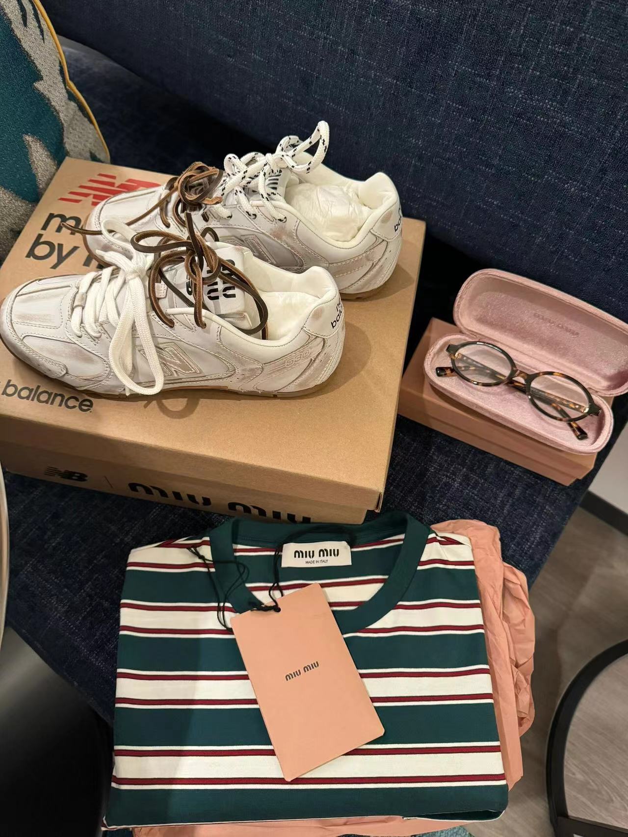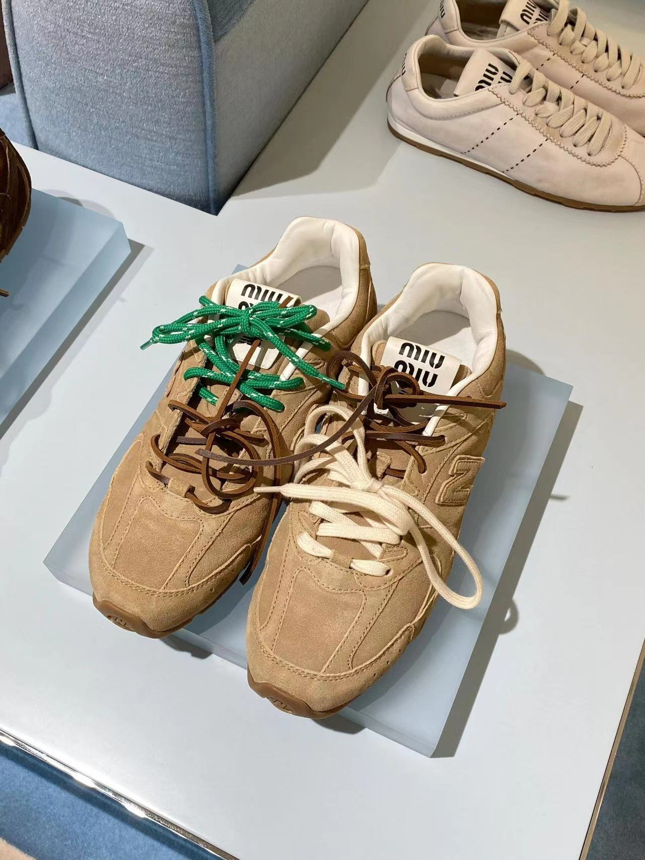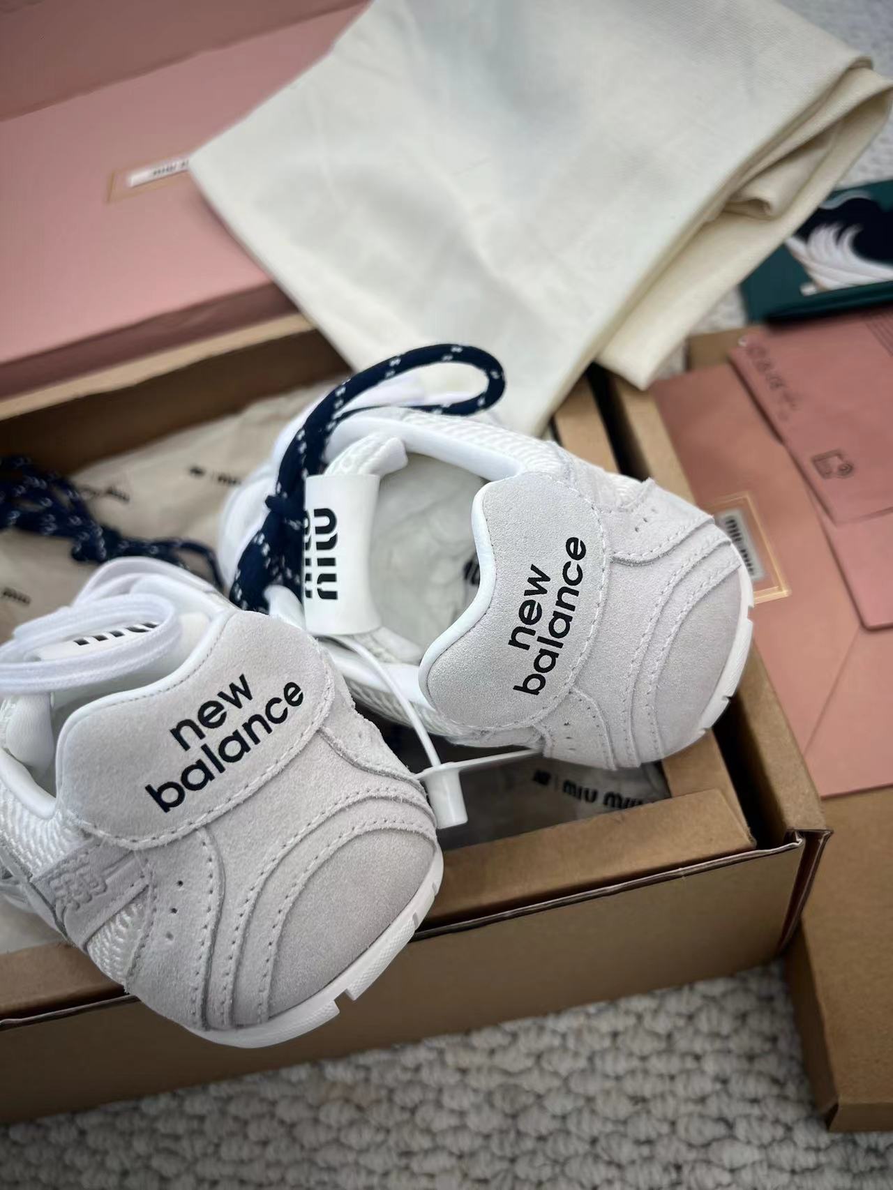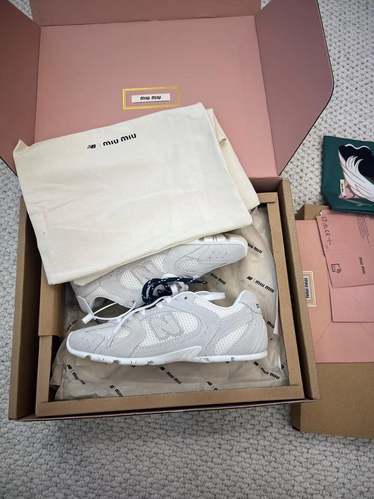 ??24春夏秀场主推款miumiu x new balance 530复古休闲球鞋!miumiu ss24大秀上曝光了与new balance 的全新联名企划 以530为蓝本设计!流畅的鞋型!惊艳登场鞋面以皮革和麂皮拼接打造十分有质感!复古上脚尤为惊艳到你的一款?闭眼入都是不会后悔·上脚非常舒服超??稳·搭配还是可咸可甜??鞋带采用了最近很流行的双鞋带设计每一双鞋配备三幅鞋带鞋面采用原版进口牛反绒内里羊皮拼接透气网布