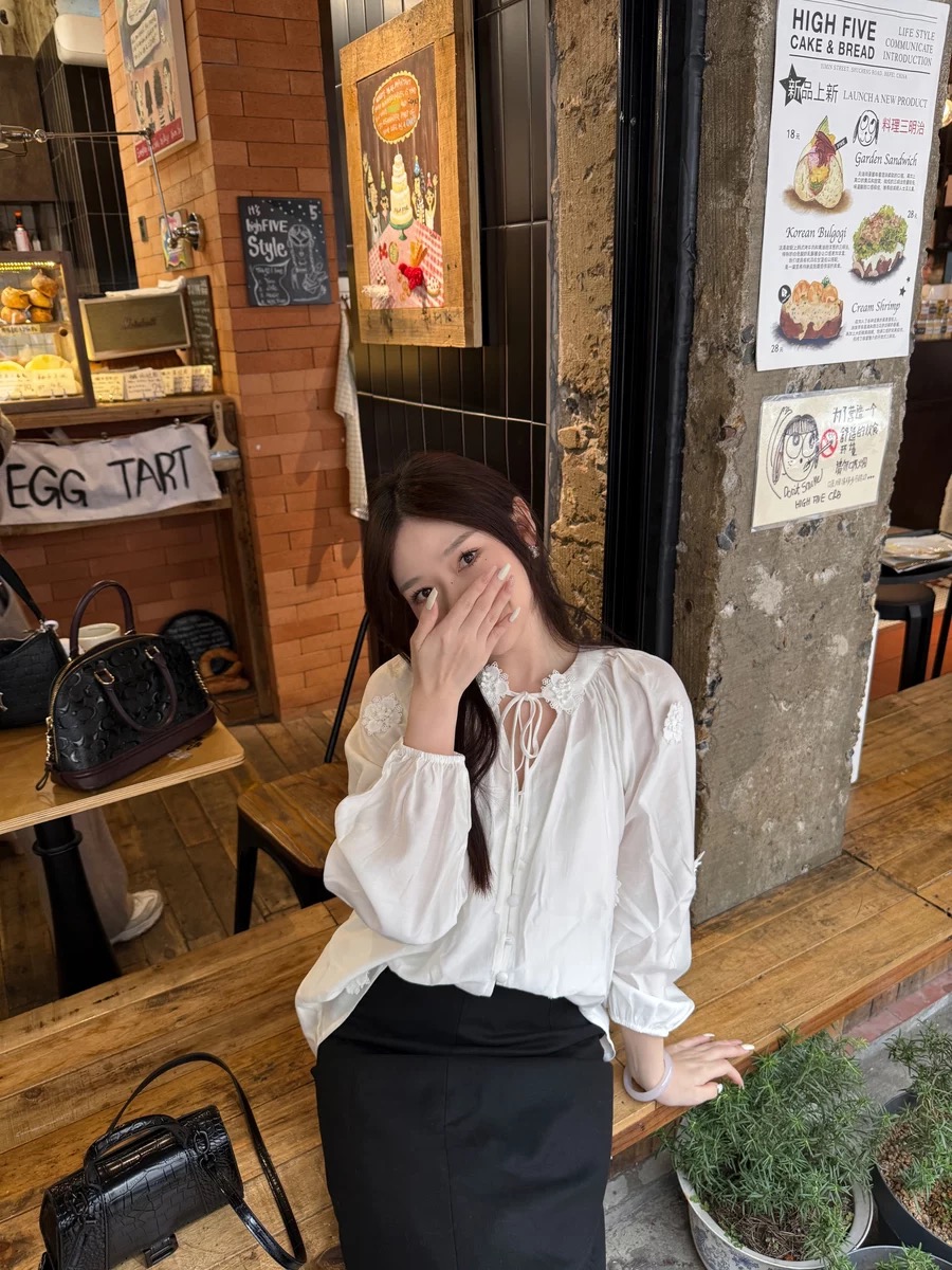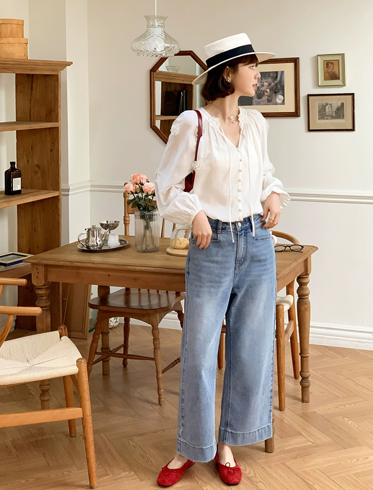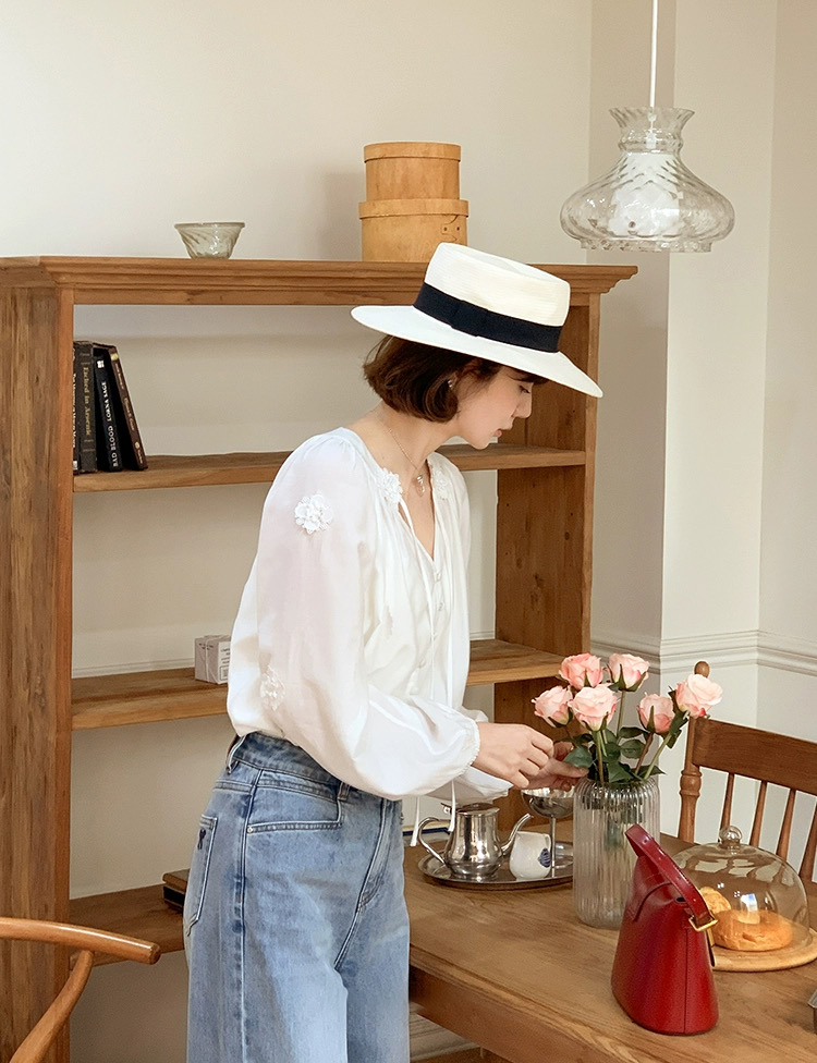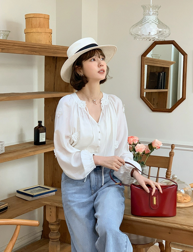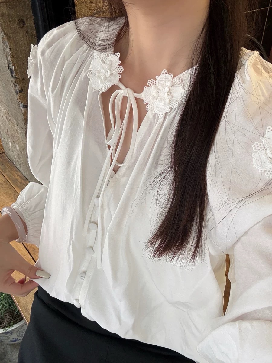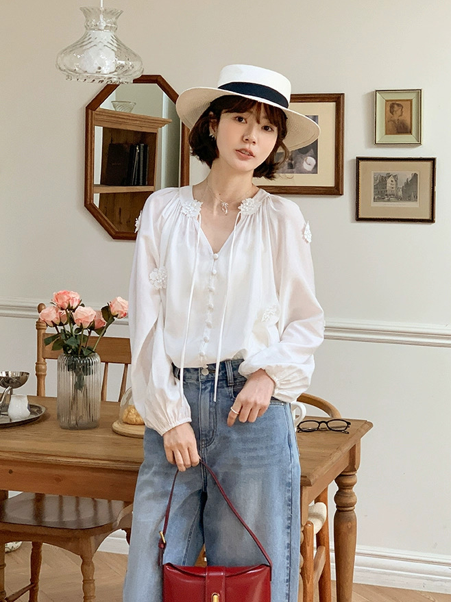 isabelle marran伊莎贝尔法式V领立体花朵灯笼袖衬衫JS3693011