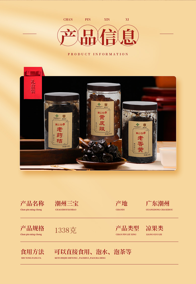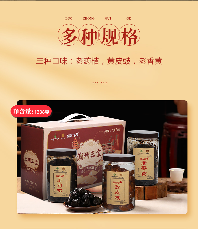 广东潮州紫云仓潮州三宝1338g/盒(老药桔458g、黄皮豉380g、老香黄500g)