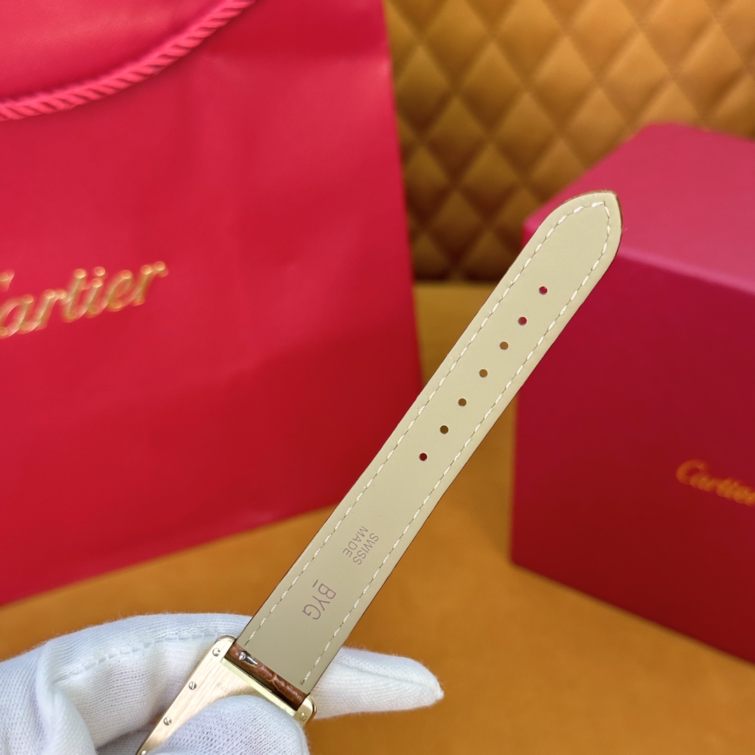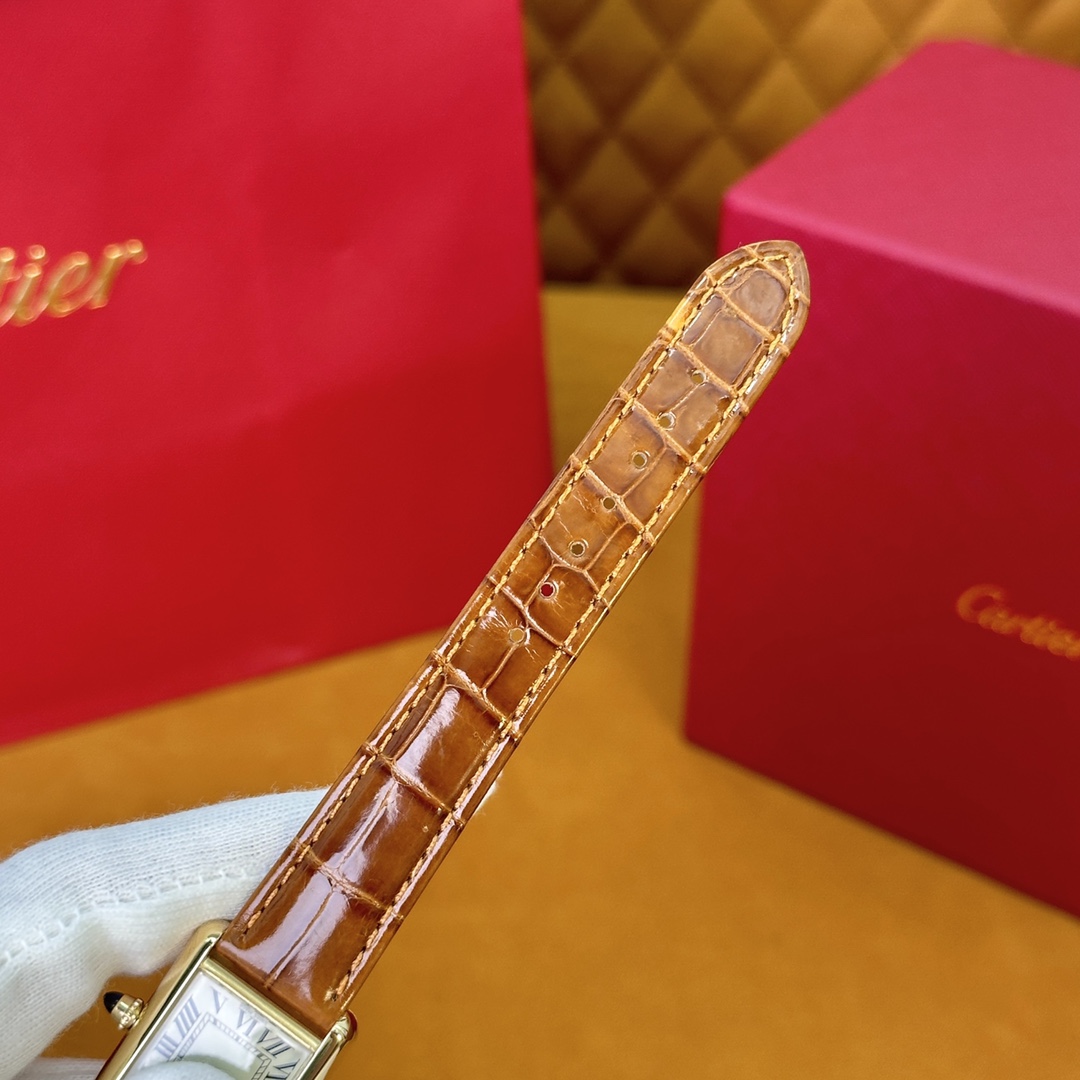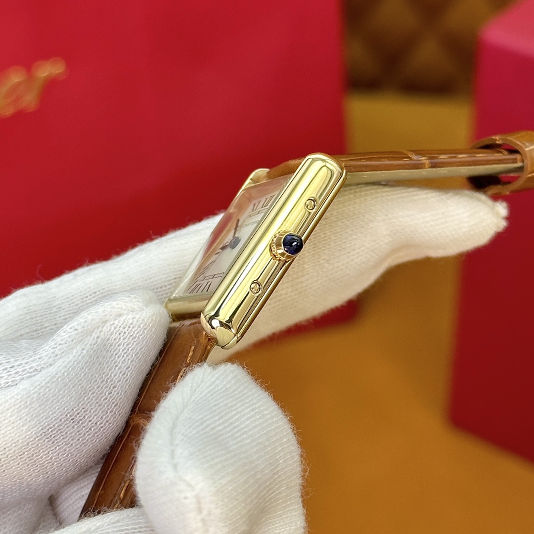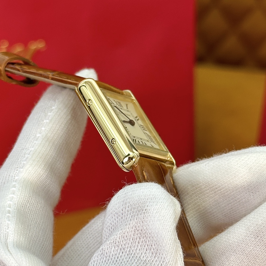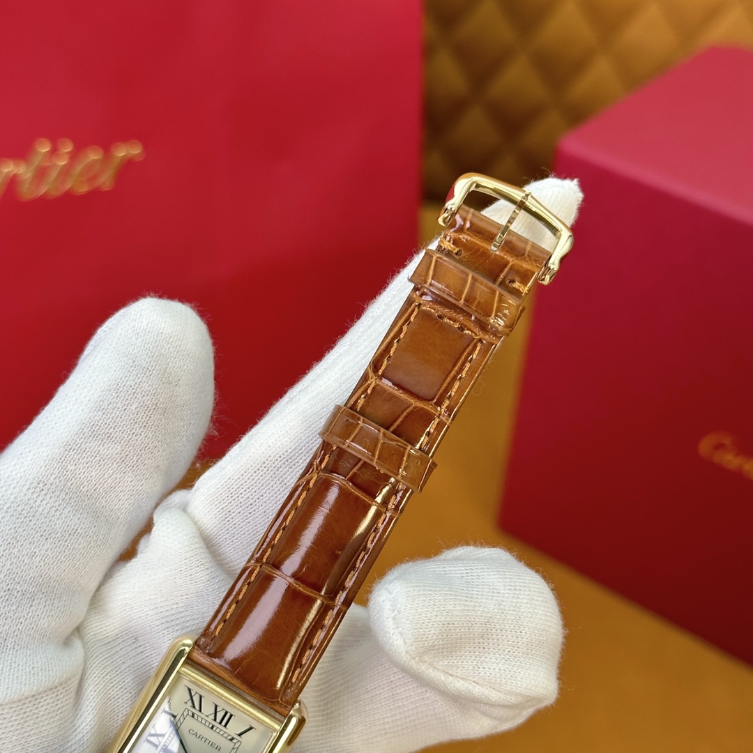 🏷️坦克系列 型号:W1529856 原版石英瑞士进口超薄高效能机芯 # 采用18K黄金表壳,珠光镀银白色方形表盘,瑞士剑形指针,特别完美,针轴光亮!针轴也是符合瑞士工艺要求,印字特别清晰,刻字完美,防刮损防指纹蓝水晶玻璃,生活防水。 表冠纤细,倒角打磨的特别精细~镶嵌一颗凸圆形合成尖晶石! 棕黄色鳄鱼皮表带-可拆卸替换式表带,与原版一致的快拆表带装置 多种颜色皮带和钢带都可以互相替换,拆卸简单易操作。 尺寸:22X29.5mm