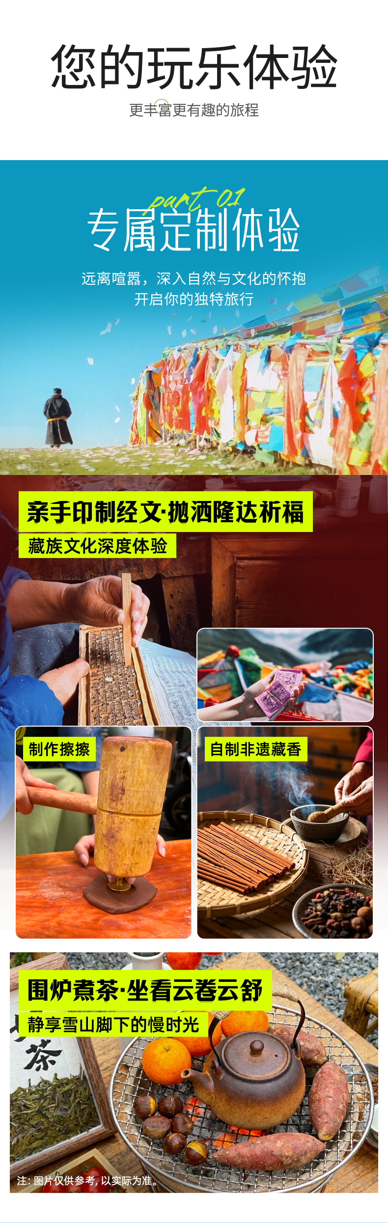 【B套餐】赠三环内上门接、便携氧气1瓶/人、旅游三宝、矿泉水、 九寨沟藏装旅拍+达古冰川便装旅拍+毕棚沟便装旅拍(各赠3张精修+底片,不含妆造)、藏家欢乐颂、手印制经文·制作擦擦·非遗藏香+静谧小院雪山煮茶+撒隆达祈福、5人团专享(送回三环内、1人赠双流专车接机1次,2人赠天府专车接机1次;成都酒店1晚)