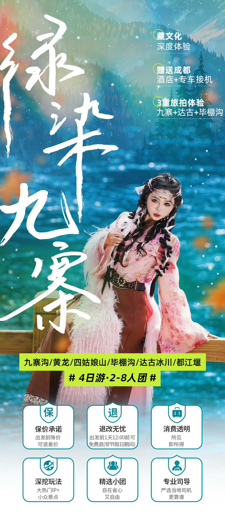 九寨沟4天5/8人小团 保证空座率+藏文化深度体验 打卡四姑娘山/毕棚沟/理小路/都江堰/黄龙/达古冰川