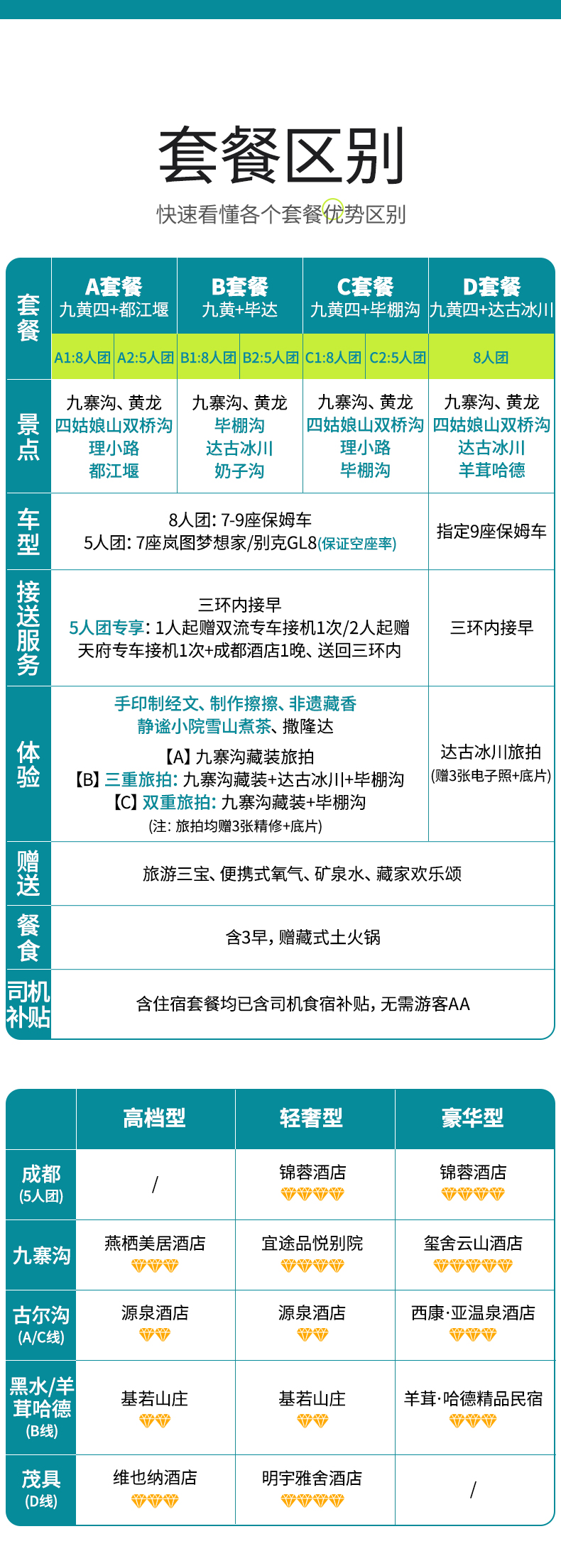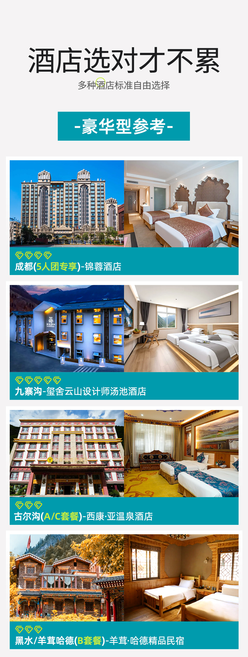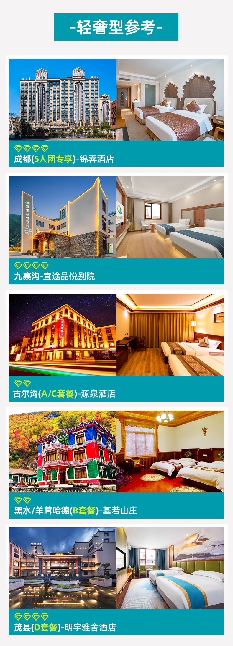 轻奢型:5人团赠4钻成都酒店(成都索菲斯民族大酒店(宽窄巷子抚琴地铁站店)/成都锦蓉酒店(金沙遗址博物馆店)/锦客国际酒店(成都站福宁路地铁站)/成都天邑国际酒店(武侯祠锦里店)/金科圣嘉酒店(武侯祠红牌楼店)/成都熊猫假日酒店(建设路东郊记忆店)/成都港伦凯艺酒店(东郊记忆理工大学店)/扉宿酒店(成都欢乐谷金府地铁站店)或同级)、九寨沟沟口(九寨沟宜途品悦别院/九寨沟三墨酒店/朗吉弥藏酒店(九寨沟店)/九寨天澜酒店/九寨沟格尔单白马藏文化主题酒店/璟悦假日酒店(九寨沟景区游客中心店)/林景·山屿FOREST VIEW酒店/九寨沟港威瑞逸度假酒店(九寨千古情店)或同级)、古尔沟(理县源泉酒店/理县美谷温泉酒店(古尔沟风景区店)/理县月亮湾温泉酒店/嘉源温泉酒店/枫悦温泉大酒店或同级)、黑水/羊茸哈德 (黑水基若山庄(达古冰川店)/黑水圣地酒店/黑水神仙居大酒店/黑水新区壹号酒店/黑水七彩驿旅民宿或同级)