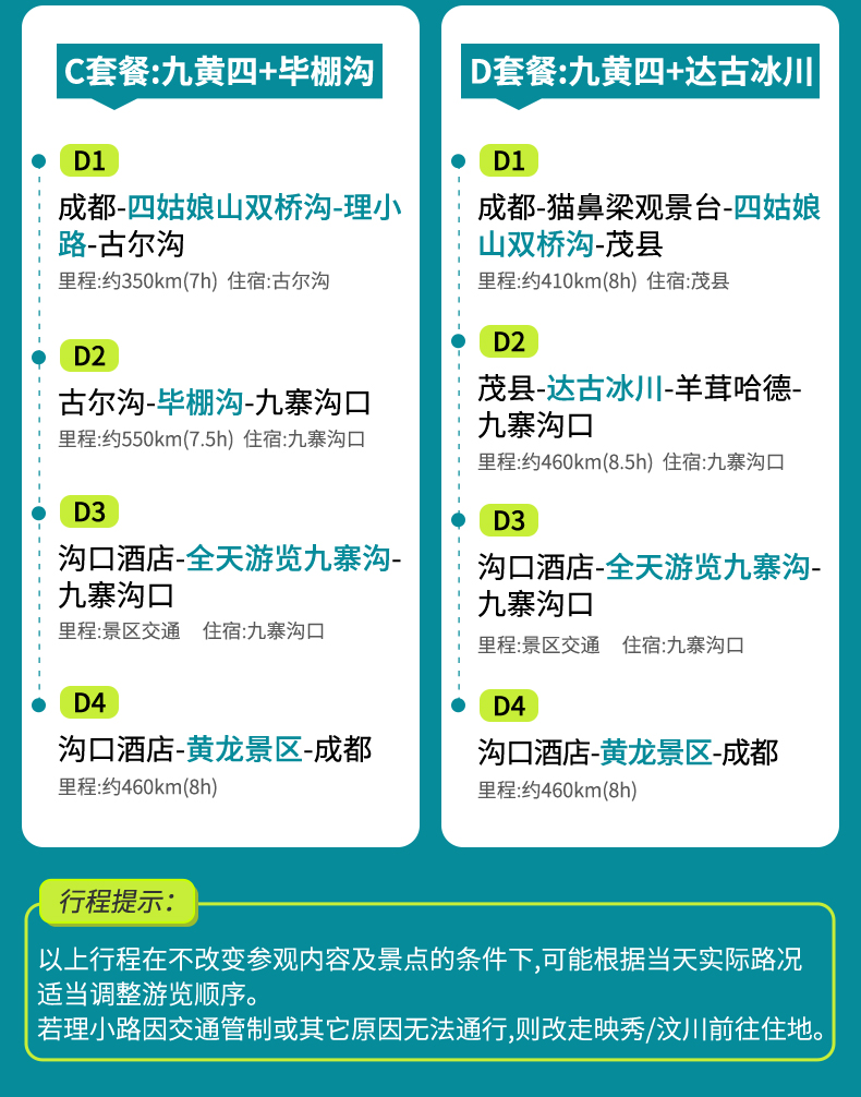 注: 旺季会存在门票紧张的情况,旺季出行报名时九寨、黄龙、需提前买票。
