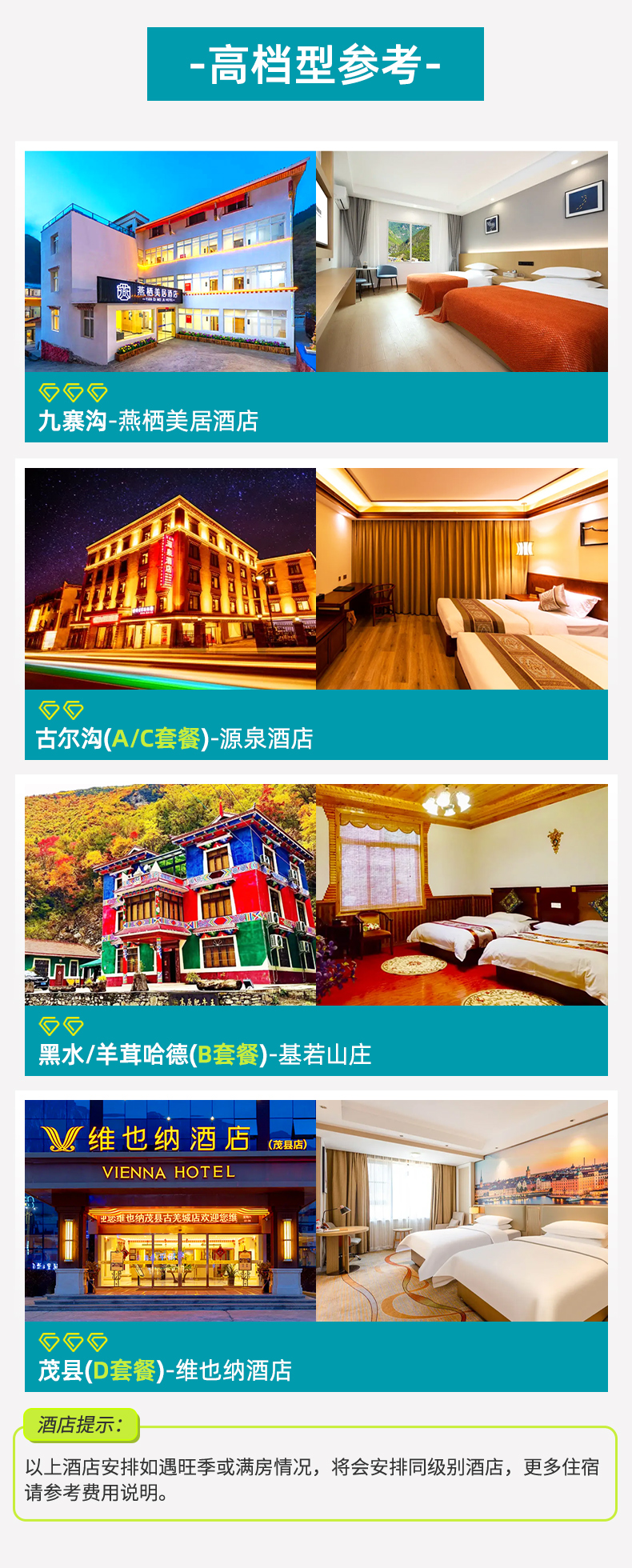 高档型:茂县(维也纳/九顶山国际大酒店或同级)、九寨沟(溪畔明珠/馨悦枫景/百俪度假酒店/九寨阳光酒店/汀泉清居酒店/鑫凯逸/益露来国际度假村/正顺享达酒店/云上栖舍酒店/山泉度假主题酒店或同级)