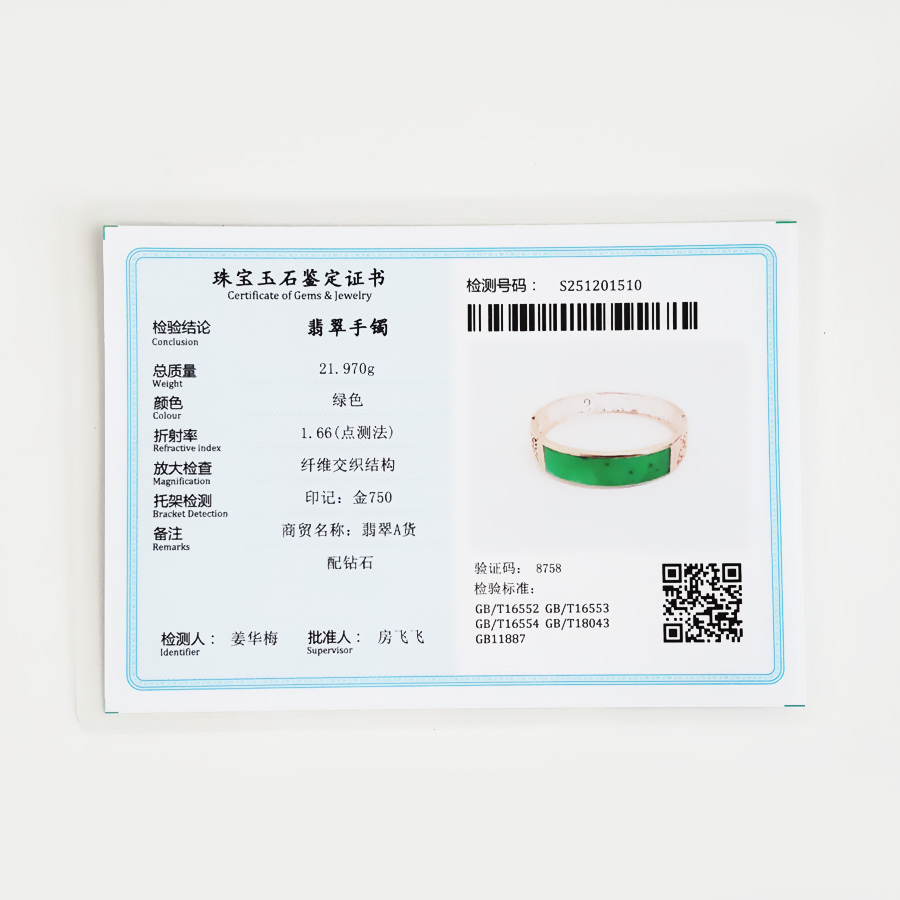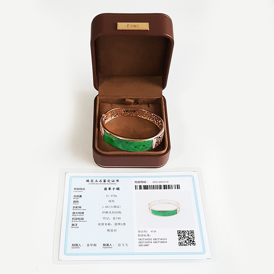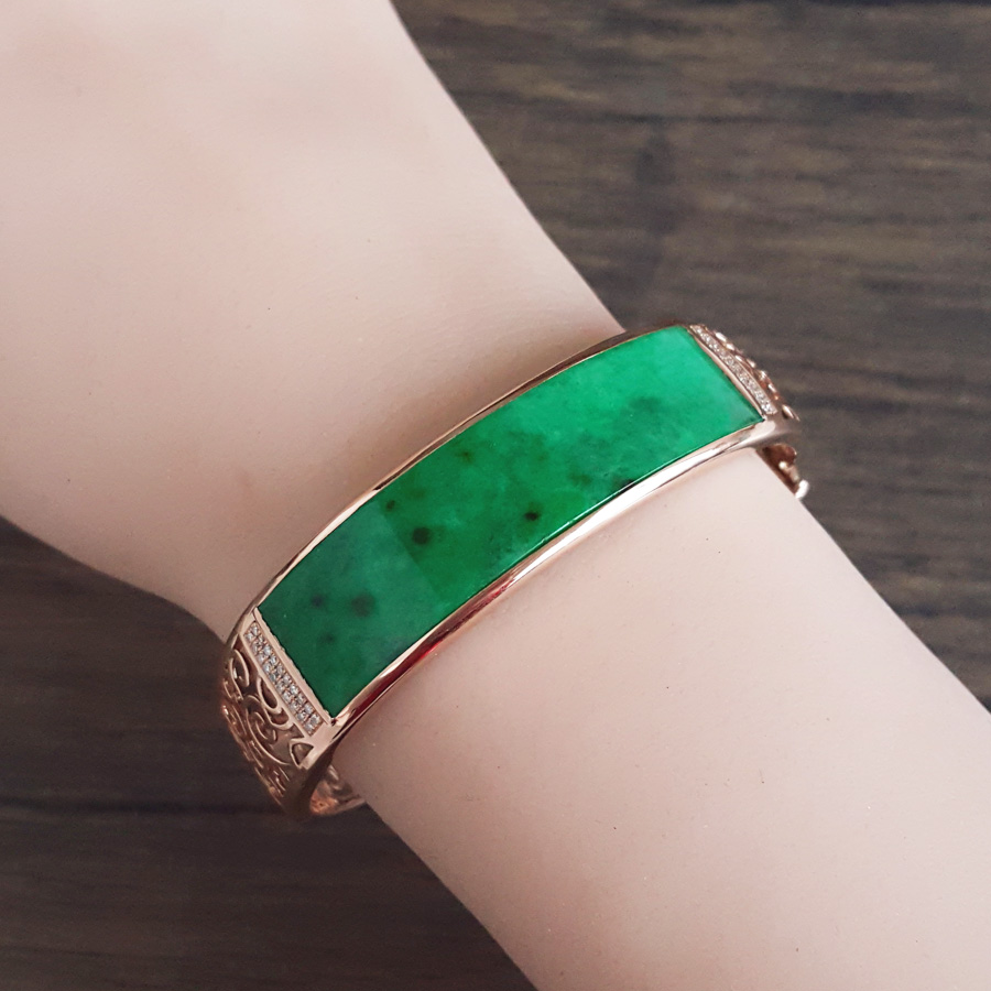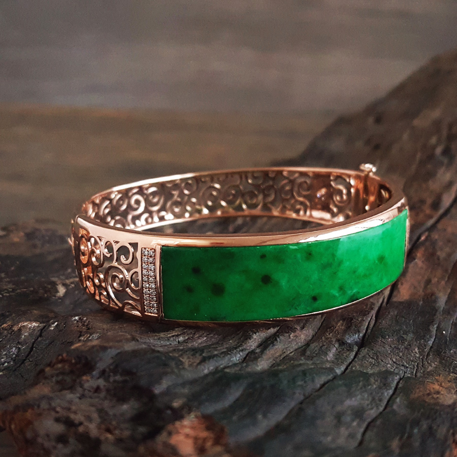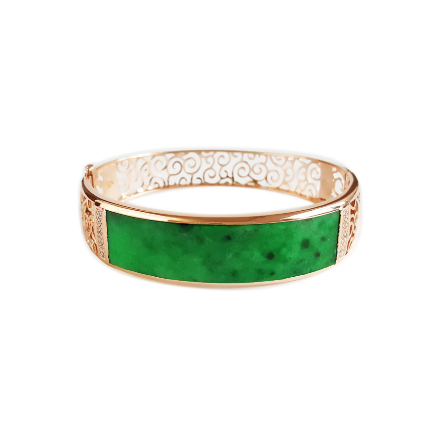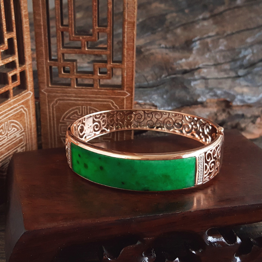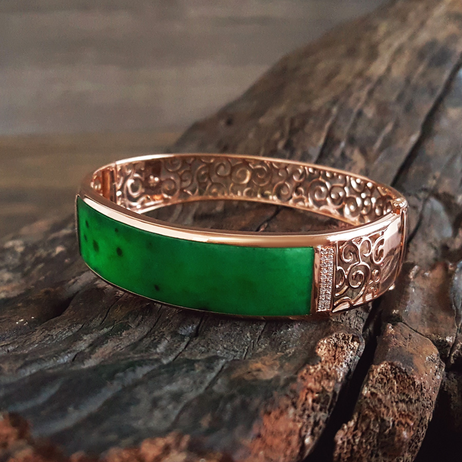【天然正品】A货翡翠AU750收藏级玫瑰金镶钻镶天然细腻细豆种满绿57号翡翠手镯 191225TJ35