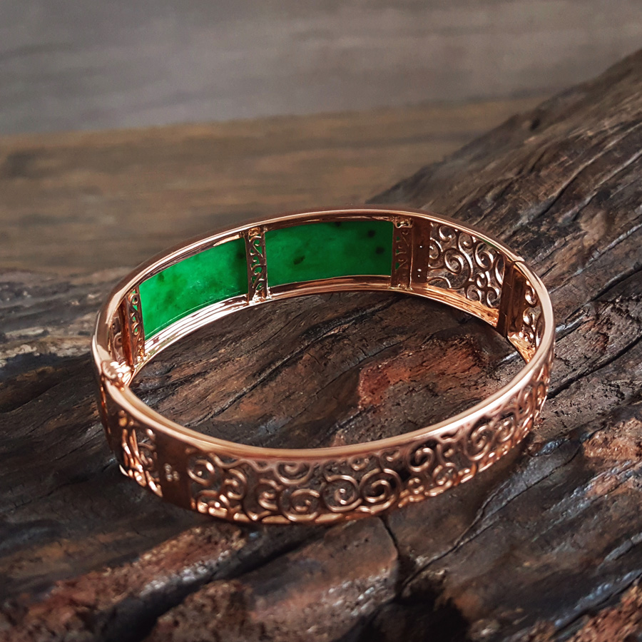 名称 | AU750收藏级玫瑰金镶钻镶天然细腻细豆种满绿57号翡翠手镯 |