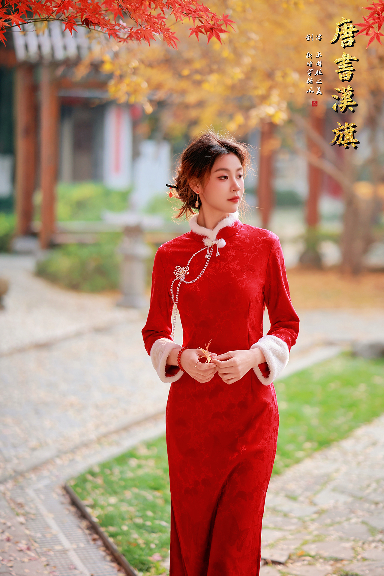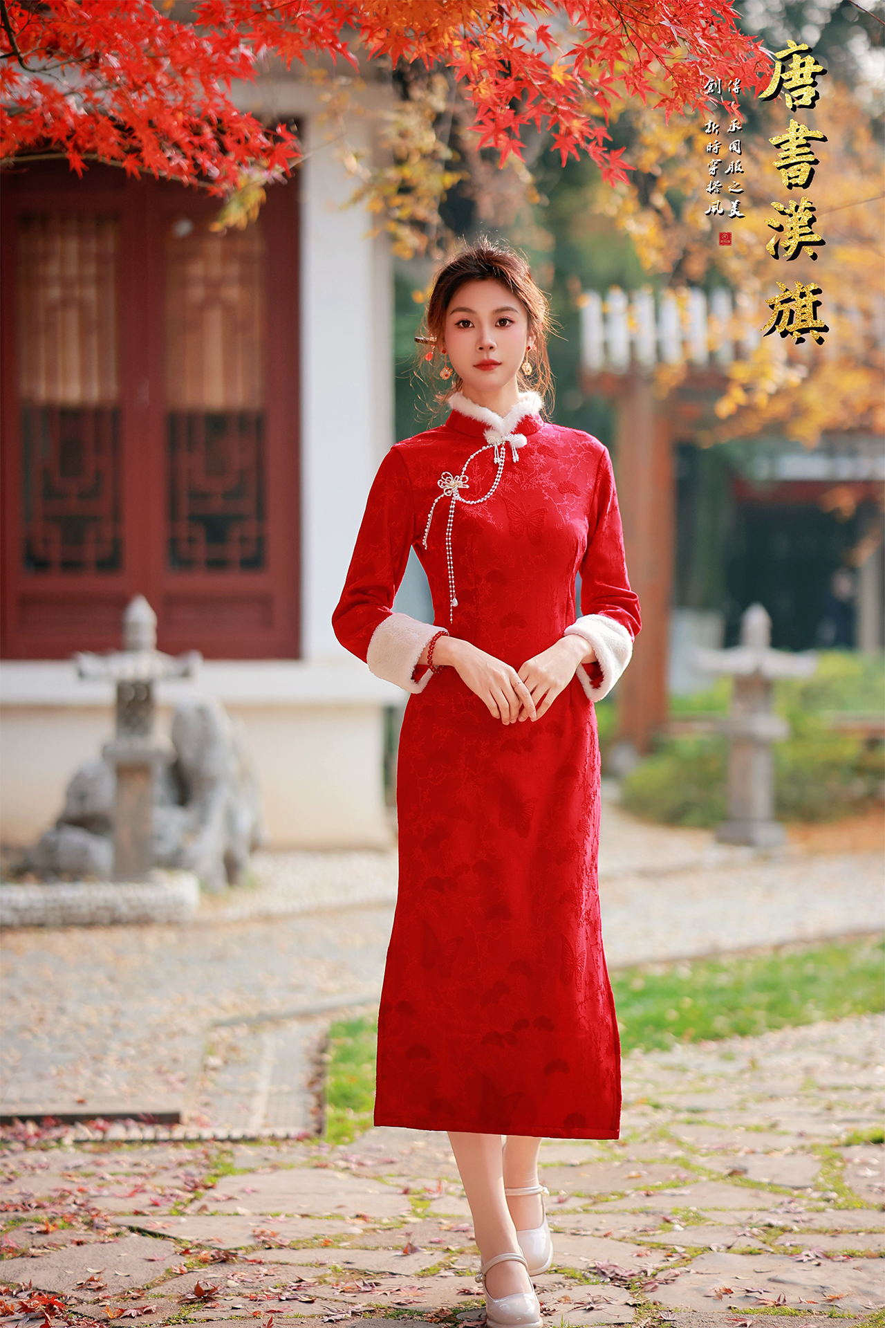 【岁宴朱华】新年红冬季加绒改良旗袍,正红提花面料搭配柔糯毛绒镶边,自带节日氛围感小立领配珍珠链条装饰,盘扣点缀尽显东方雅致;修身剪裁贴合身形