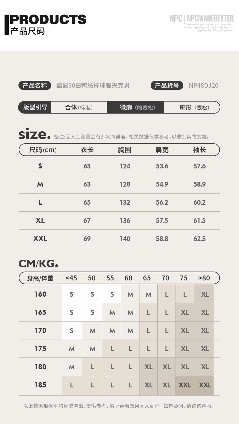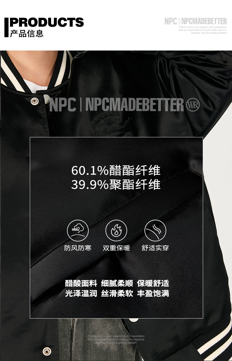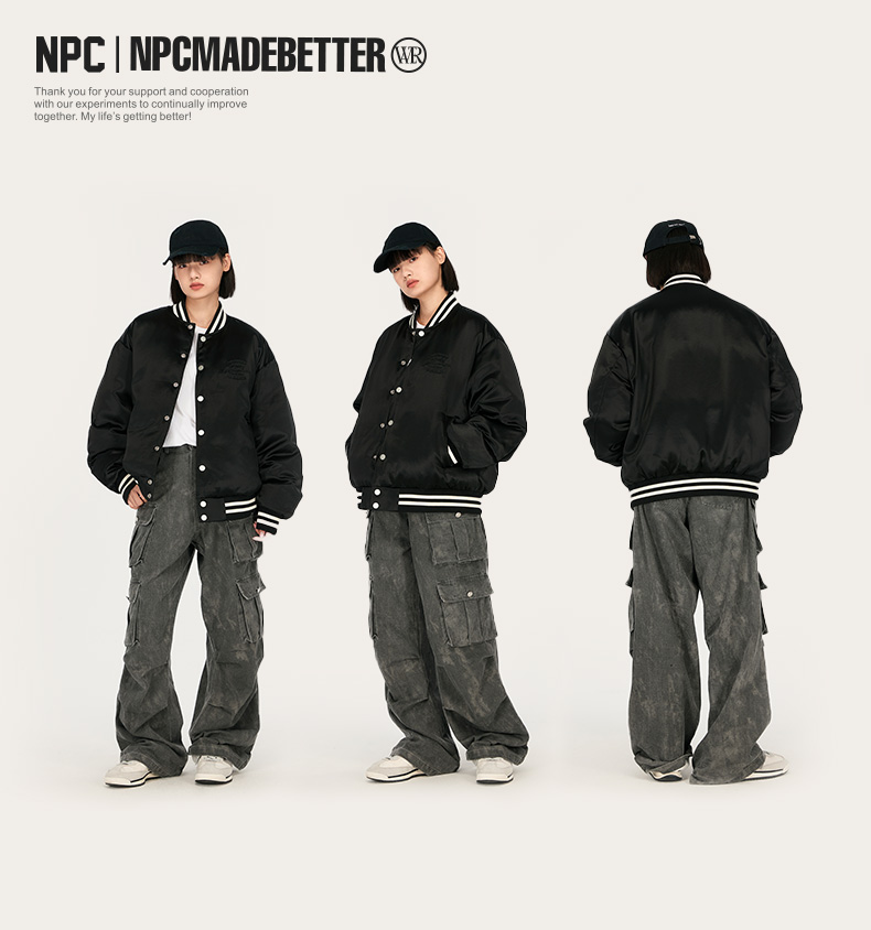 NPC潮牌醋酸90白鸭绒字母刺绣棒球服羽绒服男夹克立领新NP48DJ20