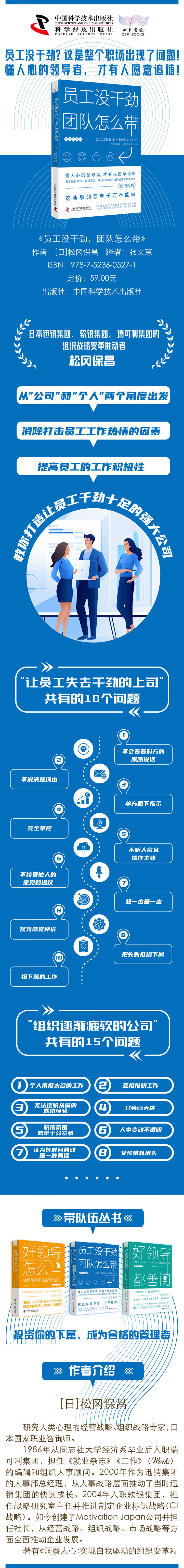 《员工没干劲,团队怎么带》独辟蹊径,以“让员工失去干劲的上司”的10个问题以及“组织逐渐疲软的公司”的15个问题为反面教材,聚焦领导者“不能做的事情”,并提供易于操作的改善对策。本书还包含了适合所有管理人员学习的心理学知识,以及在现实中灵活运用这些知识的方法,介绍了心理安全感、黑箱化、习得性无助感、自我效能感、幸福四要素、生涯彩虹图等关键词。希望领导者不要忽视职场中那些影响员工干劲的问题,懂得审视公司的文化和职场环境;希望领导者和员工能够通过交流,在建立信赖关系的基础上开展工作。