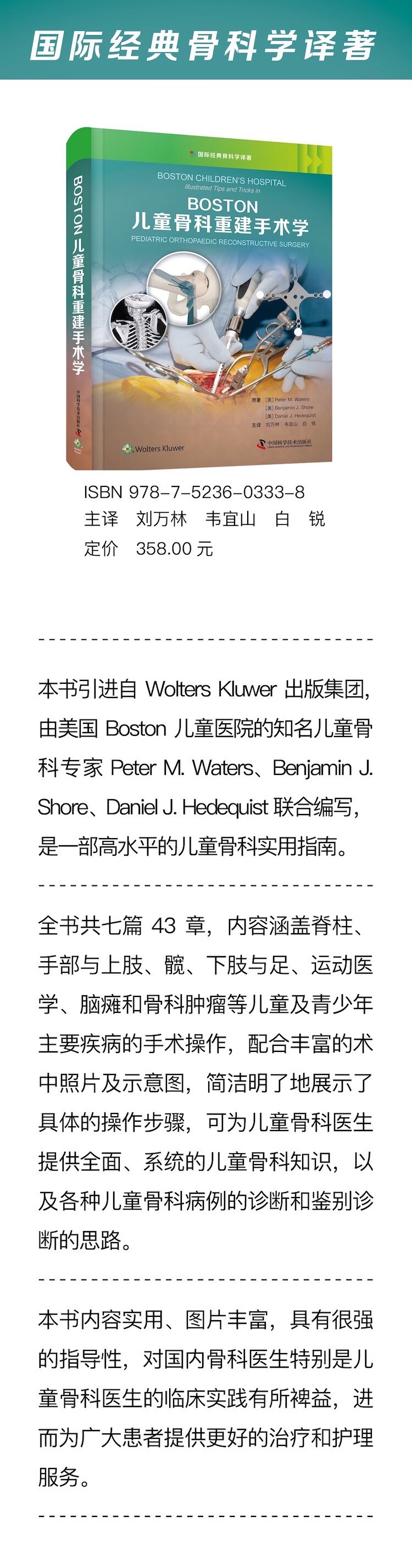 本书引进自Wolters Kluwer出版集团,由美国Boston儿童医院的知名儿童骨科专家Peter M.Waters、Benjamin J. Shore、Daniel J.Hedequist联合编写,是一部高水平的儿童骨科实用指南。全书共七篇43章,内容涵盖脊柱、手与上肢、髋、下肢与足、运动医学、脑瘫和骨肿瘤等儿童及青少年主要疾病的手术操作,配合丰富的术中照片及示意图,简洁明了地展示了具体的操作步骤,可为儿童骨科医生提供全面、系统的儿童骨科知识,以及各种儿童骨科病例的诊断和鉴别诊断的思路。本书内容实用、图片丰富,具有很强的指导性,对国内骨科医生特别是儿童骨科医生的临床实践有所裨益,进而为广大患者提供更好的治疗和护理服务。