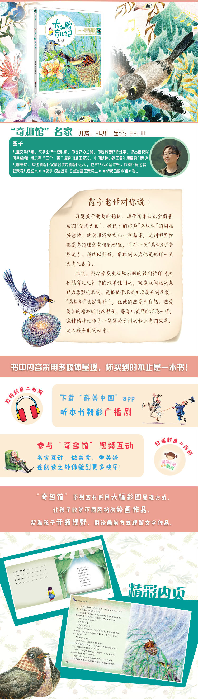 大杜鹃不养育孩子,到处托卵让其他鸟把孩子养大。这一行为让大杜鹃声名狼藉,众鸟避而不及。屡次寄卵未果的装装,选中了有着美丽歌喉的苇莺鸣姐的家。到底大杜鹃装装能否寄卵成功,孩子能否顺利出壳? 残酷的现实却蕴含着深刻的道理:大自然中的鸟类世界生存有道,繁衍生息是自然的规律。 人称的视角,精彩跌宕的内容穿插着朴素科学知识和人性之纯真,温情感动地讲述了一个大杜鹃妈妈艰辛的寄子育儿的故事。