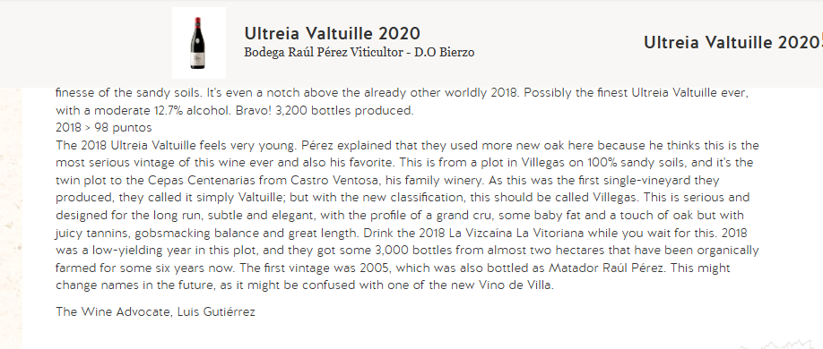 “2020年的Valtuille令人惊叹,尤其是在与不寻常的2019年份相比,这款酒花香富有表现力,清新平衡,具有惊人的优雅,很多精确度,并在橡木桶中熟成5个月,然后在1000升的大橡木桶中陈酿。细腻的单宁彰显沙质土壤的细腻,甚至比超凡的2018年份高出一筹,这可能是有史以来蕞出色的Valtuille,仅生产3200瓶。”