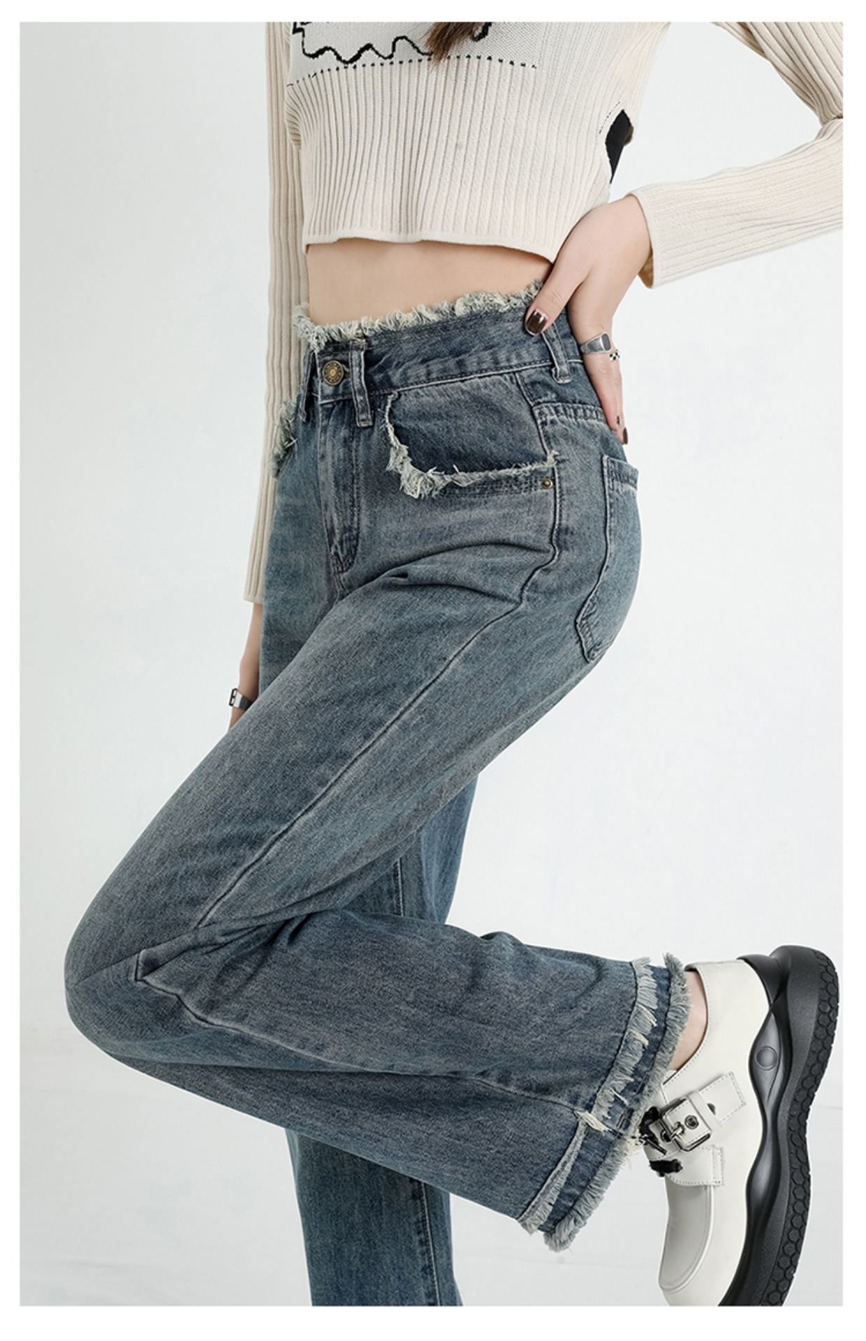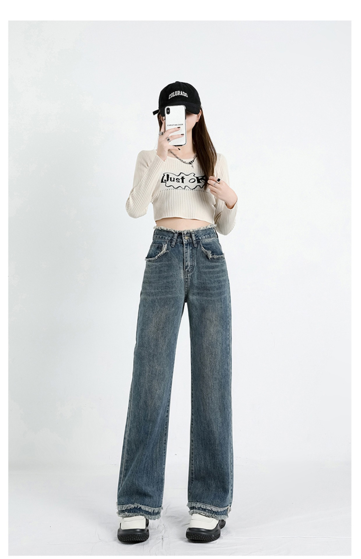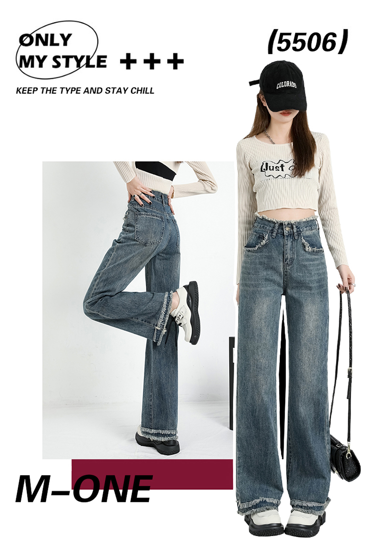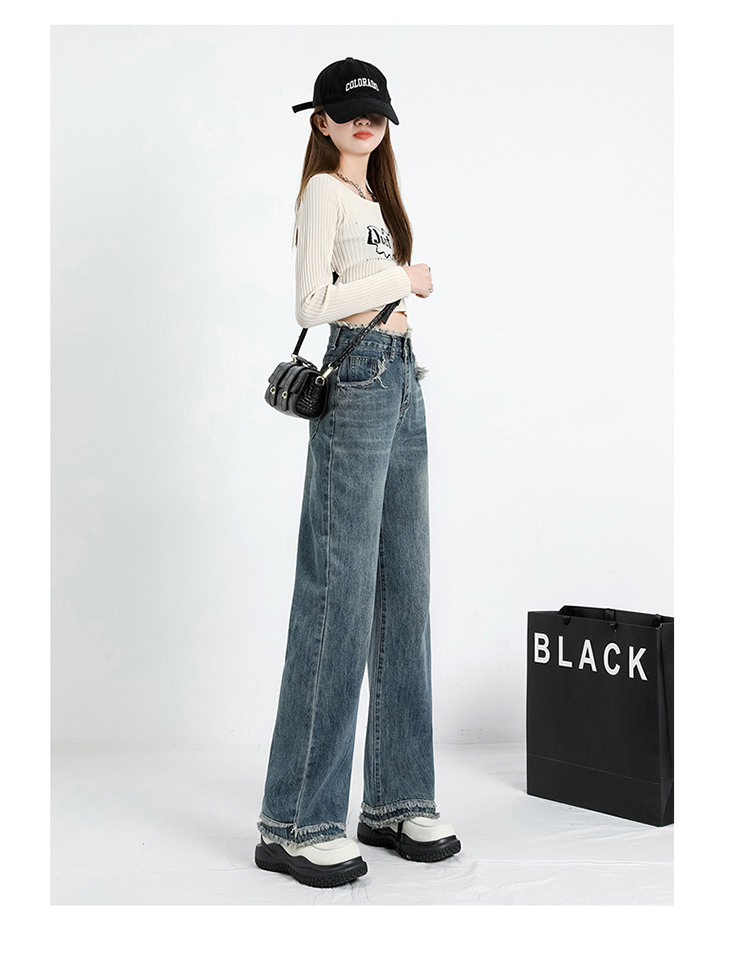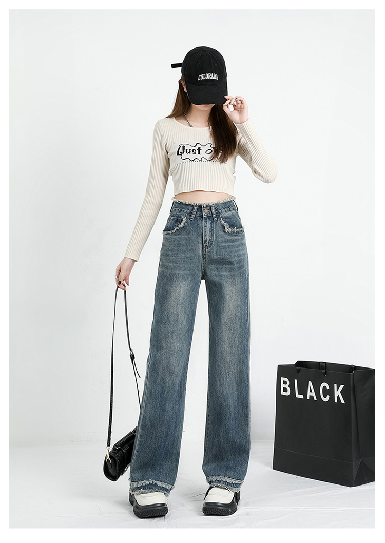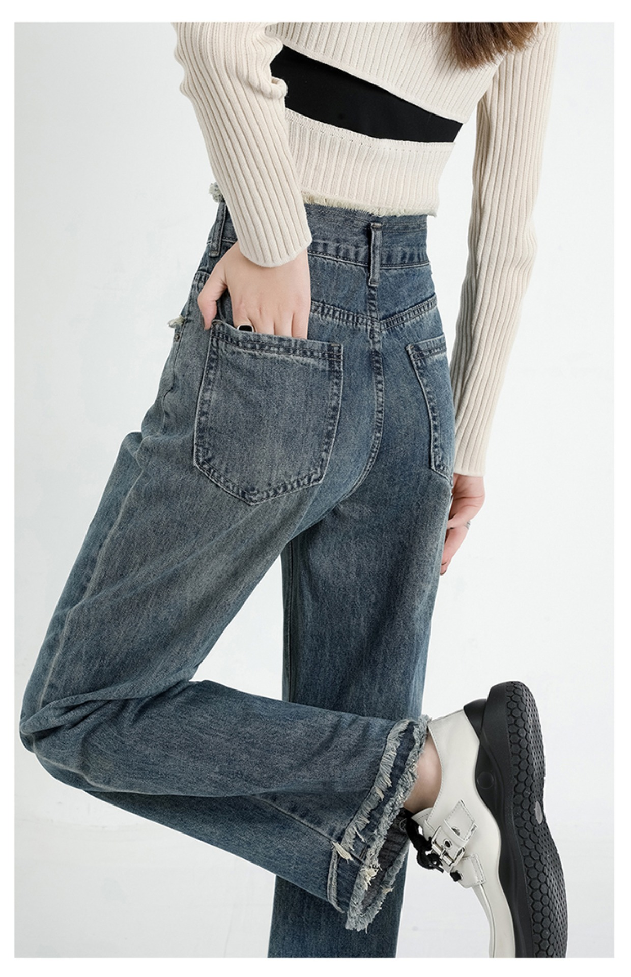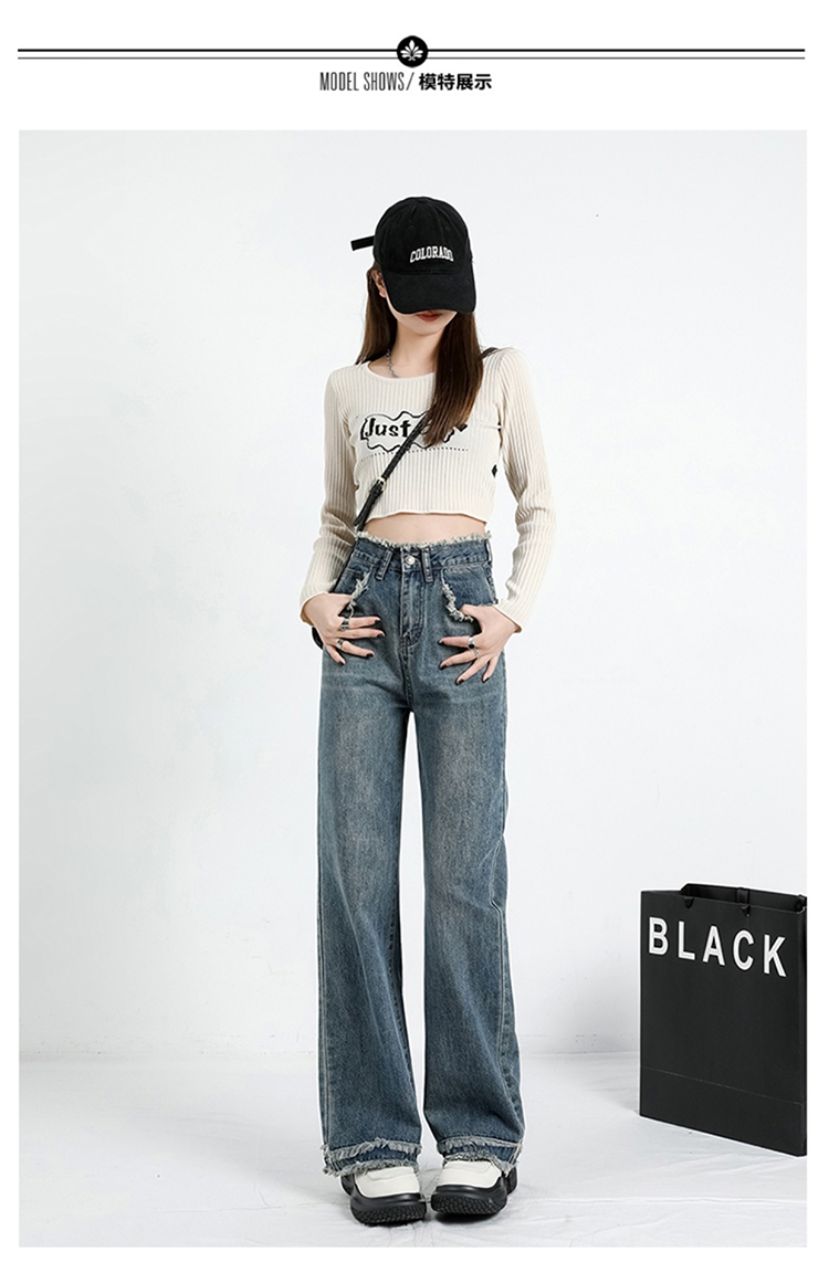 【复古烟管直筒牛仔裤】春秋款翻边高腰设计女 直筒宽松版型 显瘦显高牛仔长裤