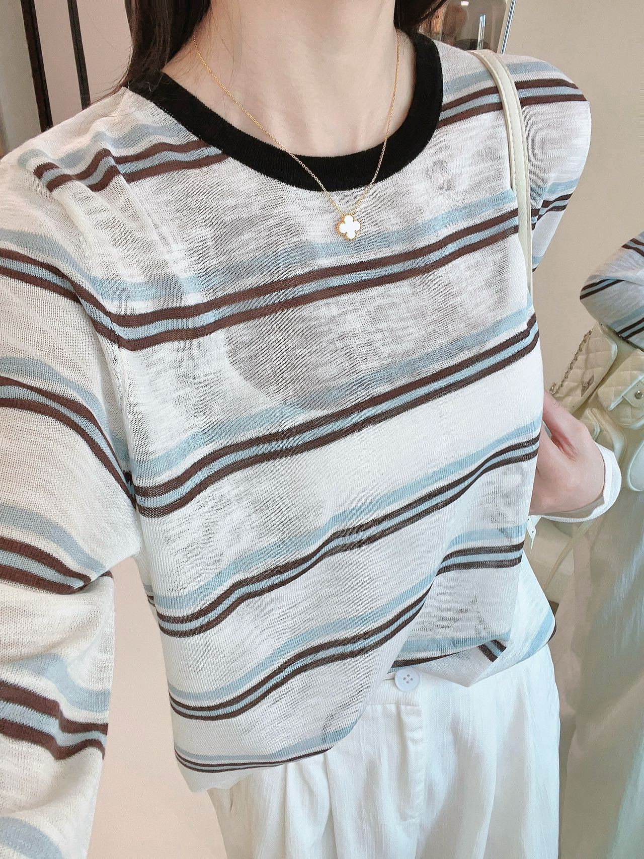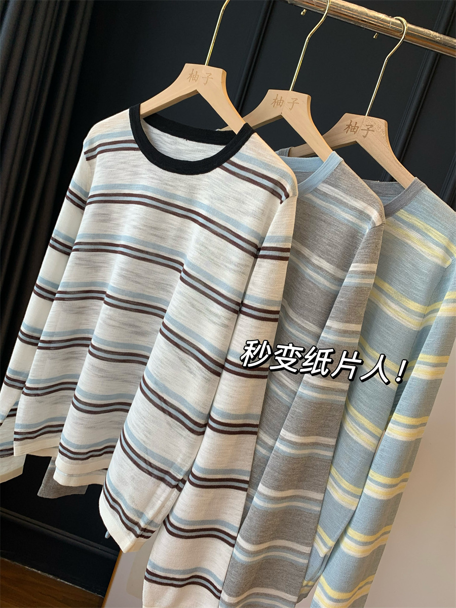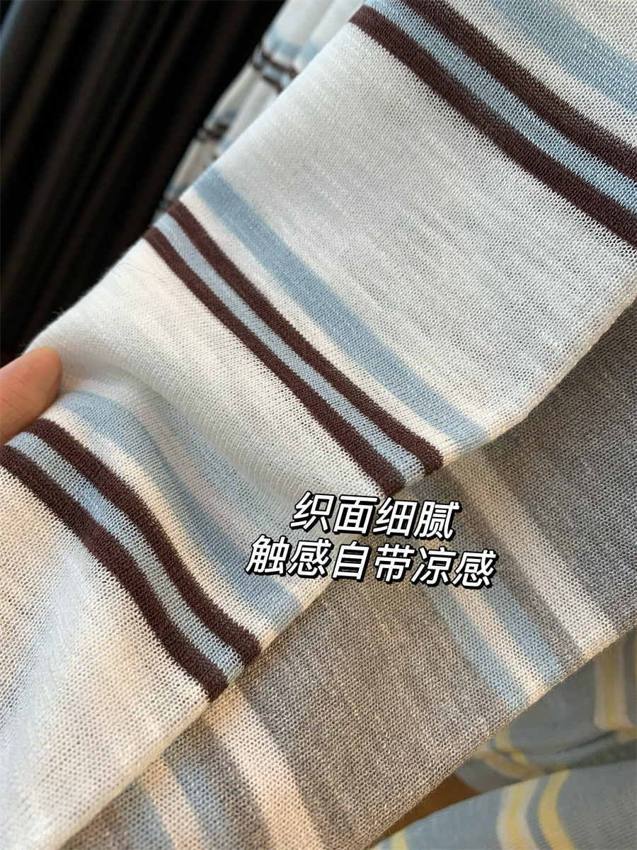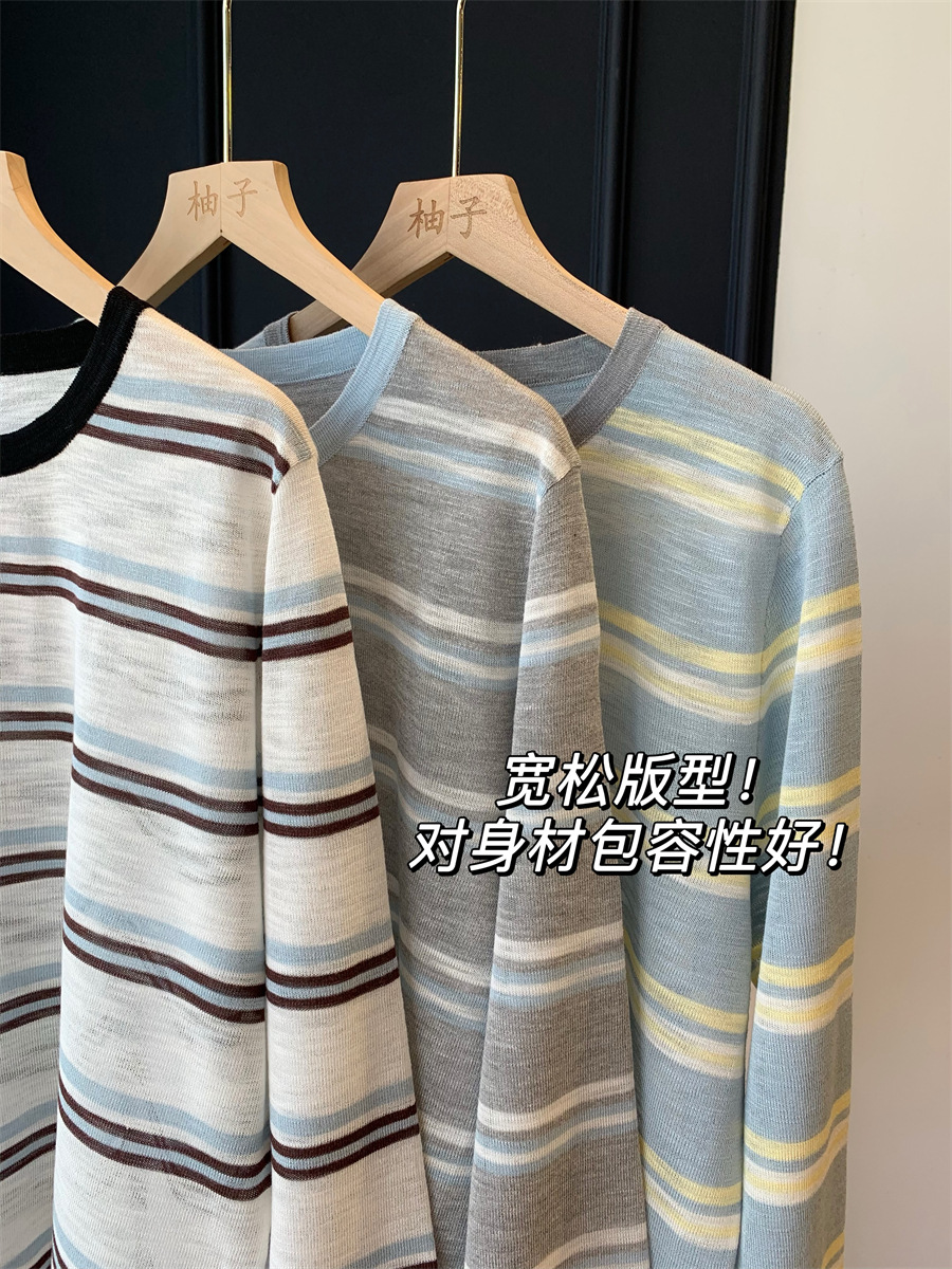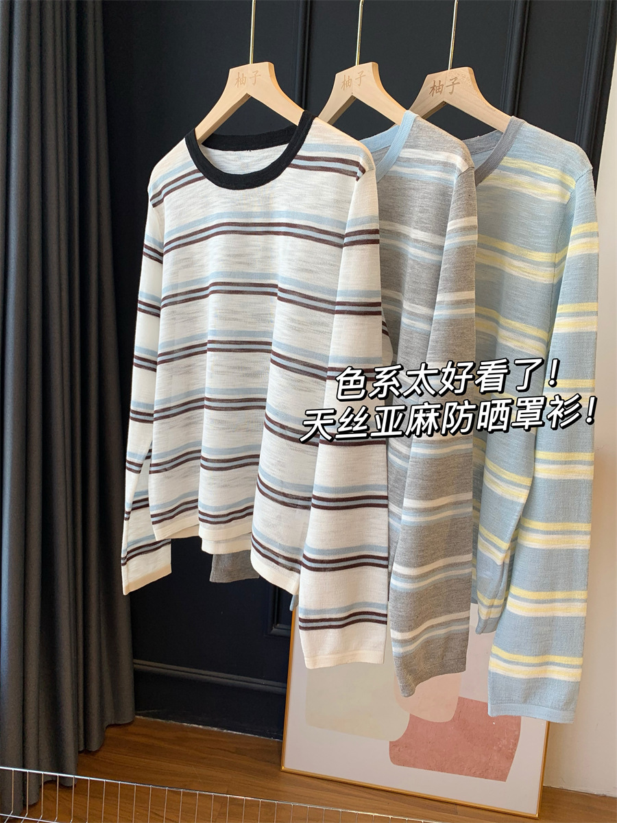 复古低饱和度的一系列配色撞色条纹长袖防晒罩衫