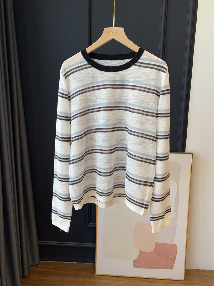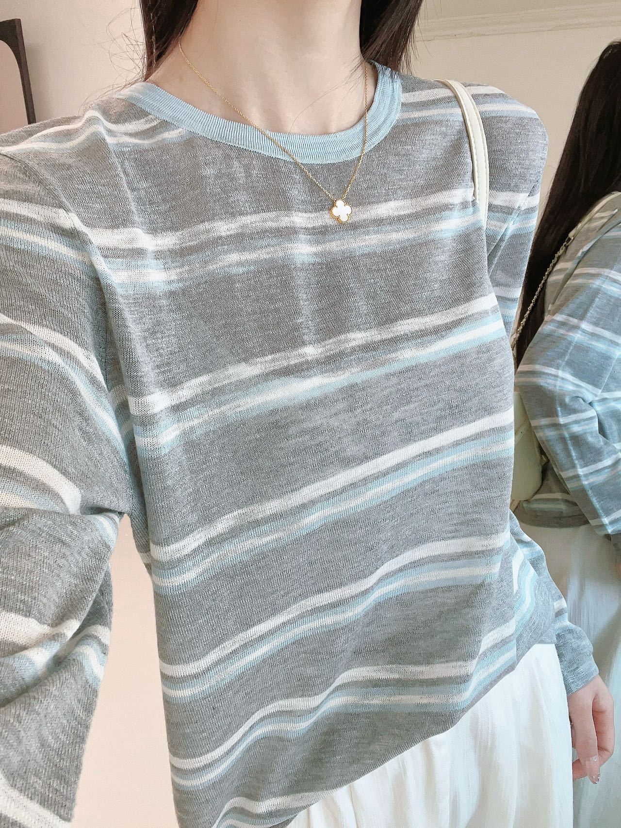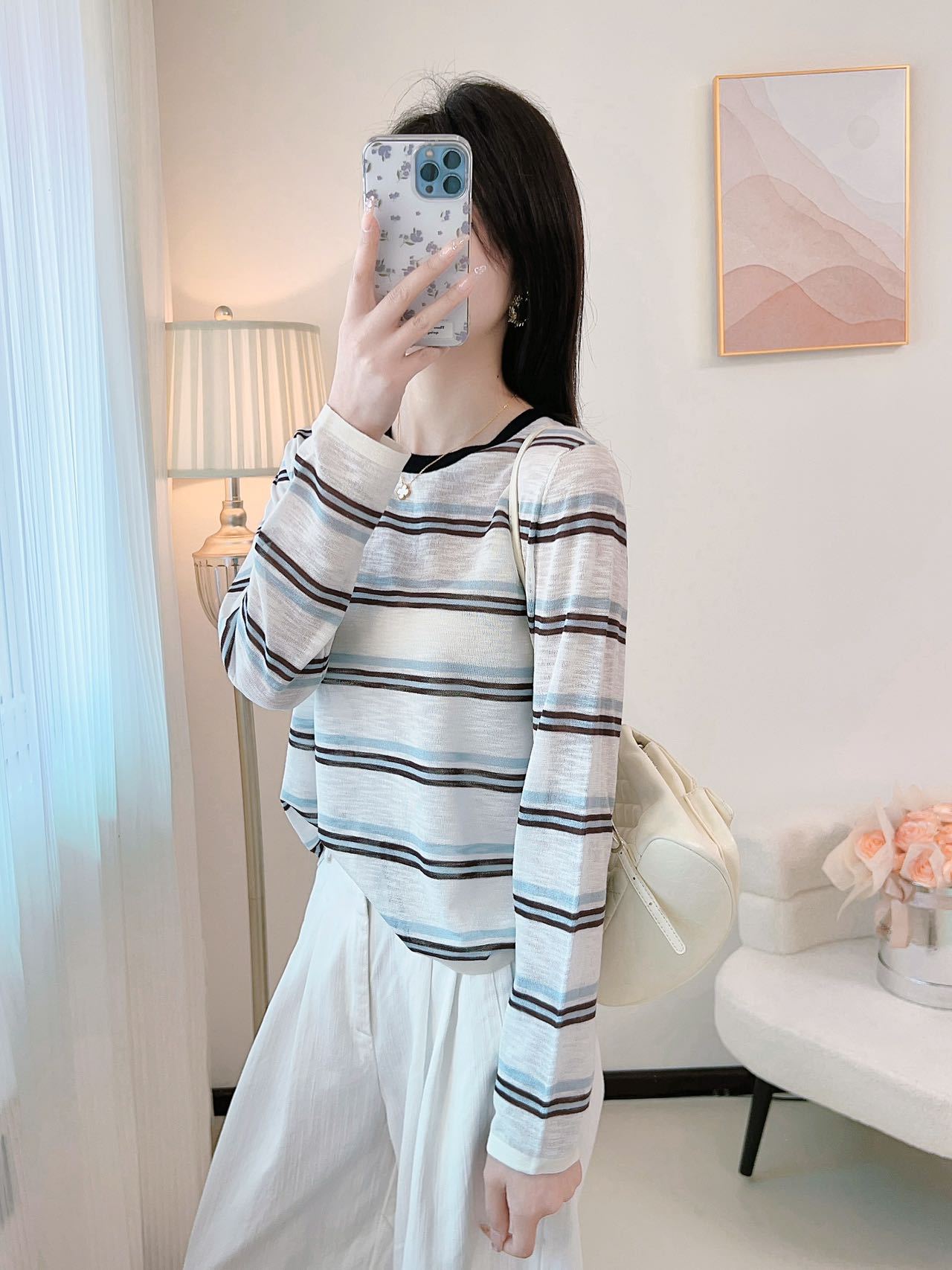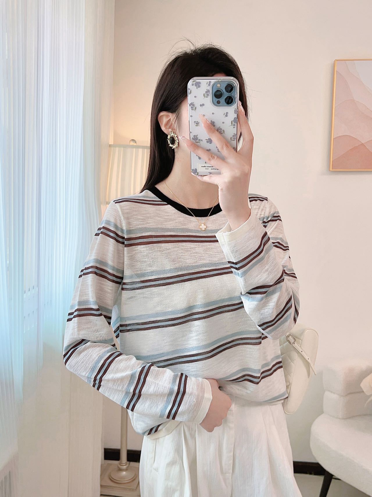 复古低饱和度的一系列配色撞色条纹长袖防晒罩衫
