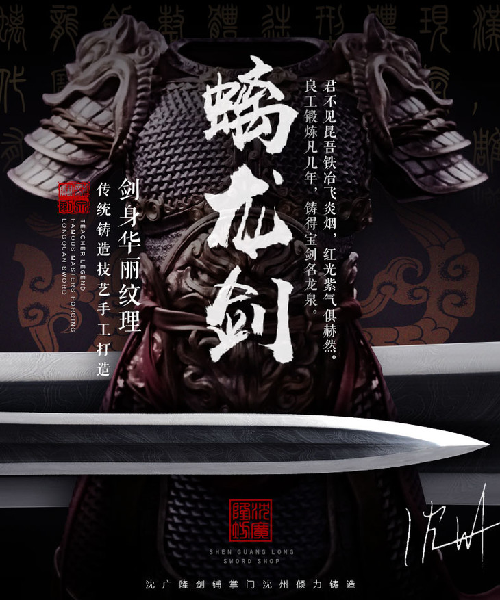- 相传春秋末期,越国铸剑师欧冶子在龙泉秦溪山铸成龙渊、泰阿、工布三把名剑。并以龙渊为乡名。后因避唐高祖李渊讳,改称龙泉。唐乾元二年设龙泉县。从此,龙泉就成为剑的宝名,誉满天下。沈广隆剑铺位于浙江省龙泉市