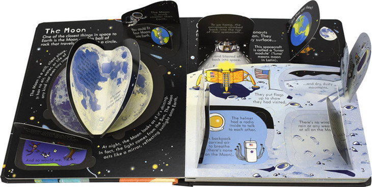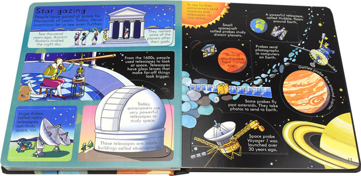 This is a great fun flap book packed with interesting information about space, and the amazing things that float through it - stars, moons, comets, and the planets of our solar system. Each double-page spread has a stunning colour illustration, and several flaps to lift to find out more about what's going on in the scene - such as what goes inside the International Space Station, how astronauts visited the Moon and what they did there, as well as the history of astronomy, from Galileo to the Hubble Space Telescope.