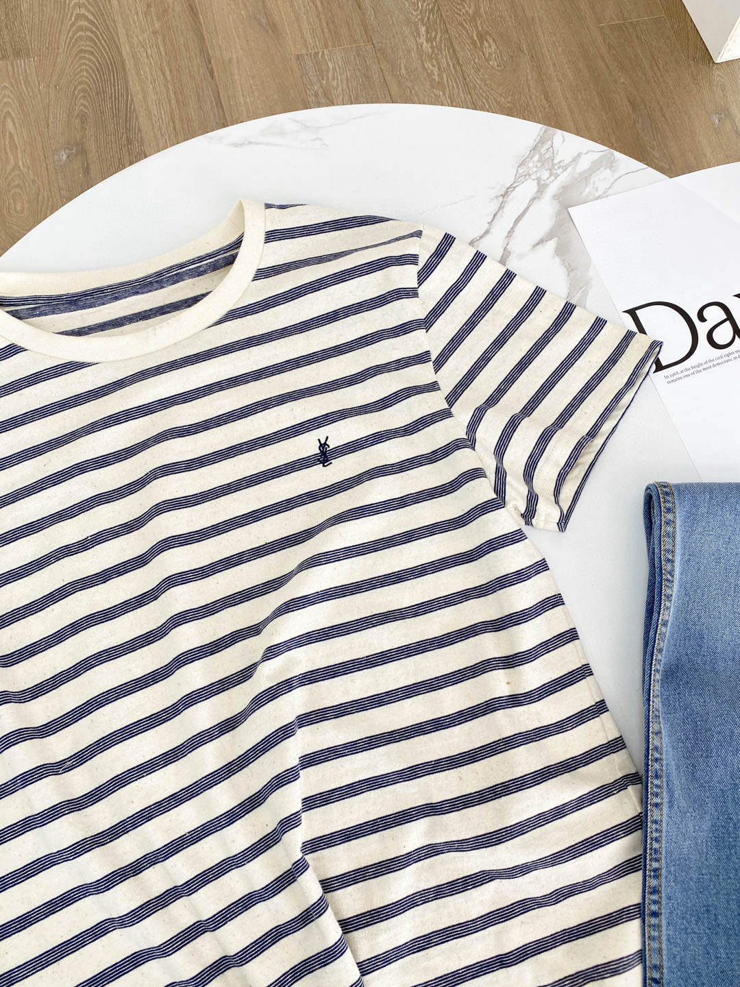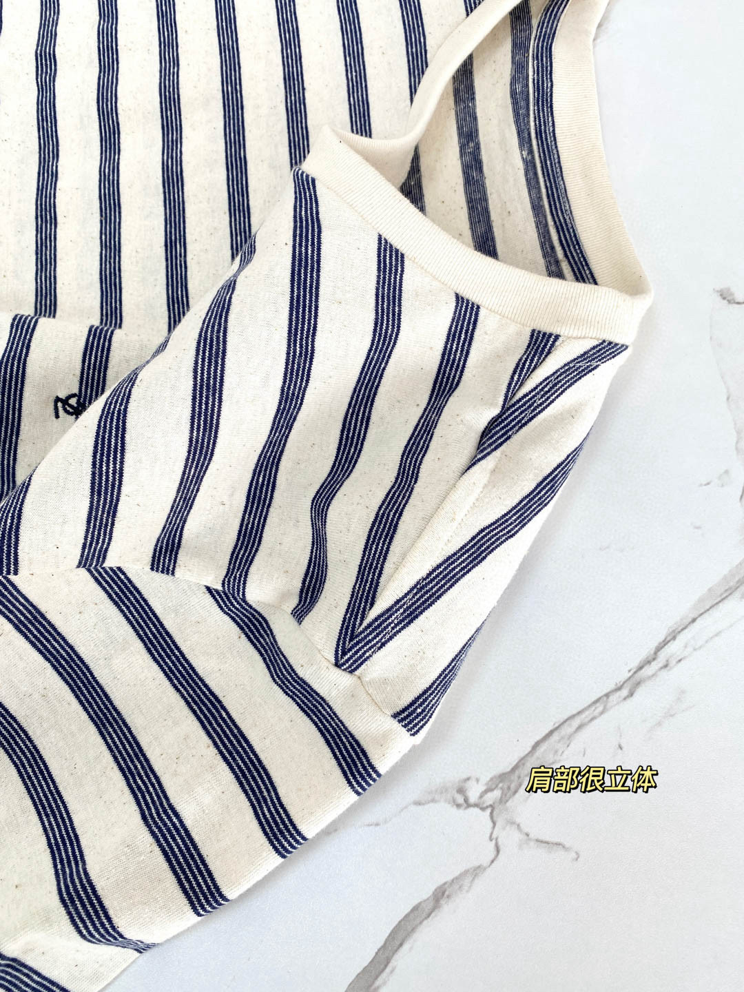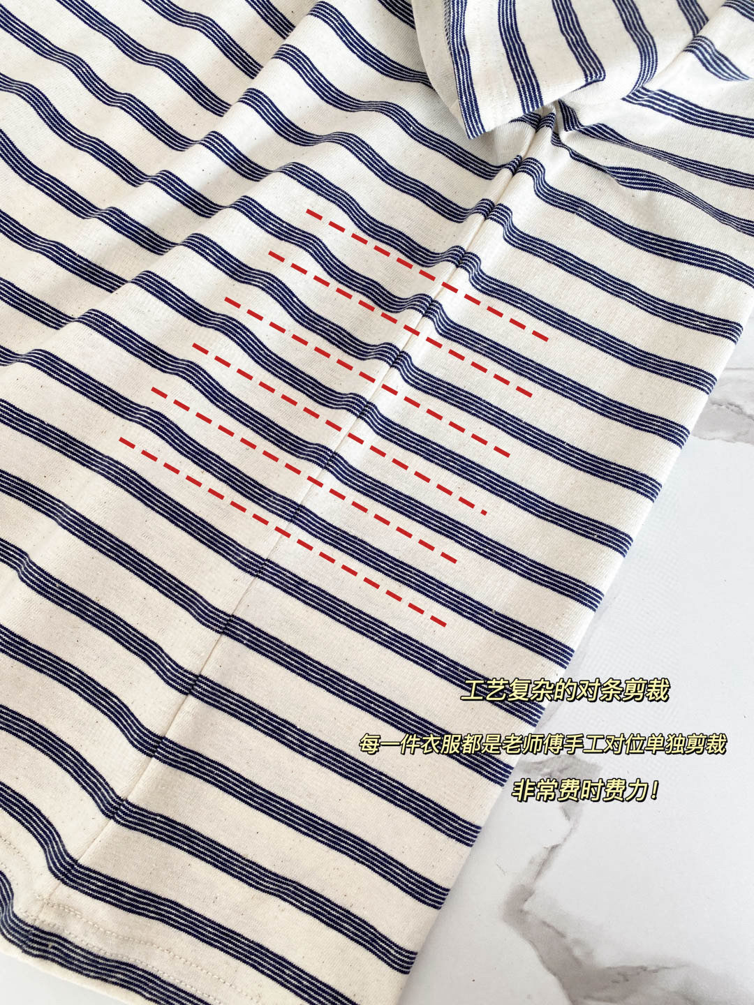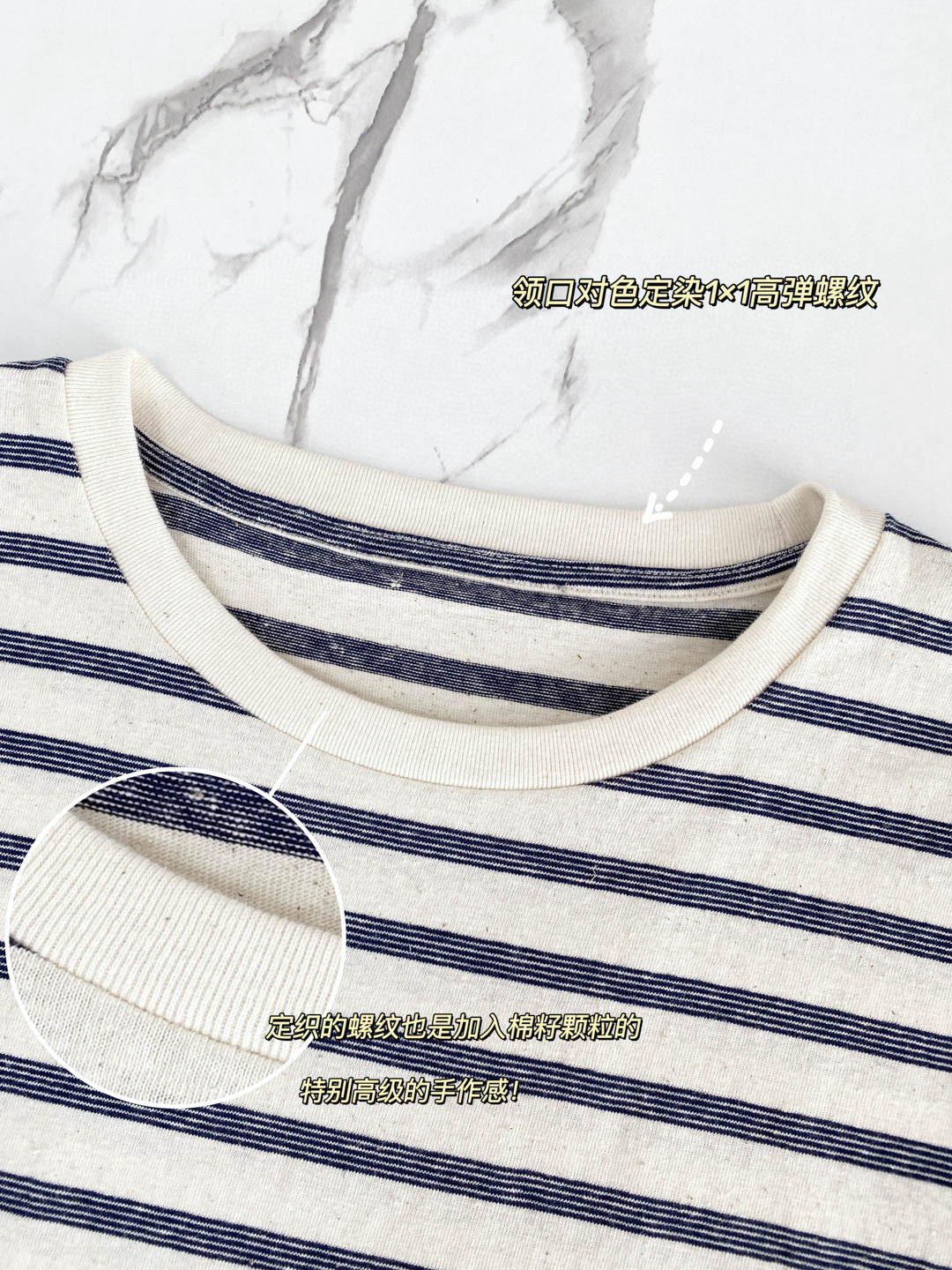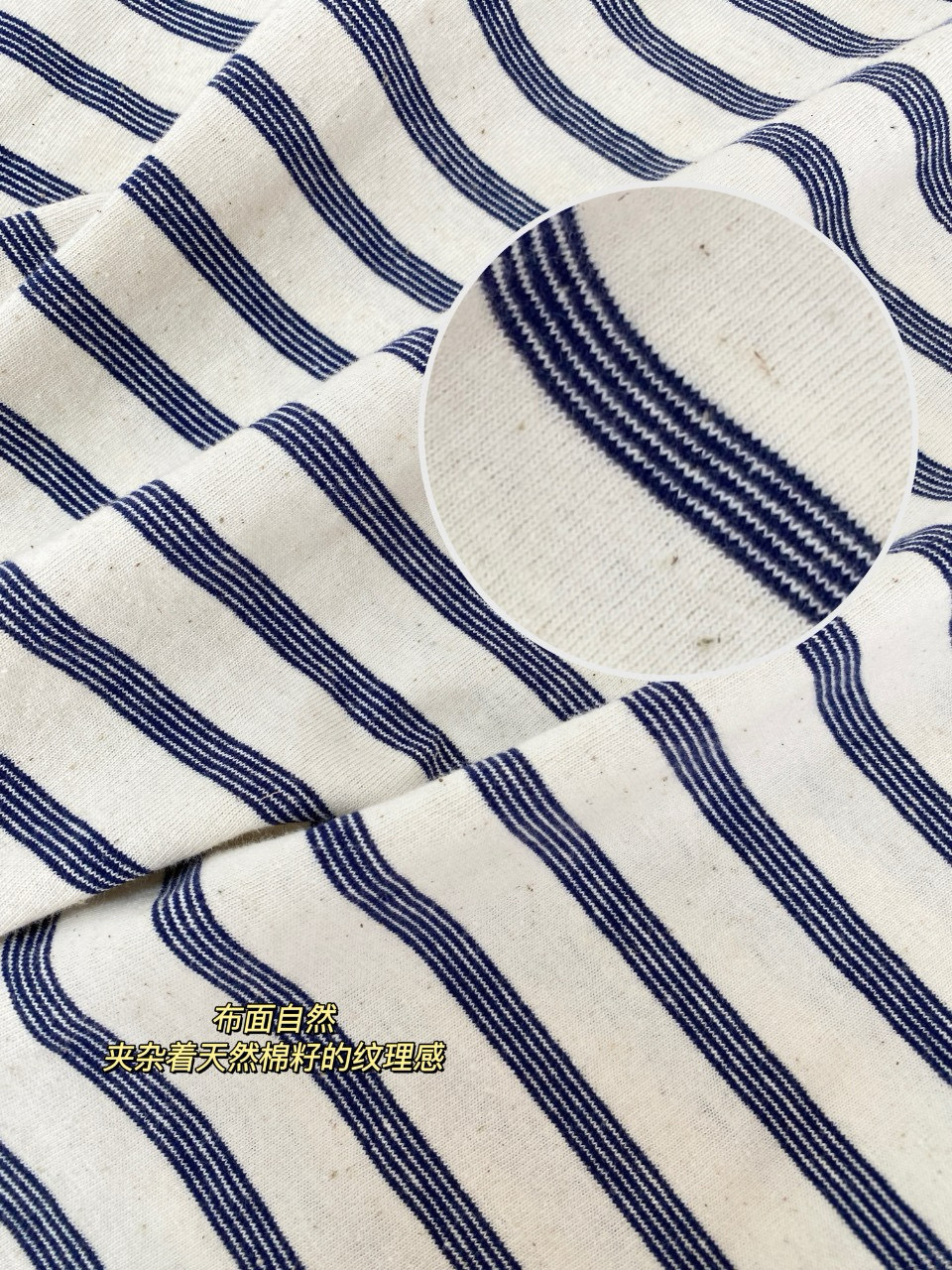 颜色也是那种本质棉麻的自然原胚色,天然未经染色哦,交织的藏青色条纹经德国进口5针机器单边格织针法形成间色效果。